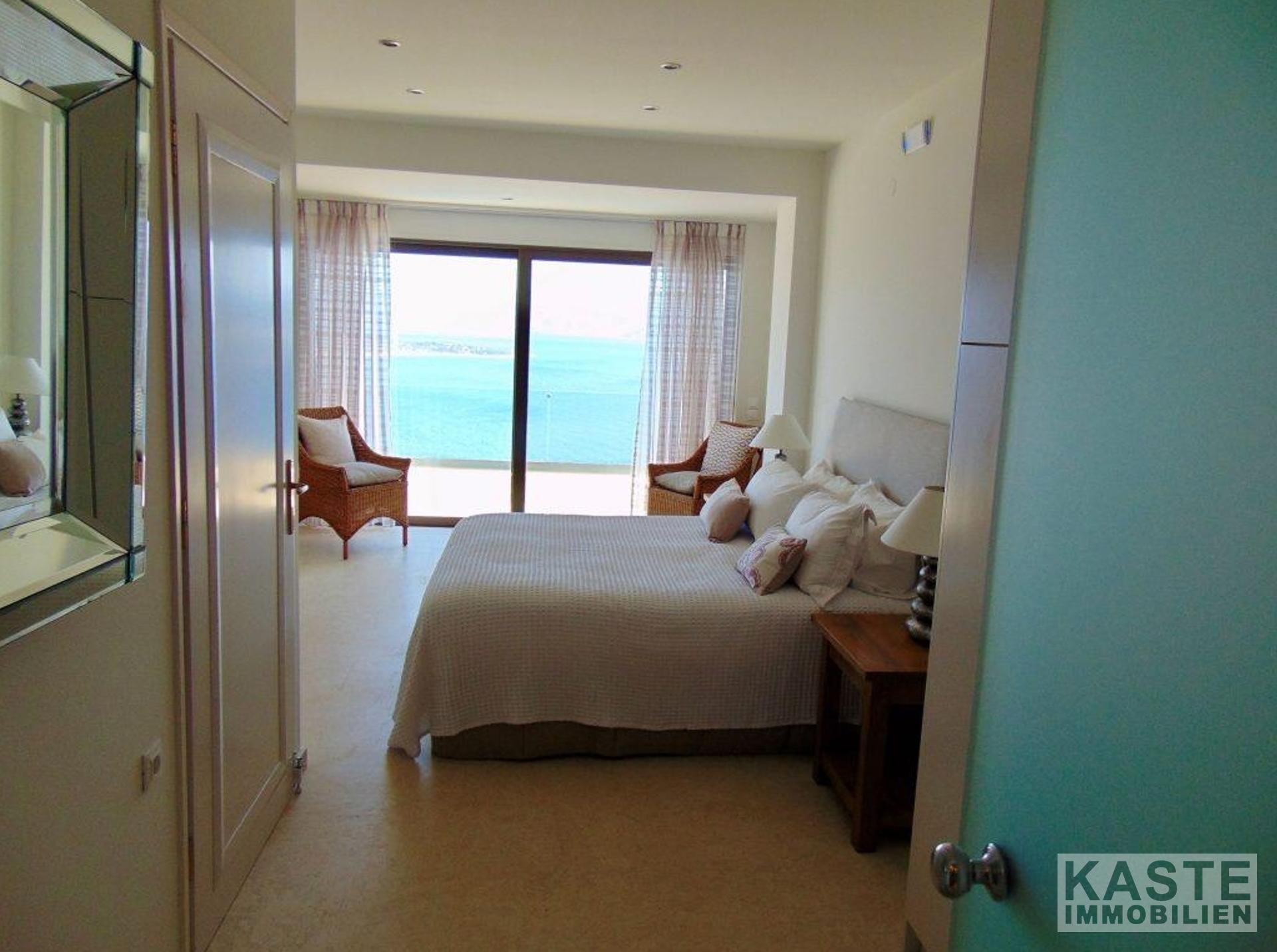 Im unteren Stockwerk befinden sich zwei luxuriöse Schlafzimmer, jeweils mit eigenem Bad und Zugang zu Balkonen, von denen Sie ebenfalls verzaubernde Ausblicke auf die Landschaft und das Meer genießen. Hinzu kommt ein großzügiges Homeoffice mit angrenzender Garderobe, das sich ideal als Arbeits- oder Rückzugsraum anbietet und bei Bedarf als drittes Schlafzimmer fungieren kann.