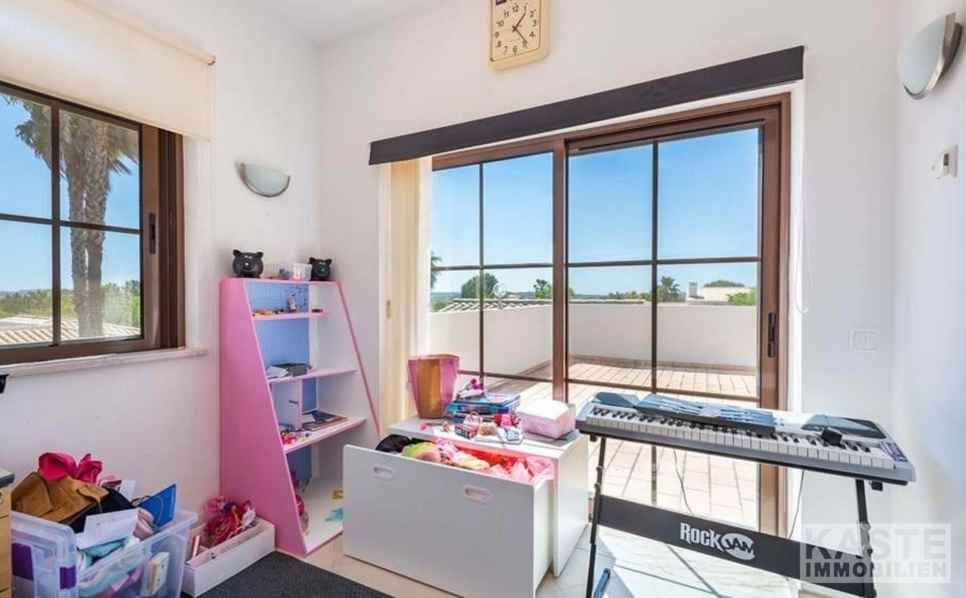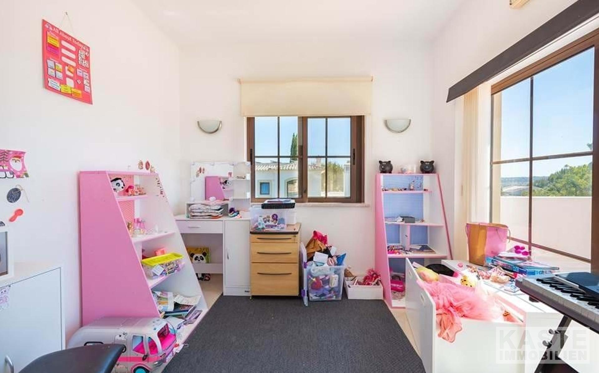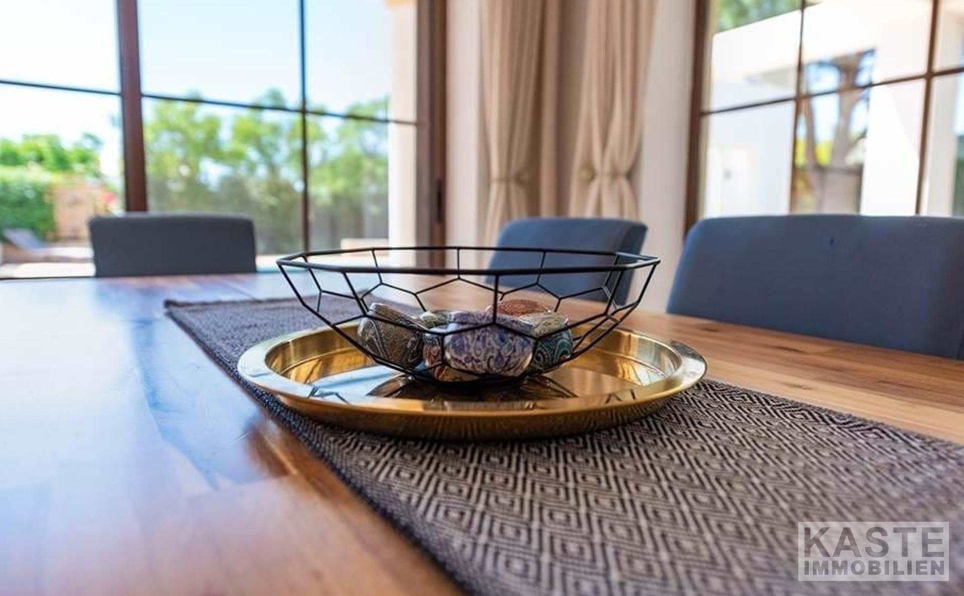 Obergeschoss mit Panoramablick Im oberen Stockwerk befindet sich das geräumige Hauptschlafzimmer mit einem luxuriösen Bad en suite und Zugang zu einer kleinen, privaten Terrasse, die einen herrlichen Blick auf die umliegende Landschaft bietet. Ein zusätzliches Zimmer, das derzeit als Spielzimmer genutzt wird, kann flexibel als Büro oder Studio eingerichtet werden. Die großzügige Dachterrasse, zugänglich über das Gästezimmer, lädt mit ihrem weiten Blick auf die lokale Flora zum Verweilen ein.