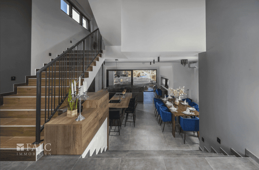Im Erdgeschoss empfängt ein großzügiger Flur die Bewohner und Gäste. Neben einem modernen Badezimmer befinden sich hier eine hochwertige Küche mit Essbereich sowie ein lichtdurchflutetes Wohnzimmer mit direktem Zugang zur Terrasse und zum Poolbereich. Ergänzt wird diese Ebene durch einen Technikraum sowie den direkten Zugang zur Garage. Die offene Gestaltung schafft ein angenehmes Wohngefühl und verbindet Innen- und Außenbereiche harmonisch miteinander.