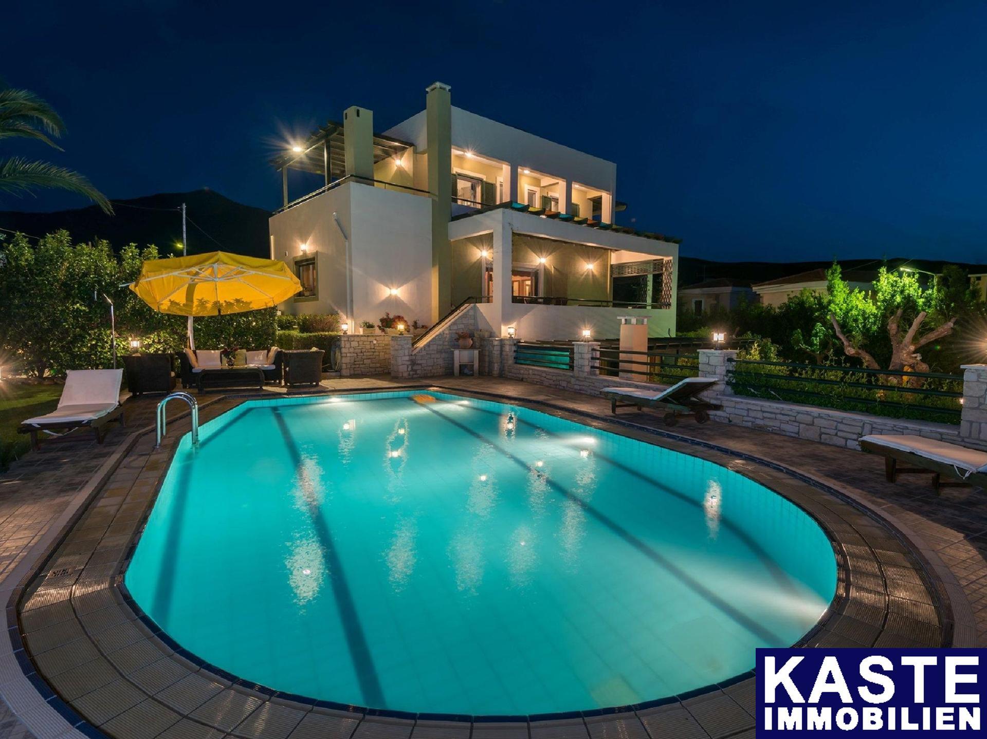 Das Hauptgebäude erstreckt sich über zwei Etagen, die komfortabel durch eine Innentreppe verbunden sind. Im Erdgeschoss empfängt Sie eine offene, helle Küche, großzügig gestaltet und eingebettet in ein Wohn- und Esszimmer mit Kamin – hier trifft moderne Eleganz auf Gemütlichkeit. Vier geräumige Schlafzimmer, jeweils mit eigenem Bad, bieten privaten Rückzugsraum und Komfort auf höchstem Niveau. Vom Balkon im ersten Stock eröffnet sich ein atemberaubender Blick auf die umliegende Landschaft und das malerische kretische Meer, der dieser Villa ihren besonderen Flair verleiht.