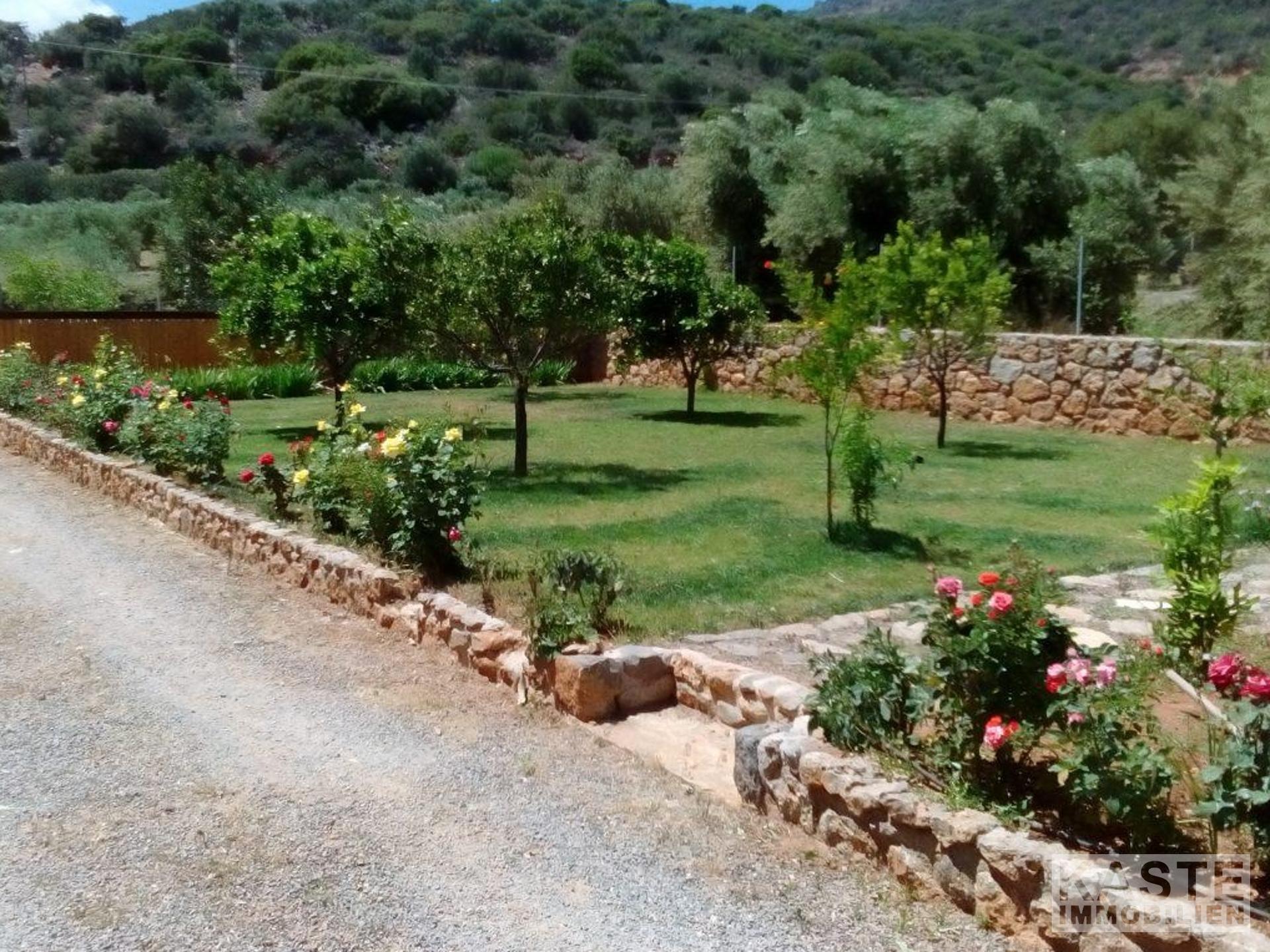 Im Außenbereich des Anwesens erwartet Sie eine Einfahrt mit Toren sowie charakteristische Steinmauern an der Außenfassade. Großzügige Terrassen und gepflegte Gärten umgeben das Haus, die eine harmonische Kombination aus Blumen – vor allem Rosen –, Kakteen und Obstbäumen bieten. Auf der hinteren Seite des Grundstücks erstreckt sich ein reizvoller Olivenhain mit etwa 40 Bäumen.