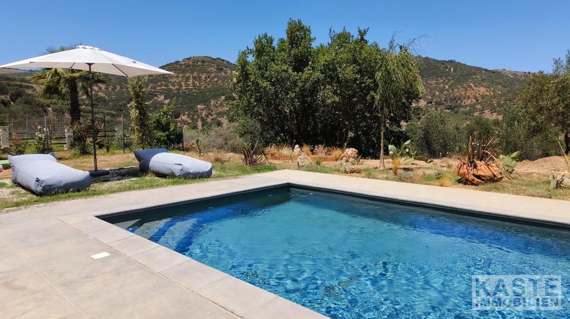 Der 2.800 m² große Außenbereich überzeugt mit einem privaten Swimmingpool, einer sonnigen Liegewiese und einem überdachten Essbereich mit Grill und Pergola – perfekt für gesellige Abende mit Familie und Freunden.