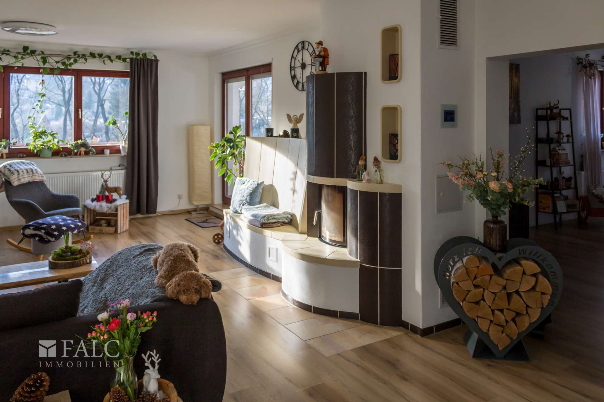 Im 1. OG gelangen Sie durch eine Zwischentür in den Wohnbereich, gegenüber ist der Hinterausgang in den Garten, ein Gäste-WC finden Sie im Flur dazwischen. Beim Eintritt in den fast 50 m² großen Wohnbereich erleben Sie sofort die Großzügigkeit und Gemütlichkeit eines Wohnzimmers mit großen Fensterflächen, einem wunderschönen Kamin mit beheizter Sitzbank, großen Lounge-Sitzmöbeln und einem kleinen Esstisch im Erker zum Garten. Alles hier vermittelt ein angenehmes, entspanntes Wohngefühl. Wohnzimmer und Esszimmer sind mit einem offenen Durchgang verbunden, der große Esstisch bietet Platz für 8 - 10 Personen und ist der Familientreffpunkt, an dem neben den Mahlzeiten auch gearbeitet, gelernt, gespielt und vielfältigen Hobbies nachgegangen werden kann. Ein weiteres Highlight ist die große, umlaufende Terrasse, auf die man vom Wohnzimmer aus gelangt und die Platz für kleine und große Sitzecken bietet, für Balkonpflanzen und z.B. auch einen Whirlpool.