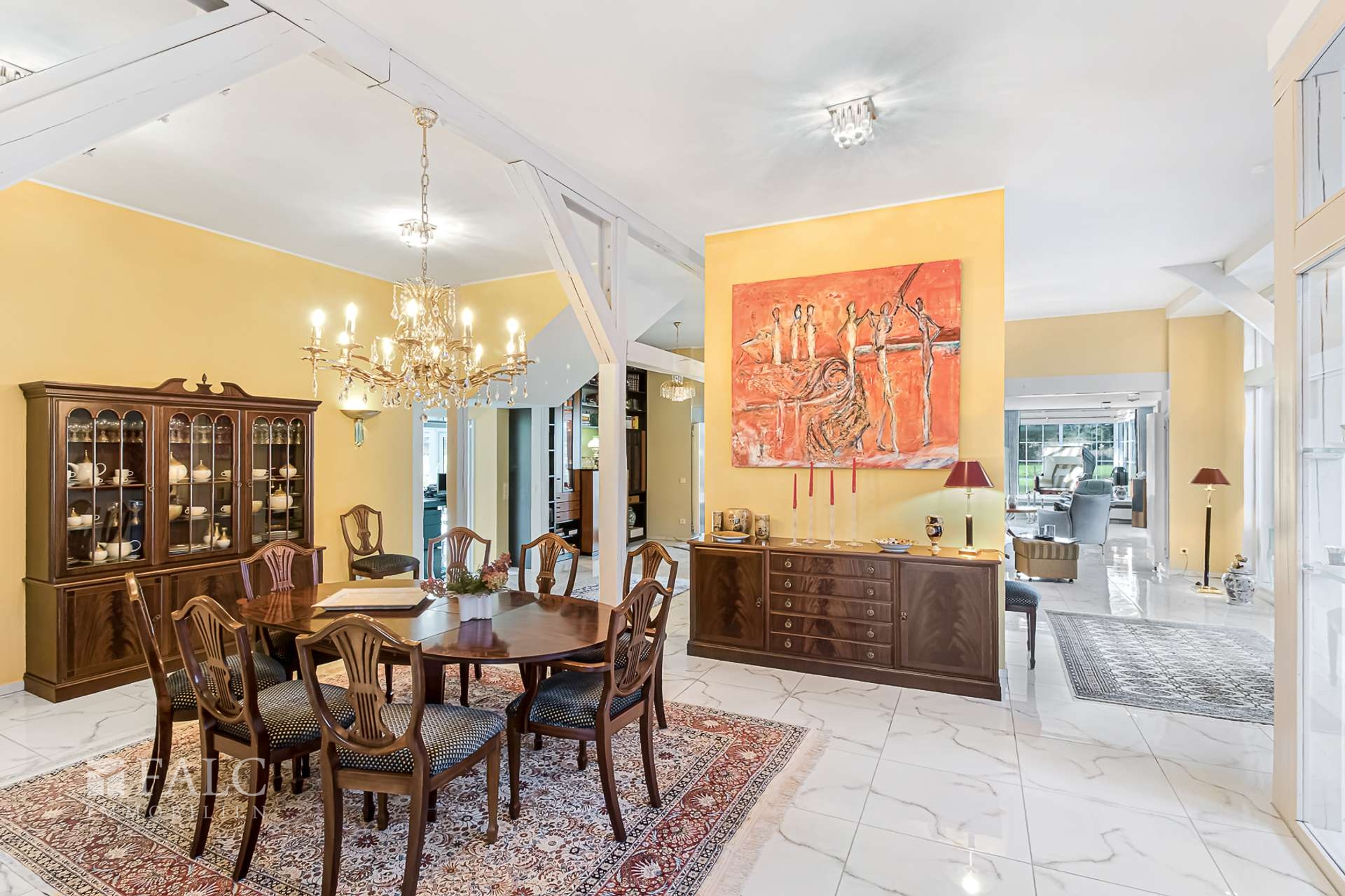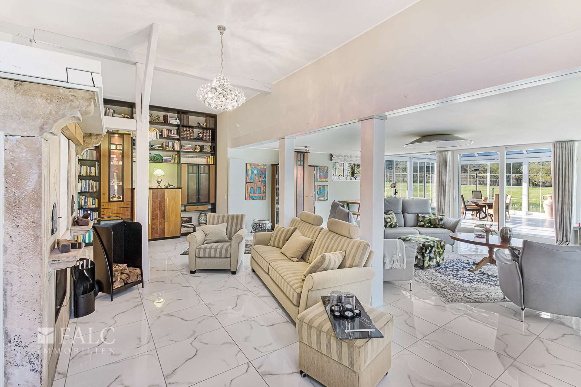 Das Herzstück des Hauses bildet das großzügige Wohnzimmer, das durch eine gemütliche Kaminecke mit einem stilvollen Kamin zum Verweilen einlädt. Angrenzend daran befindet sich ein separates, ebenso großzügiges Wohnzimmer, das zusätzlichen Raum für Entspannung und geselliges Beisammensein bietet. Der vollständig verglaste Wintergarten, der an das Hauptwohnzimmer anschließt, schafft eine lichtdurchflutete und einladende Atmosphäre, die den Innenraum optisch erweitert.