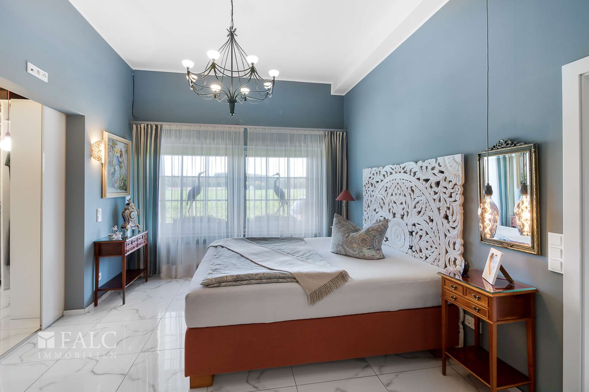 Das Schlafzimmer besticht durch eine angrenzende, großzügige Ankleide, die viel Stauraum bietet. Ergänzt wird dieser Bereich durch ein edles, luxuriös ausgestattetes Badezimmer, das durch seine hochwertige Gestaltung zum Entspannen einlädt.