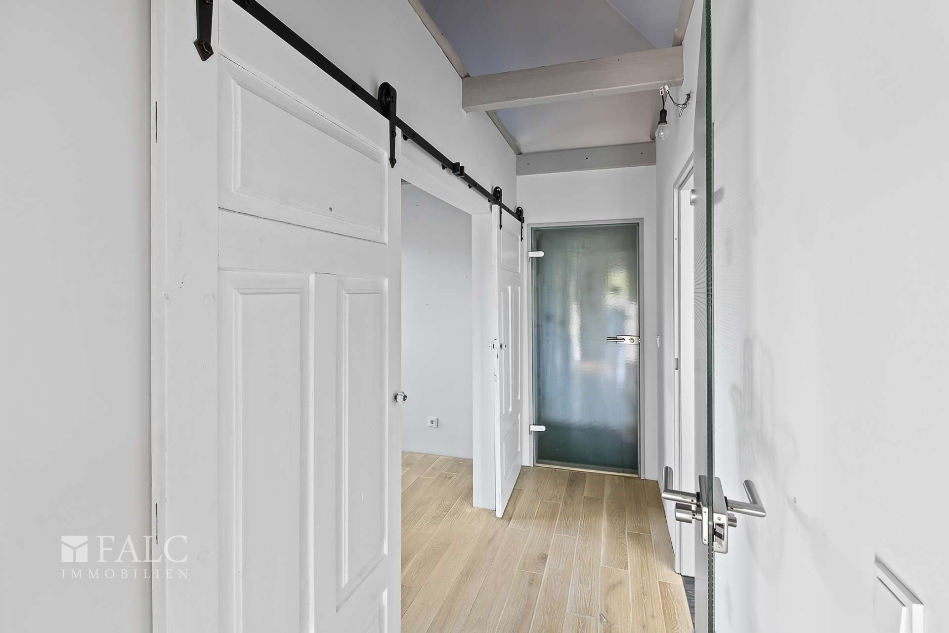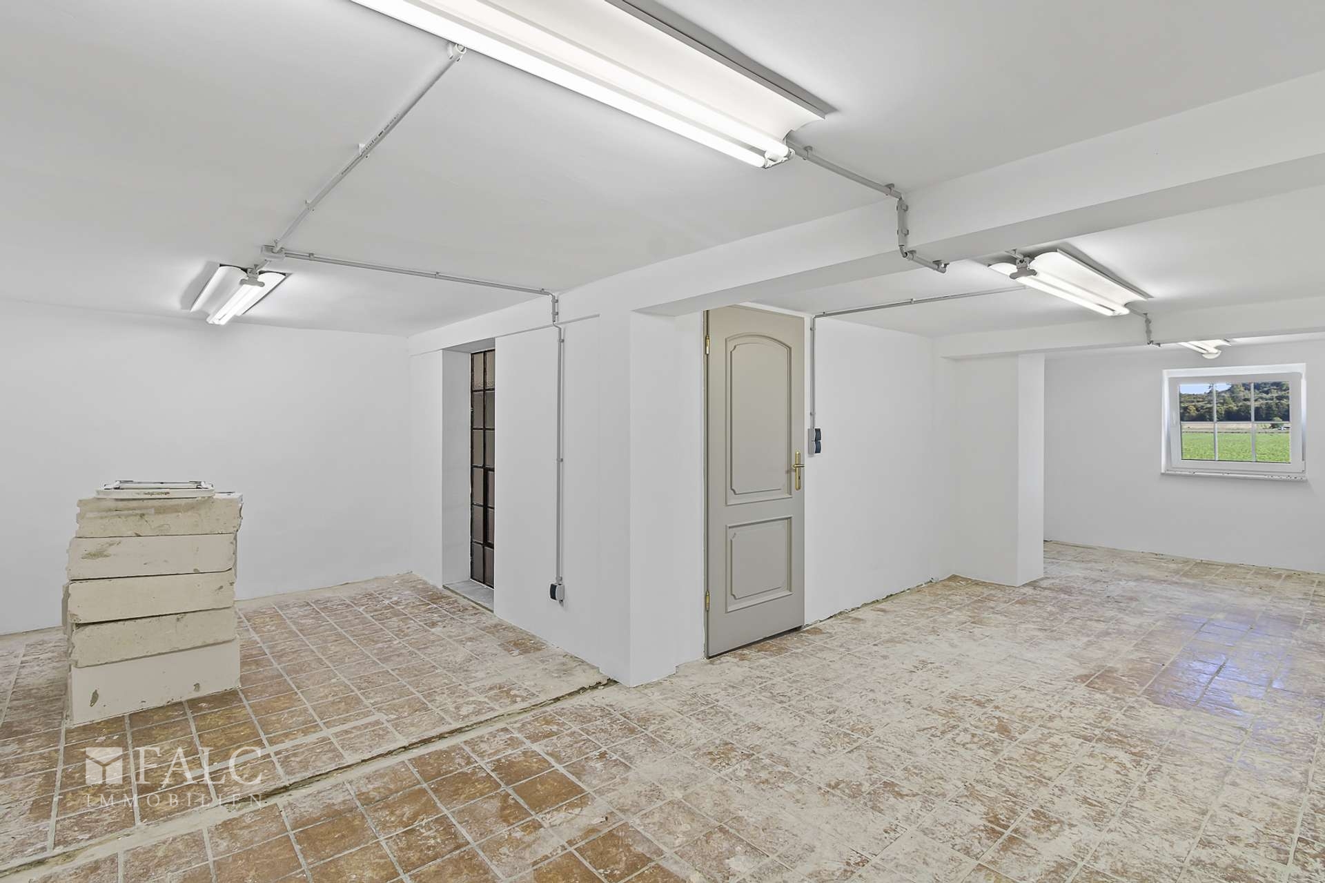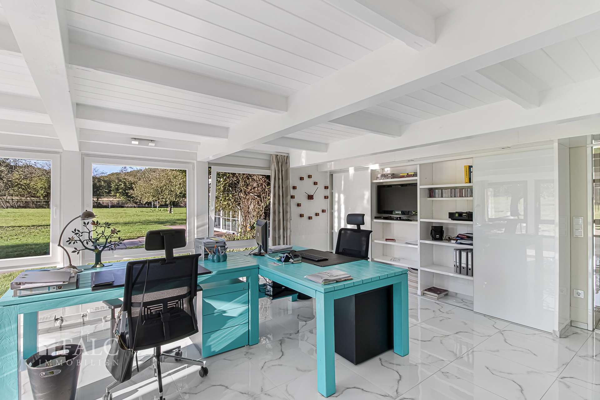 Zudem gibt es ein helles, offenes Büro mit einer großen Fensterfront, die einen wunderbaren Ausblick auf den eigenen Hof ermöglicht und so eine angenehme Arbeitsumgebung schafft.