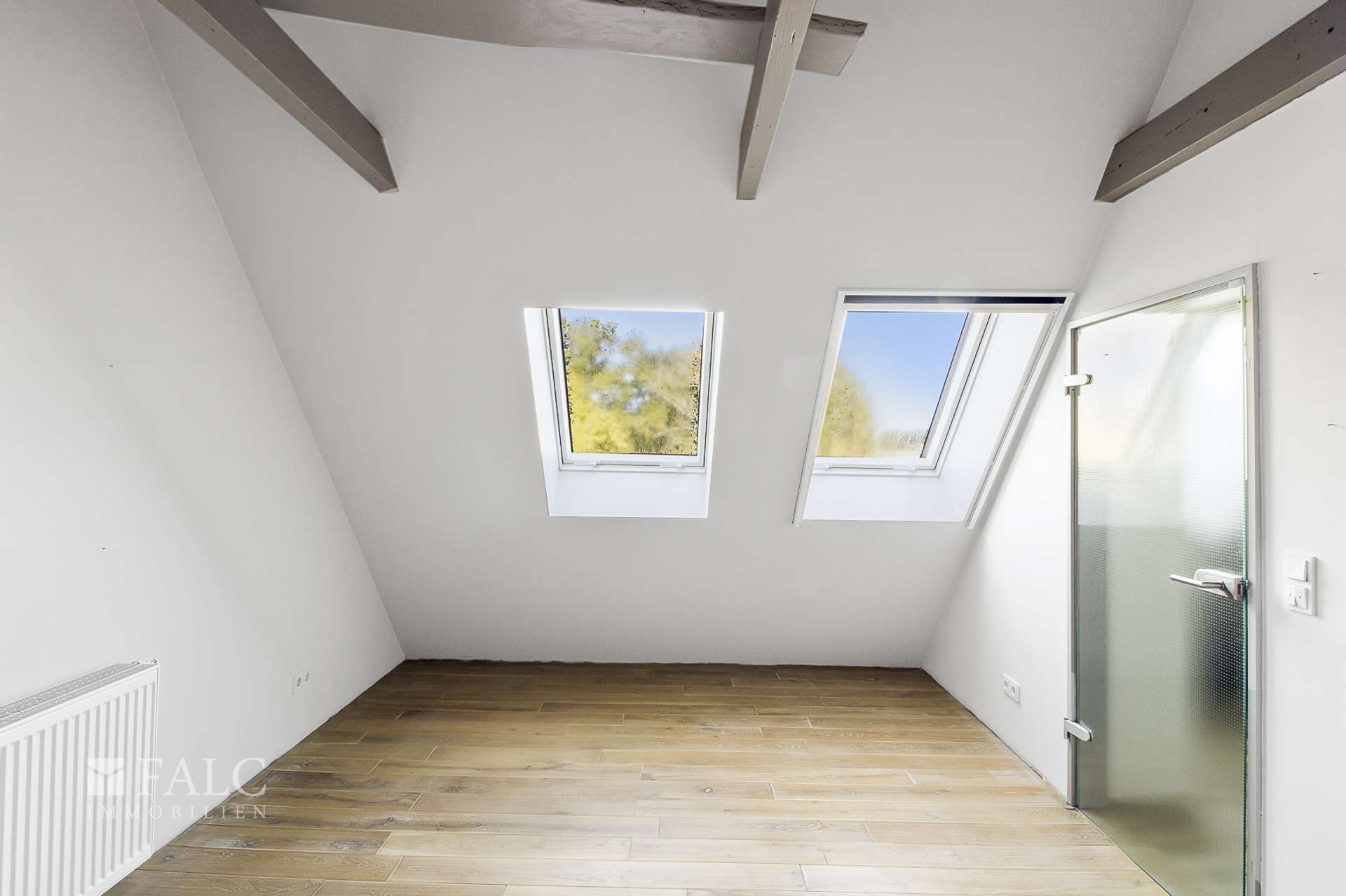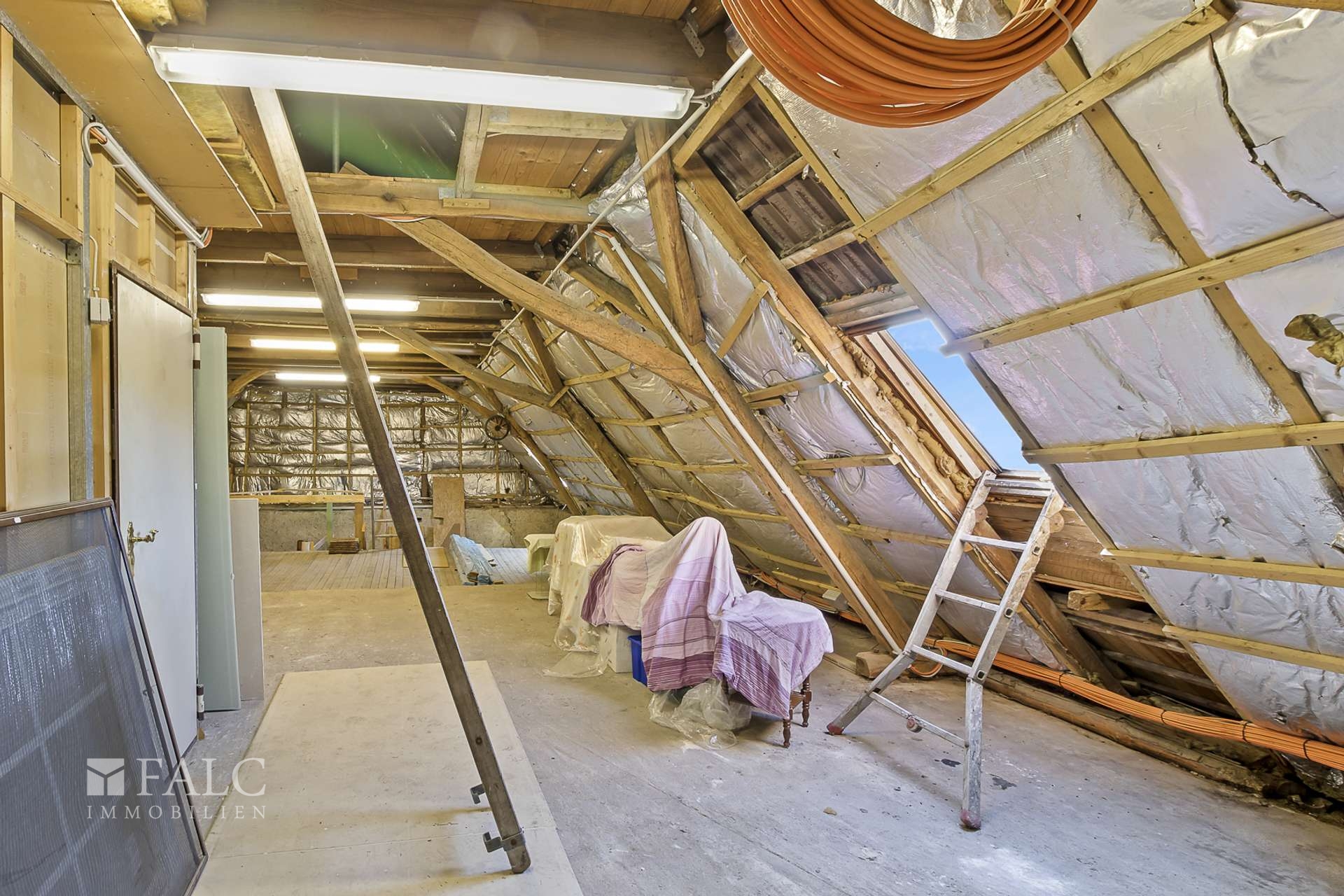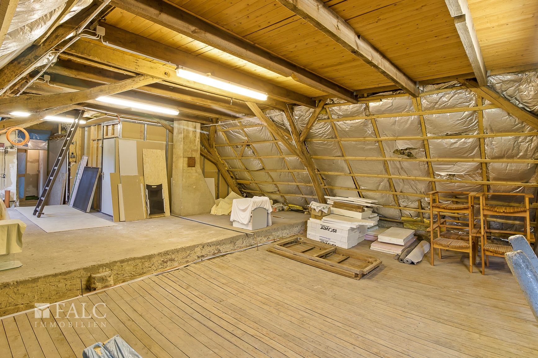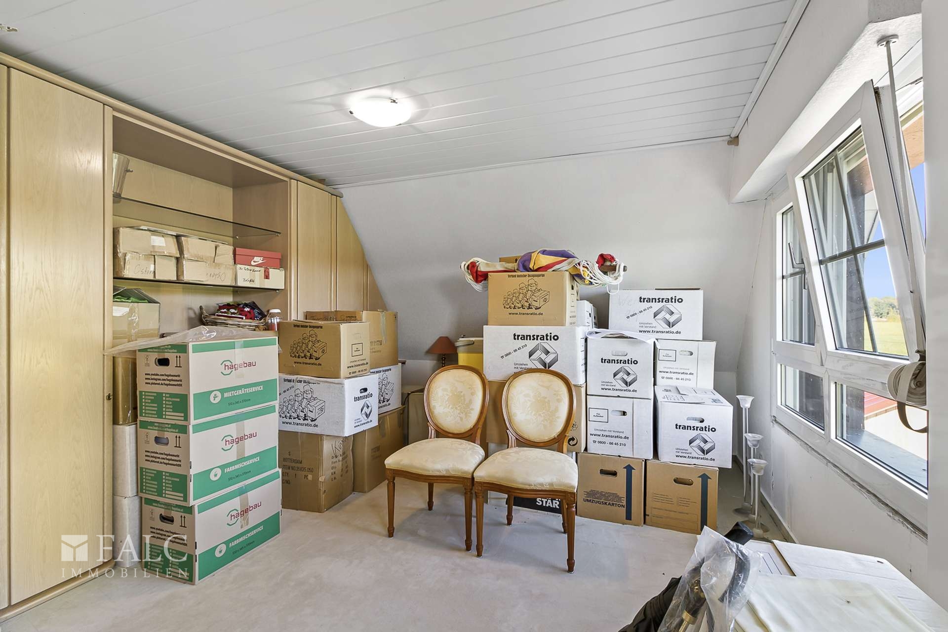 Im Obergeschoss befindet sich ein weiteres, abgegrenztes Zimmer, das sich ideal als Gästezimmer nutzen lässt. Dieses verfügt über ein angrenzendes Badezimmer und bietet damit den Gästen höchsten Komfort. Ein großer Teil des Obergeschosses ist noch ausbaufähig und eröffnet vielseitige Gestaltungsmöglichkeiten für die zukünftige Nutzung, sei es als zusätzlicher Wohnraum, Arbeitsbereich oder Hobbyraum.