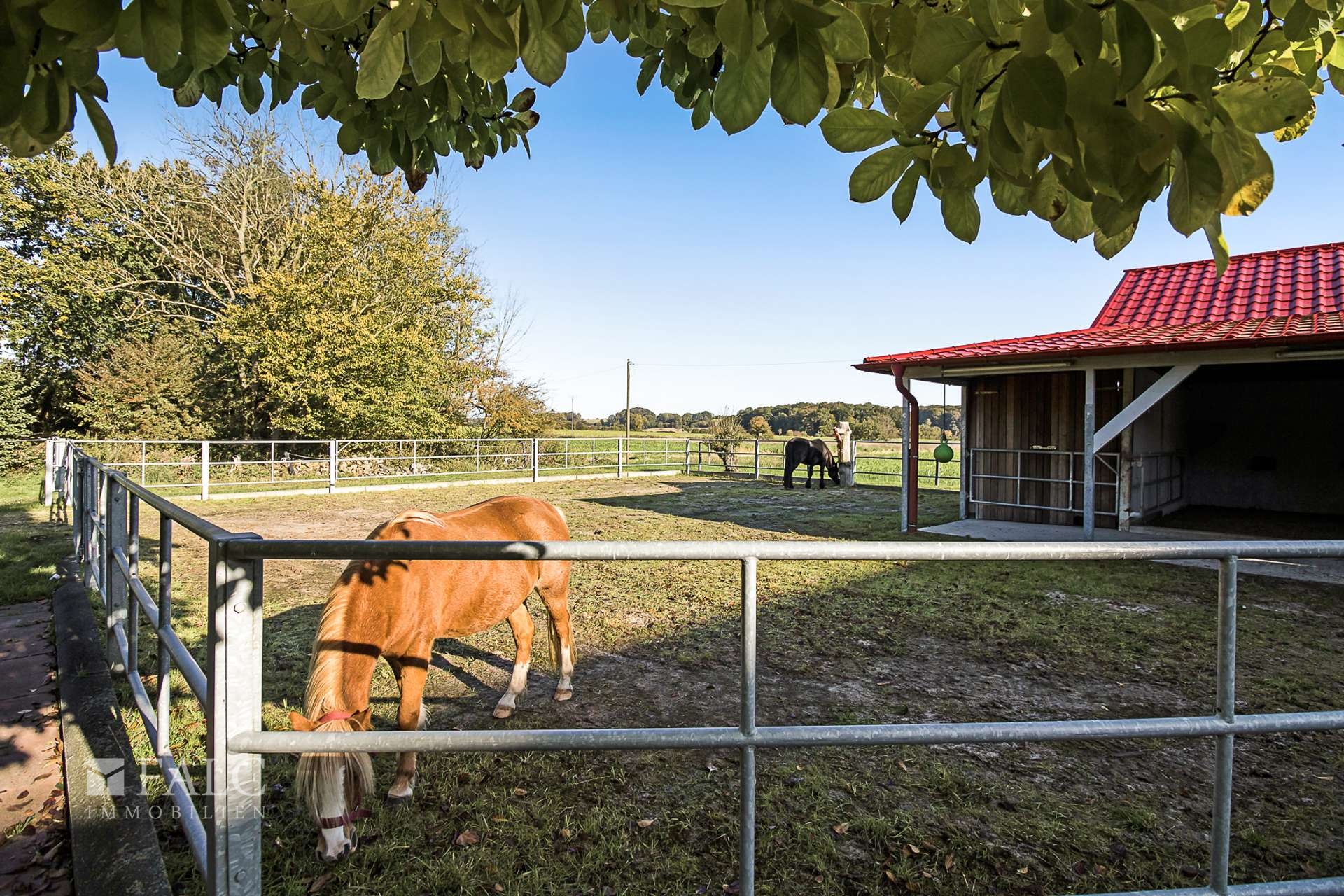 Für Reit- und Pferdeliebhaber bietet das Anwesen einen geräumigen Stall sowie weitläufige Pferdeweiden, die ausreichend Platz für die artgerechte Haltung und Bewegung der Tiere ermöglichen. Die perfekte Infrastruktur für die Pferdehaltung schafft optimale Bedingungen, um das Leben mit den Pferden in vollen Zügen zu genießen.