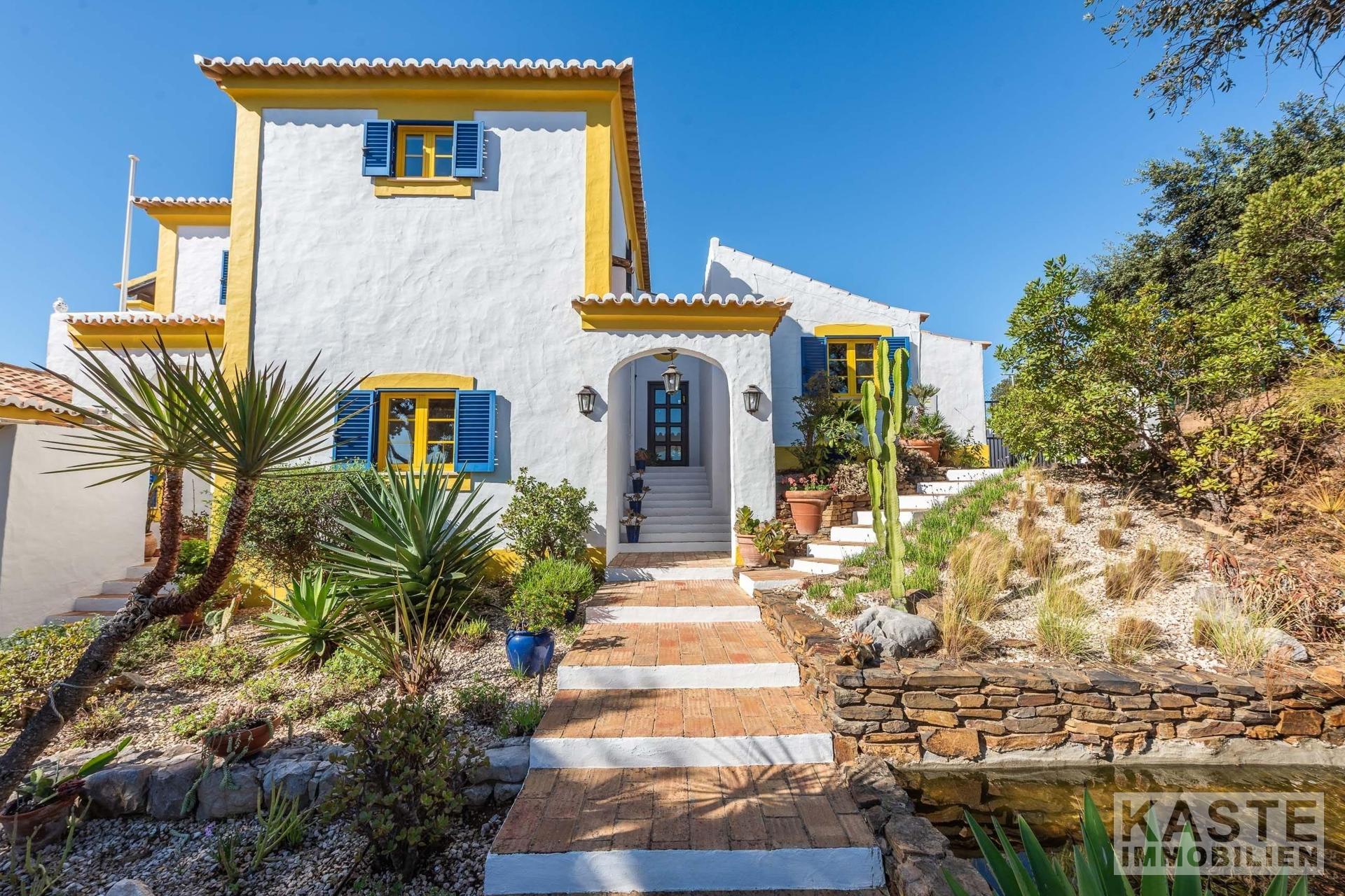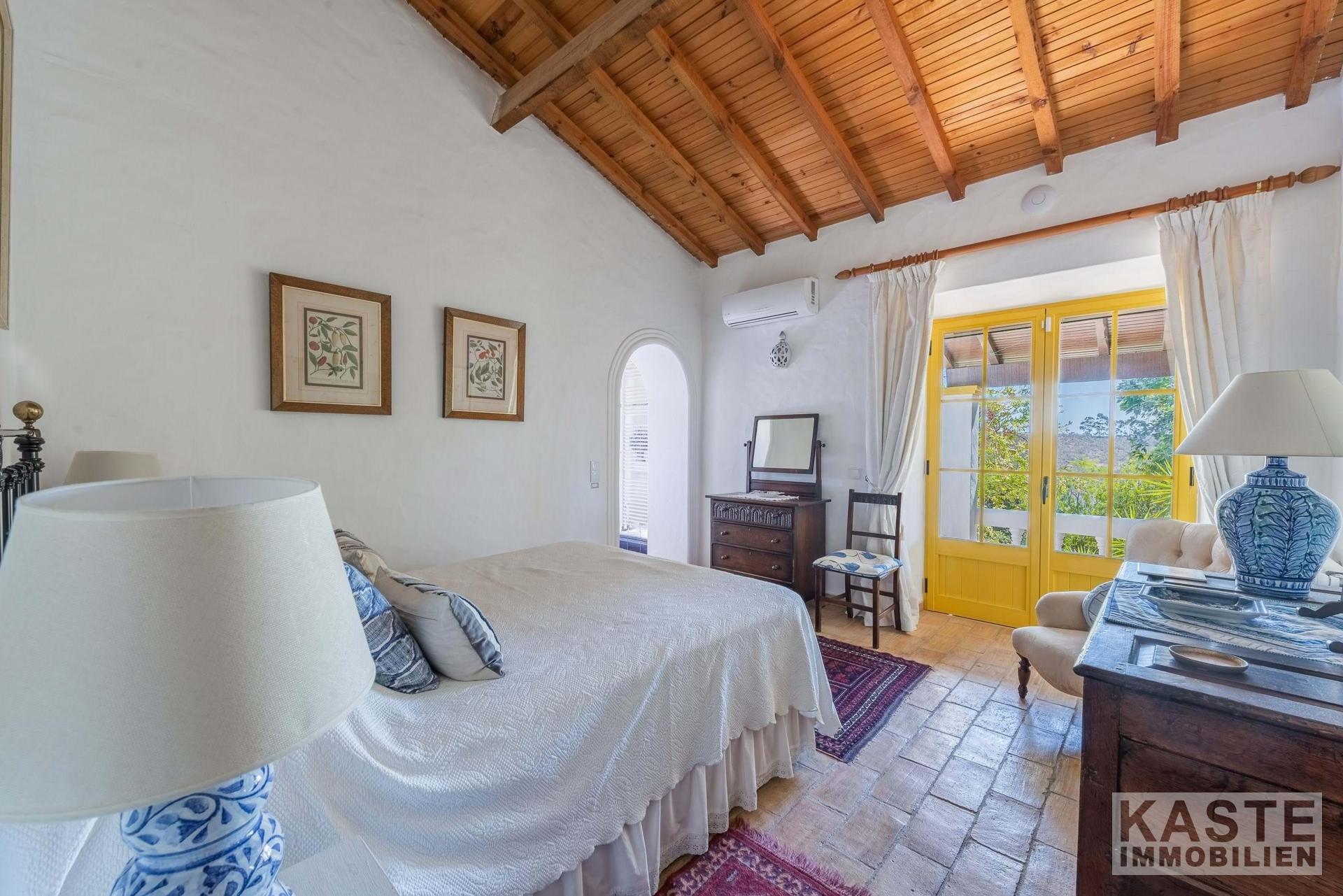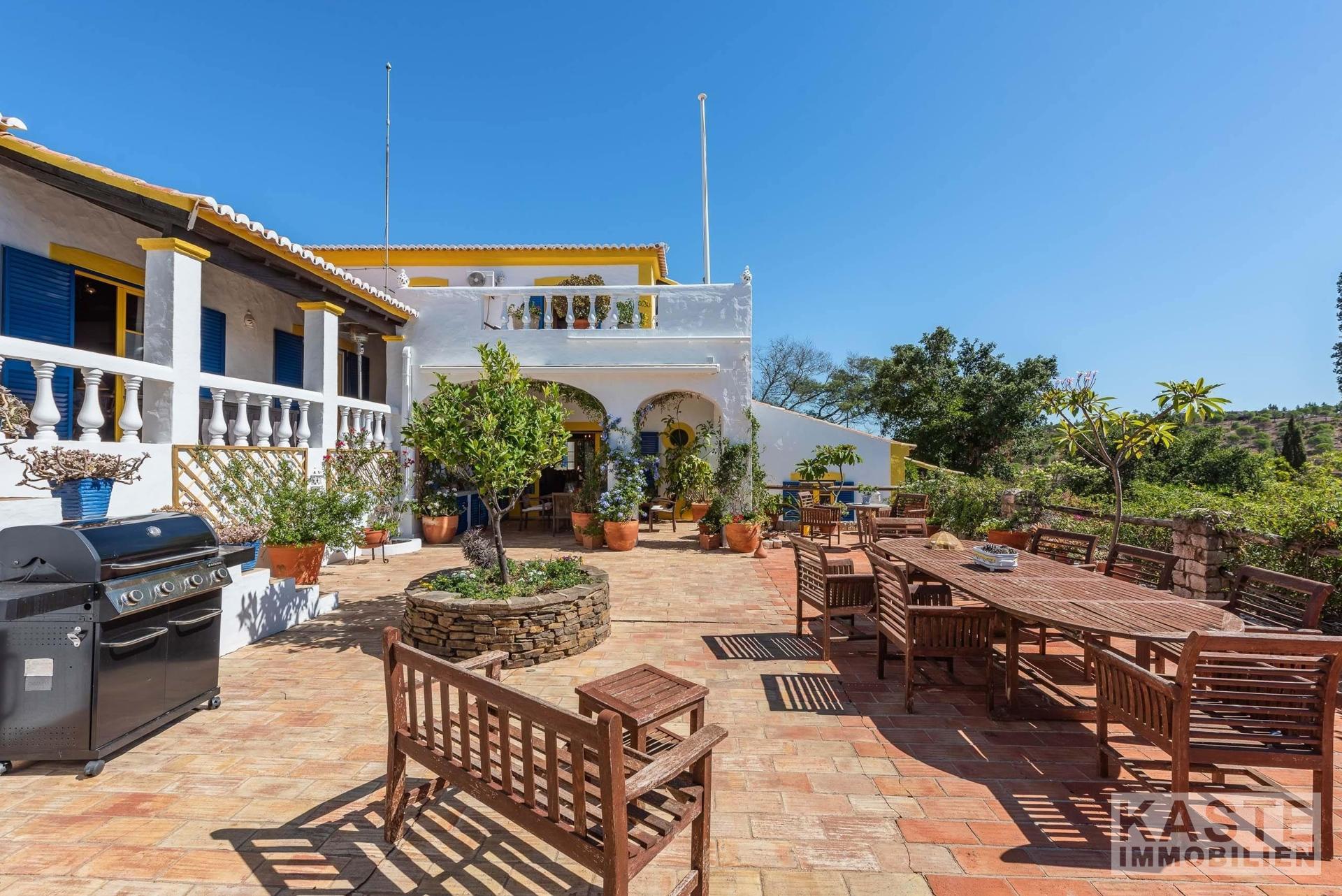 Die Residenz besteht aus einem eleganten Haupthaus mit vier großzügigen Schlafzimmern und sieben voll ausgestatteten Badezimmern sowie einem charmanten separaten Cottage mit zwei Schlafzimmern. Das Ambiente vereint klassischen portugiesischen Charme mit modernem Komfort und anspruchsvoller Ausstattung. Durchdachte Architektur sorgt für lichtdurchflutete Räume, die direkt auf Terrasse und Poolbereich zugreifen, von wo aus das beeindruckende Panorama entdeckt werden kann.