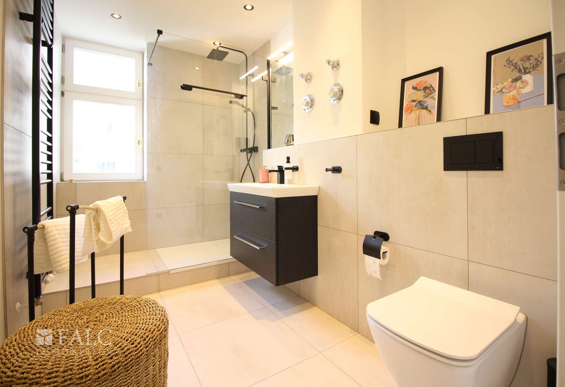 Das Badezimmer ist zeitlos hell gefliest und verfügt über ein Fenster.