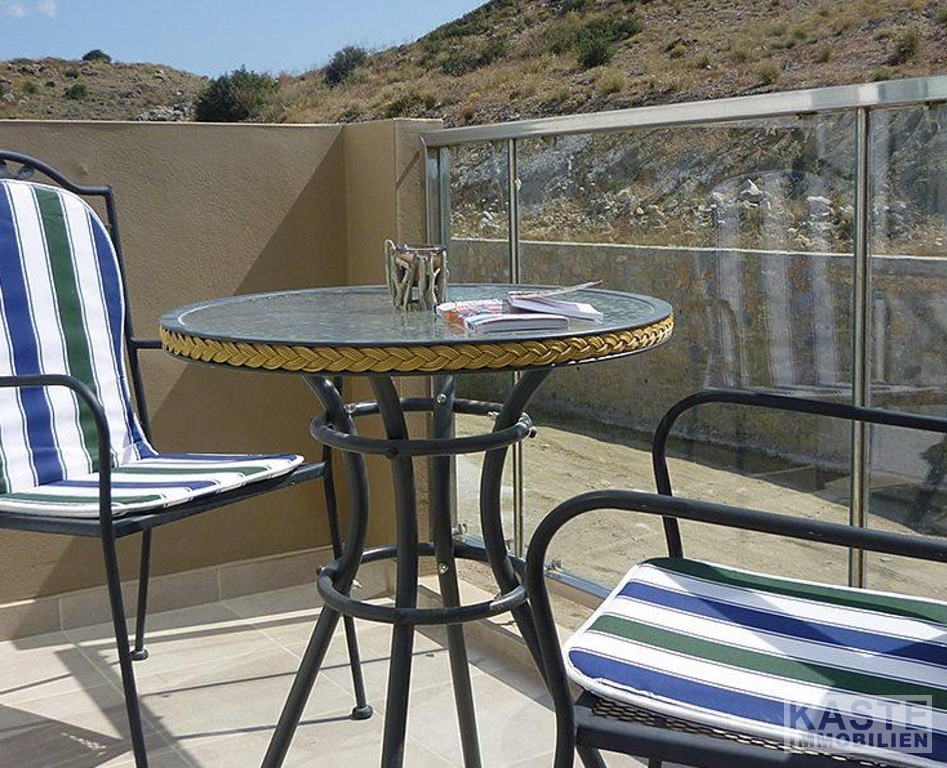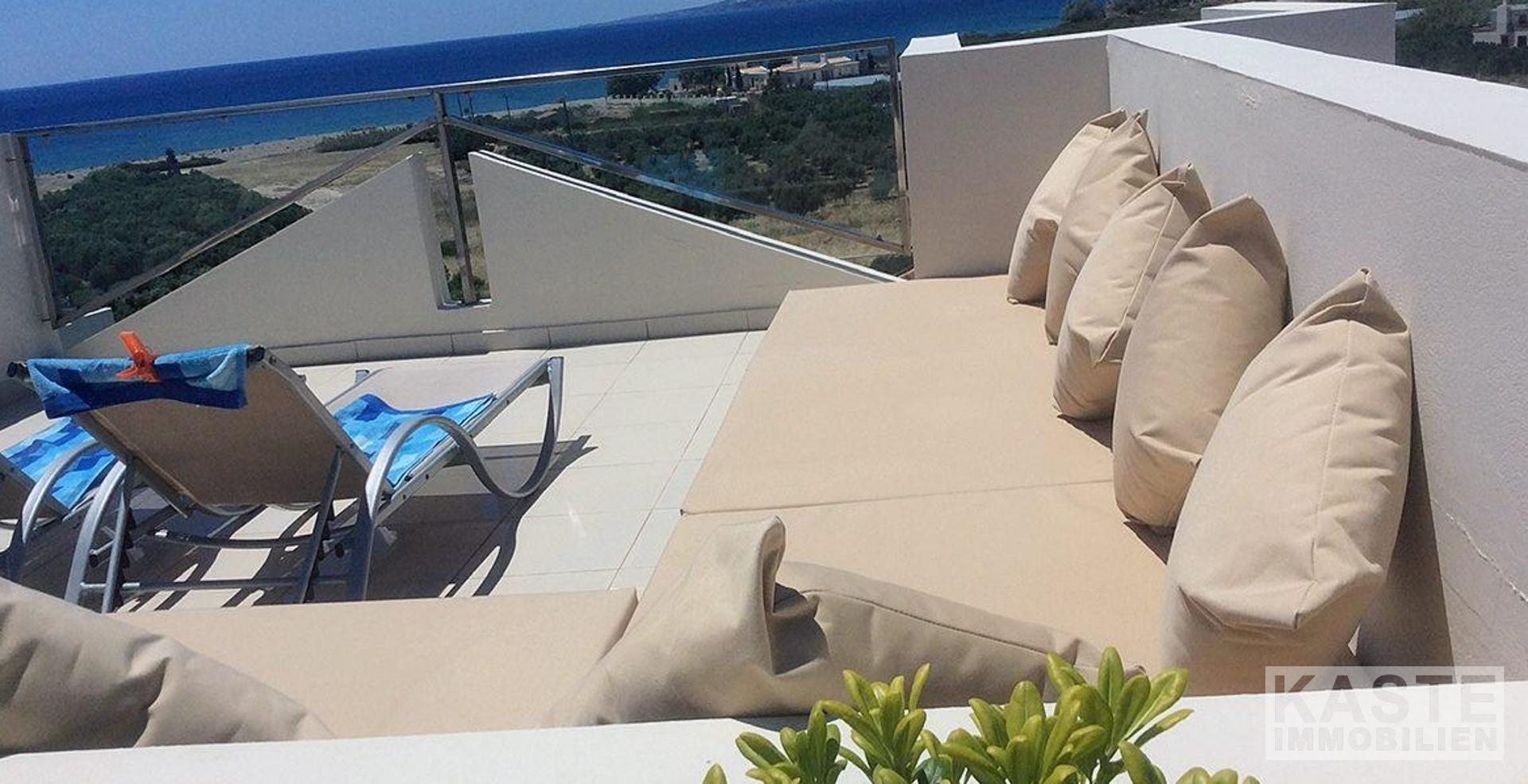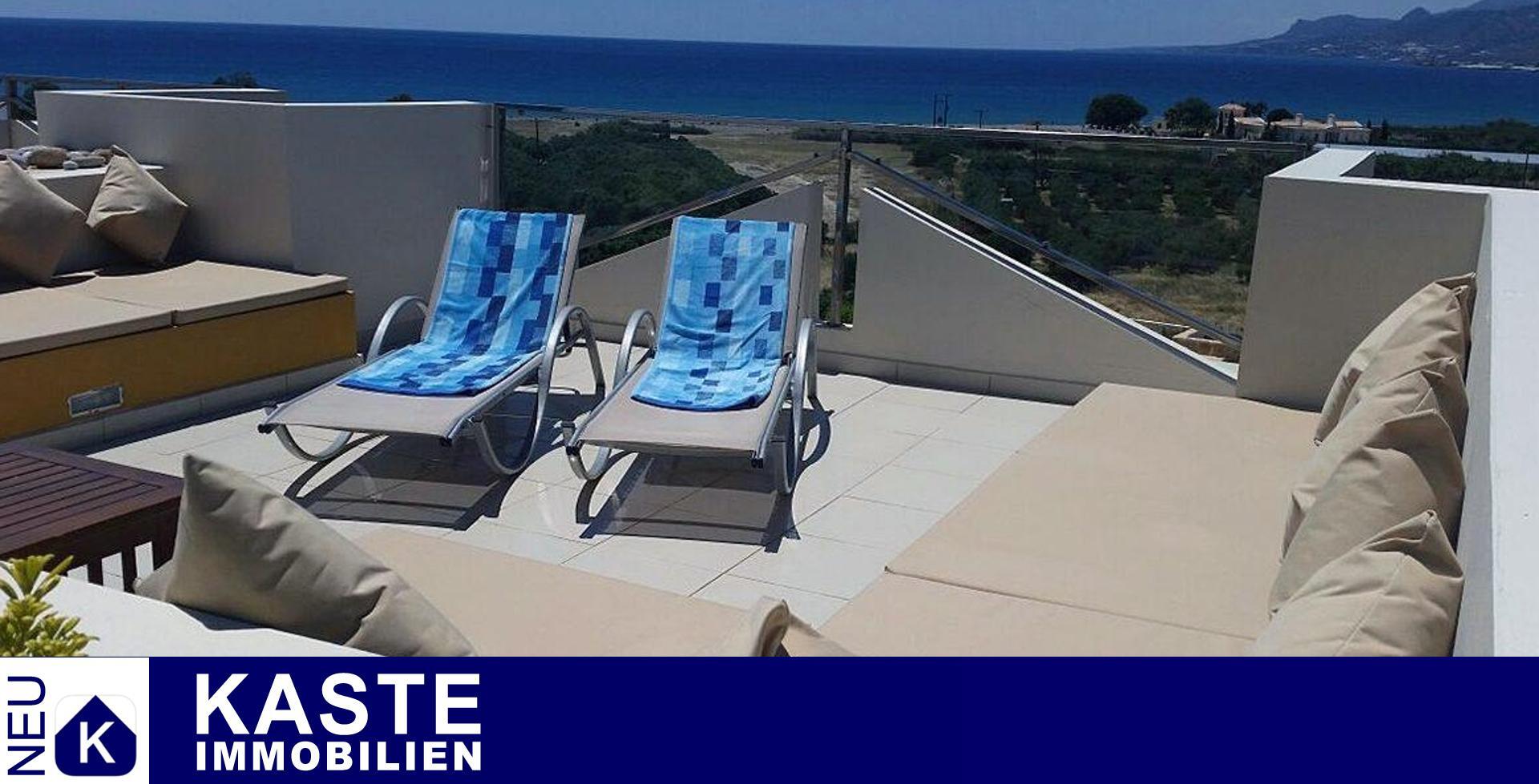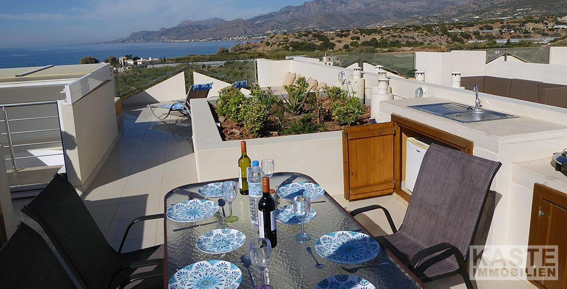 Eine Treppe direkt vor der Eingangstür des Penthouses führt zu einer atemberaubenden privaten Dachterrasse. Diese bietet zahlreiche Sitzgelegenheiten, Sonnenliegen, eine voll ausgestattete Außenküche, einen Grillbereich und hochwertige Essmöbel. Diese einzigartige Terrasse wird somit zum idealen Ort, um die fantastische Aussicht zu genießen oder den kretischen Sonnenaufgang und -untergang zu erleben.
