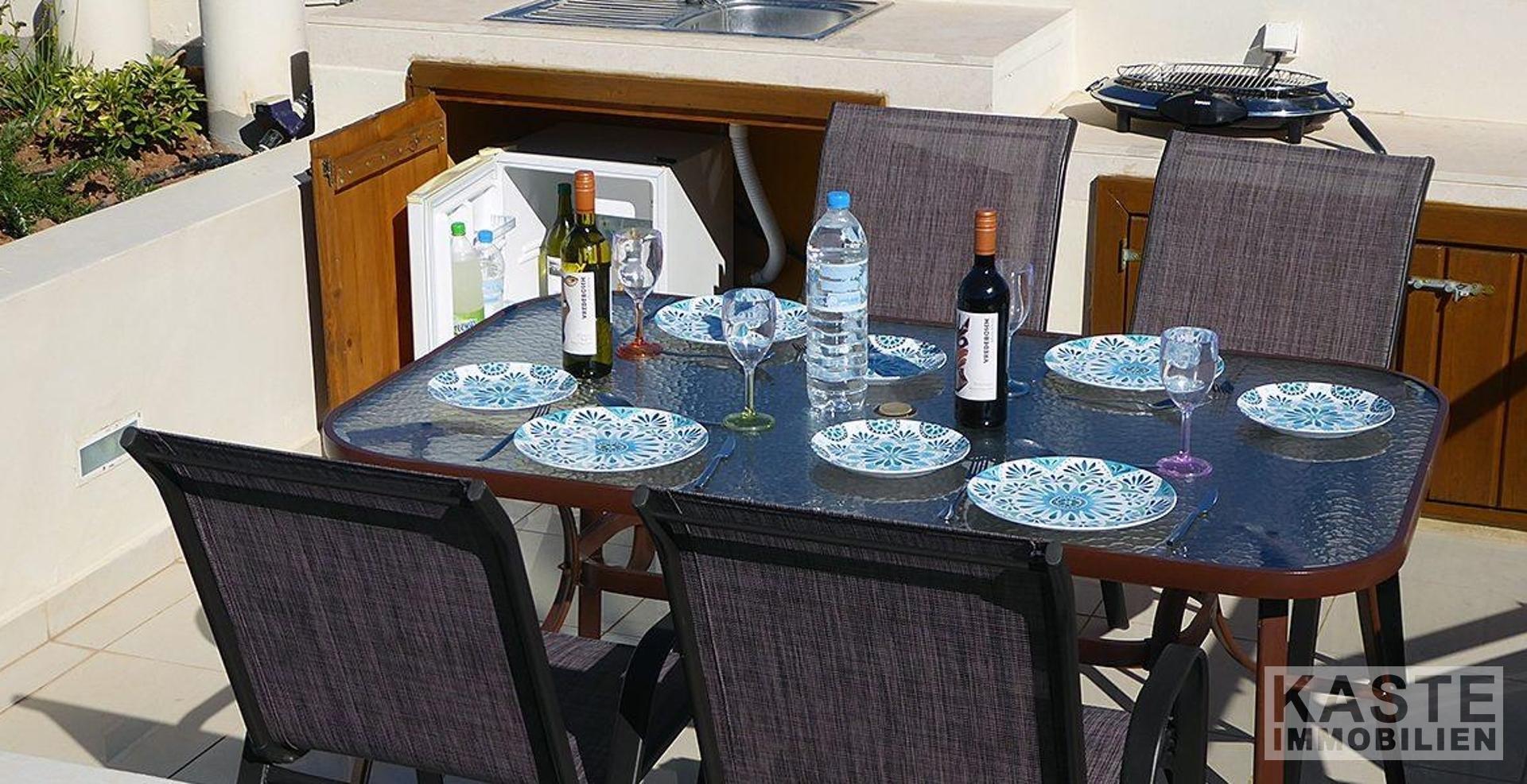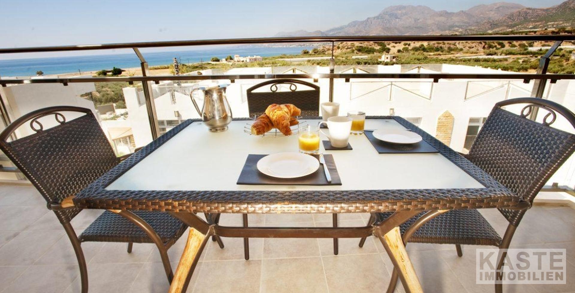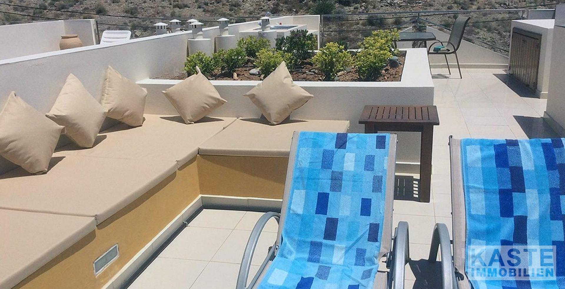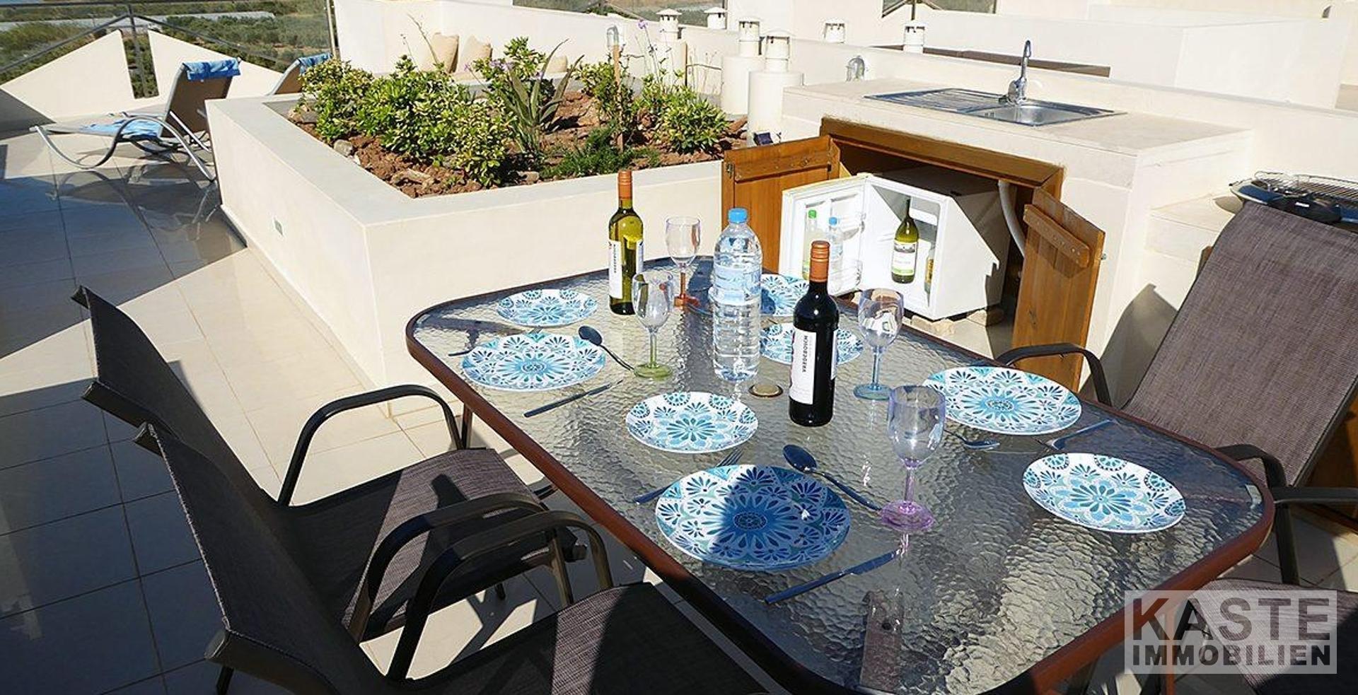 Eine Treppe direkt vor der Eingangstür des Penthouses führt zu einer atemberaubenden privaten Dachterrasse. Diese bietet zahlreiche Sitzgelegenheiten, Sonnenliegen, eine voll ausgestattete Außenküche, einen Grillbereich und hochwertige Essmöbel. Diese einzigartige Terrasse wird somit zum idealen Ort, um die fantastische Aussicht zu genießen oder den kretischen Sonnenaufgang und -untergang zu erleben.