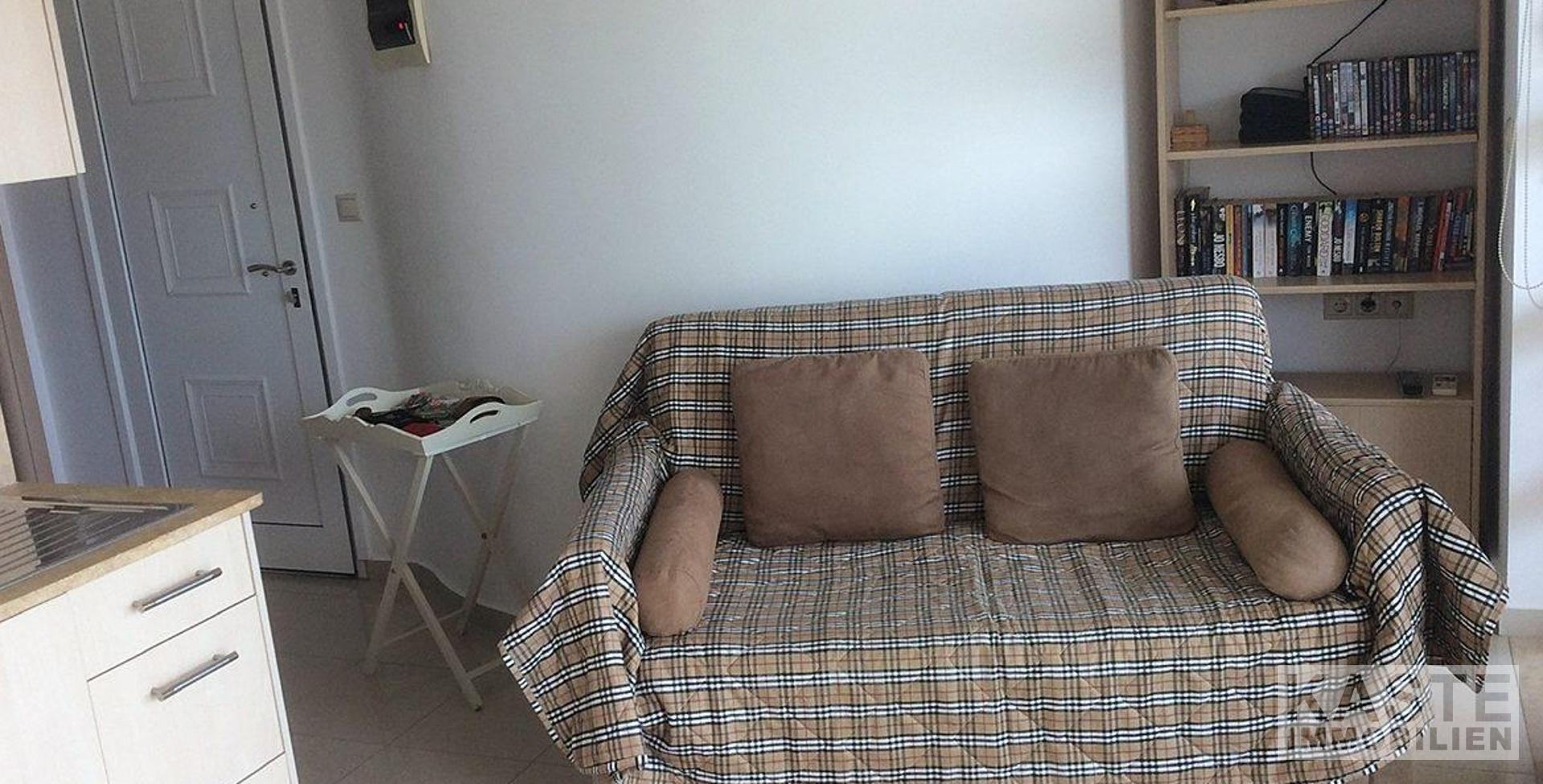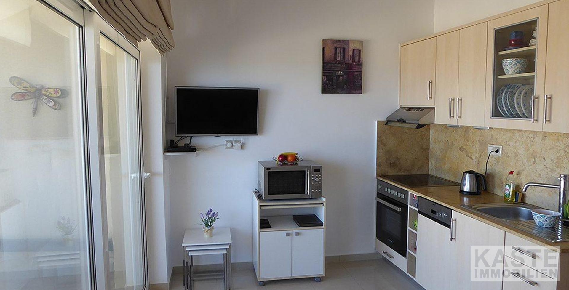Das moderne Penthouse besteht aus einem Schlafzimmer mit maßgefertigten Einbauschränken, einer voll ausgestatteten Küche mit Backofen, Kühlschrank und Geschirrspüler, einem Badezimmer mit begehbarer Dusche sowie einem Wohnbereich mit Fernseher und Schlafsofa. Zwei großzügige Balkone, einer am Rücken des Schlafzimmers und einer an der Vorderseite des Wohnzimmers, laden zum Verweilen ein.