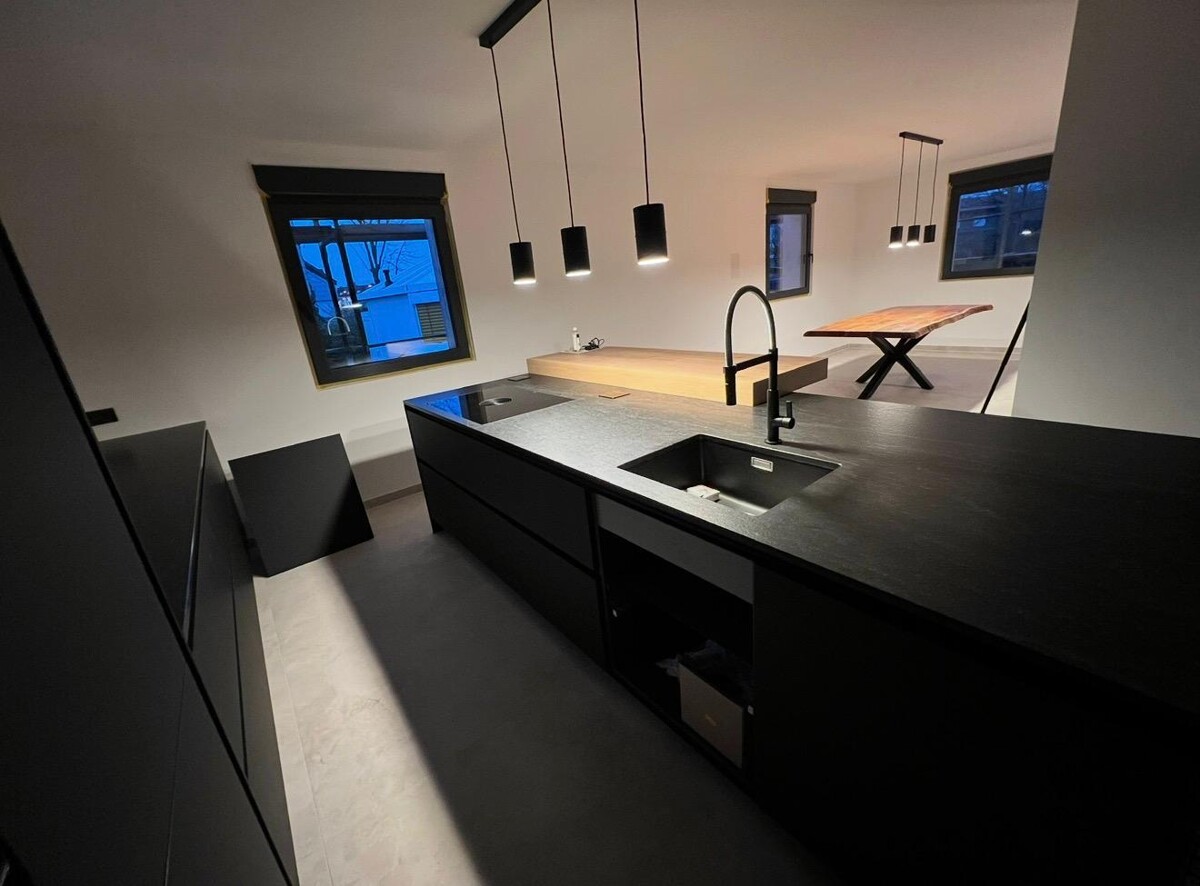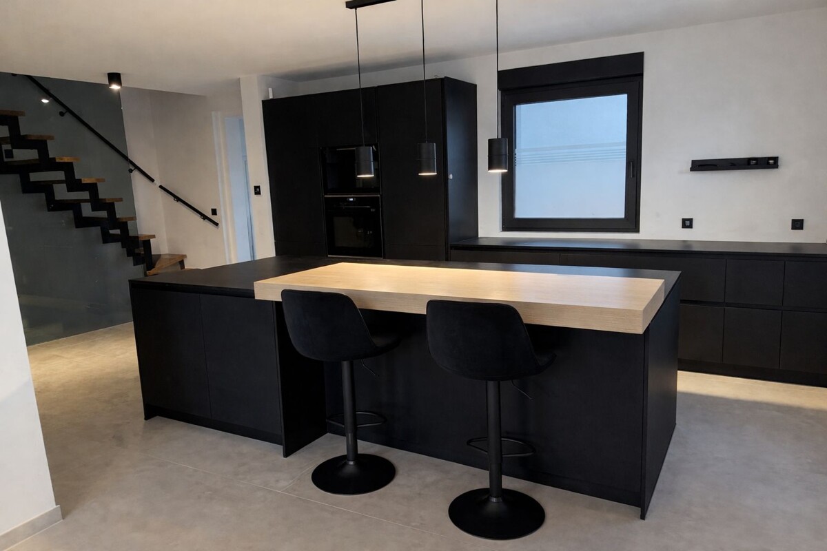 Ein absolutes Highlight ist die maßgefertigte Premium-Küche in elegantem Schwarz-Matt mit großzügiger Kochinsel und Bartheke. Hochwertige Materialien und modernes Design machen sie zum repräsentativen Mittelpunkt des Hauses.