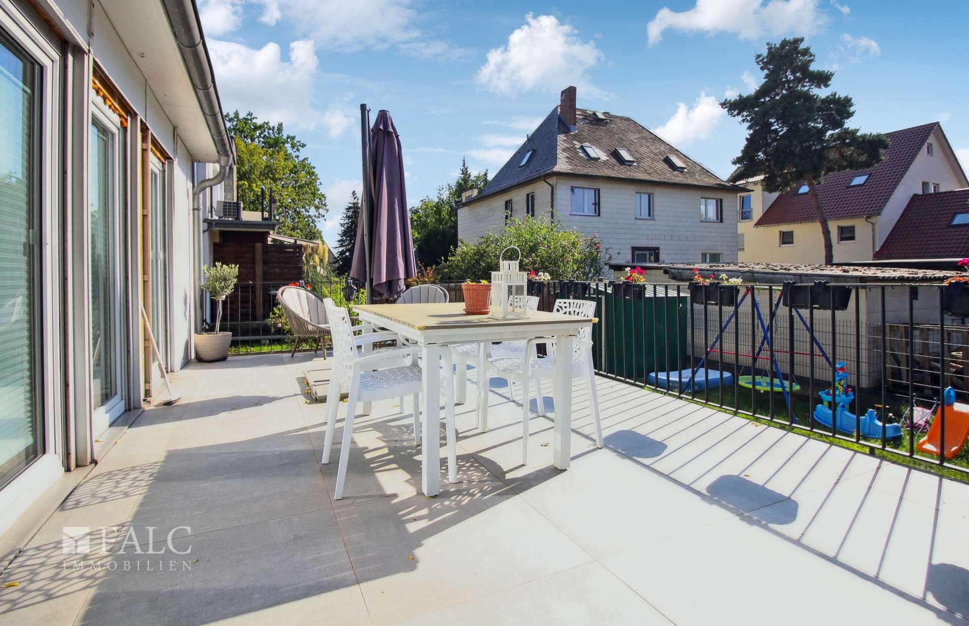 Die großzügige 25m² Terrasse (mit Südwestausrichtung) bietet einen schönen Blick in den Garten.