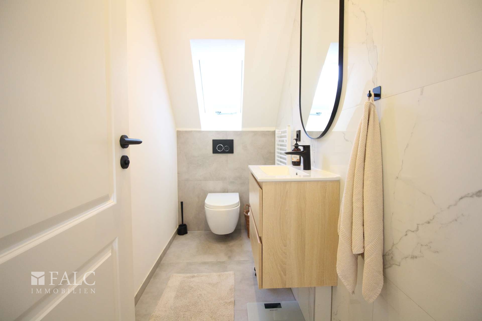 Die Badezimmer sind zeitlos hell gefliest und mit Fenstern ausgestattet.