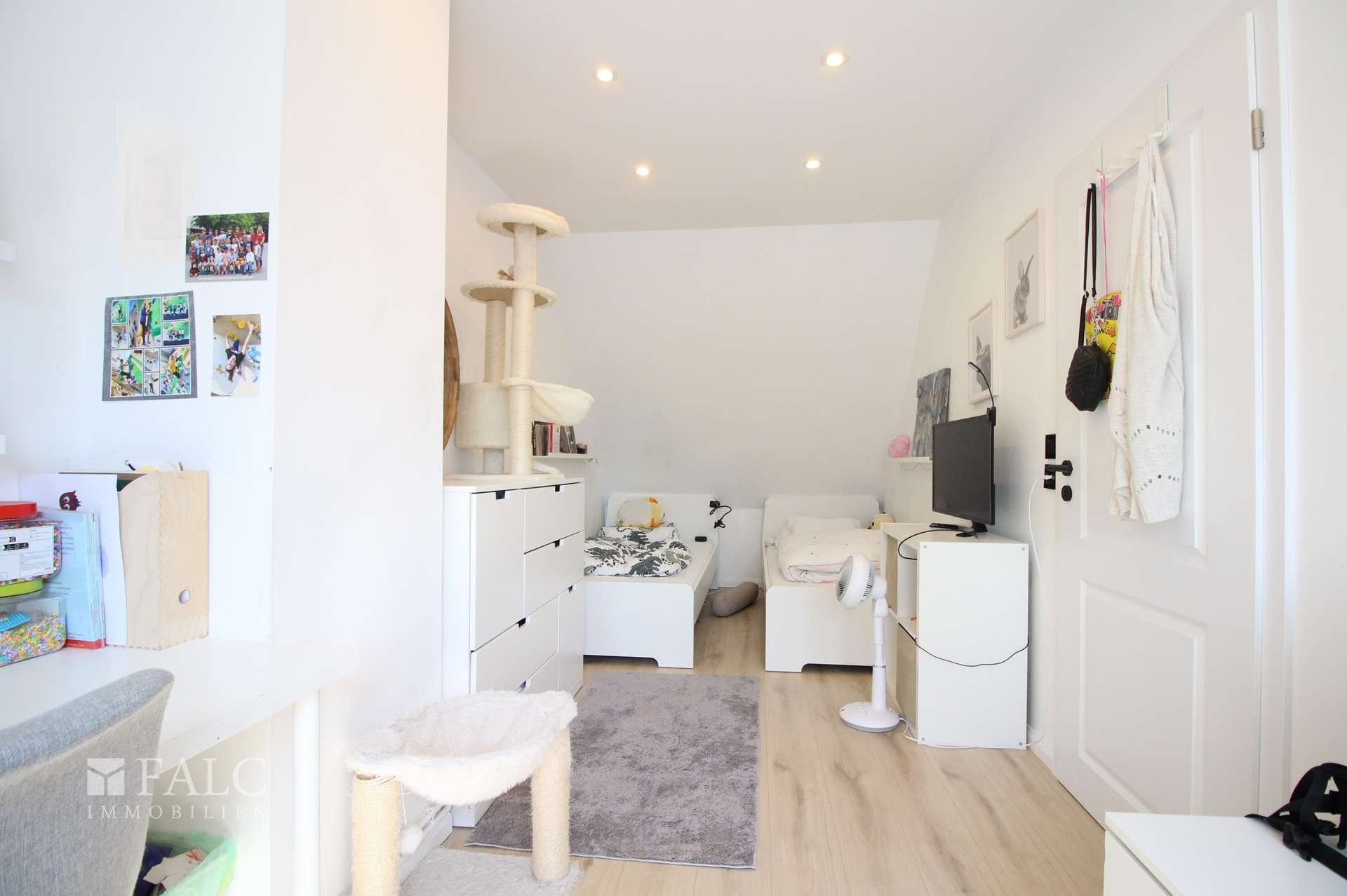 Das Haus liegt in einer ruhigen und grünen Wohngegend, die sowohl Rückzugsort als auch Raum für Erholung bietet. Mit insgesamt vier Zimmern bietet das Einfamilienhaus eine durchdachte Raumaufteilung, die sowohl Privatsphäre als auch gemeinschaftliches Wohnen fördert. Das Herzstück des Hauses ist der lichtdurchflutete Wohnbereich, der direkt mit der Terrasse und dem Garten verbunden ist. Hier können Sie die Schönheit der Natur genießen und die Kinder beim Spielen im Garten im Blick behalten.