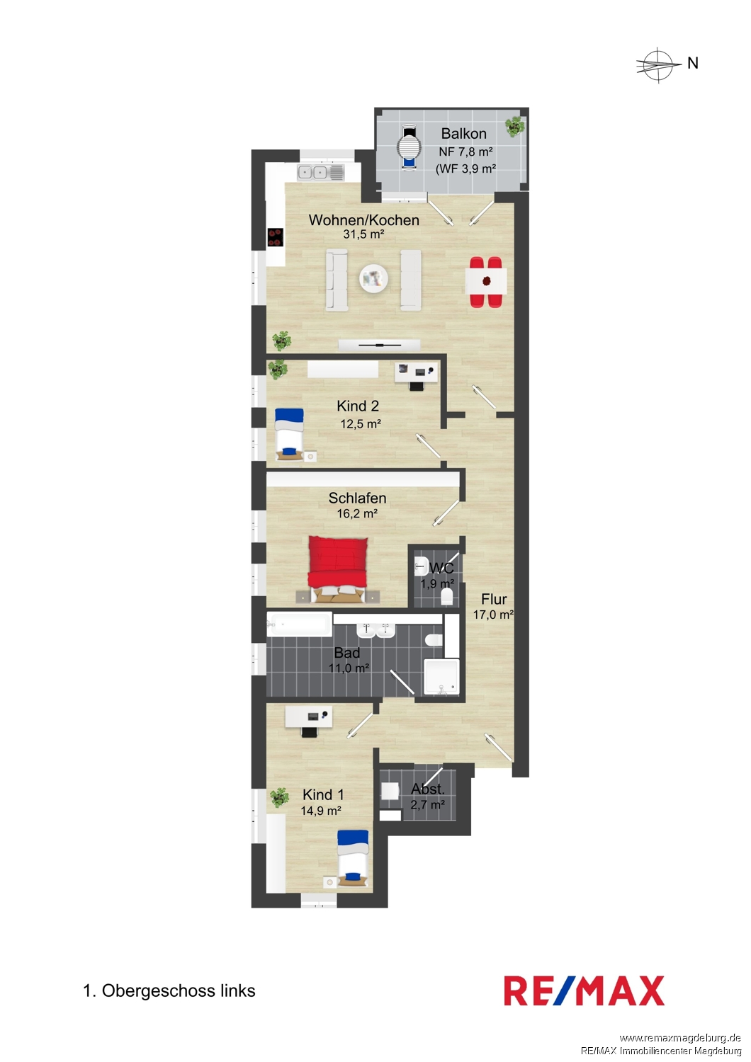 - Flur, - Abstellraum mit Waschmaschinenanschluss, - Kind 1, - Tageslichtbad mit Badewanne und ebenerdiger Dusche, - Gäste-WC, - Schlafen, - Kind 2, - Wohnen & Kochen mit Zugang zum Balkon,