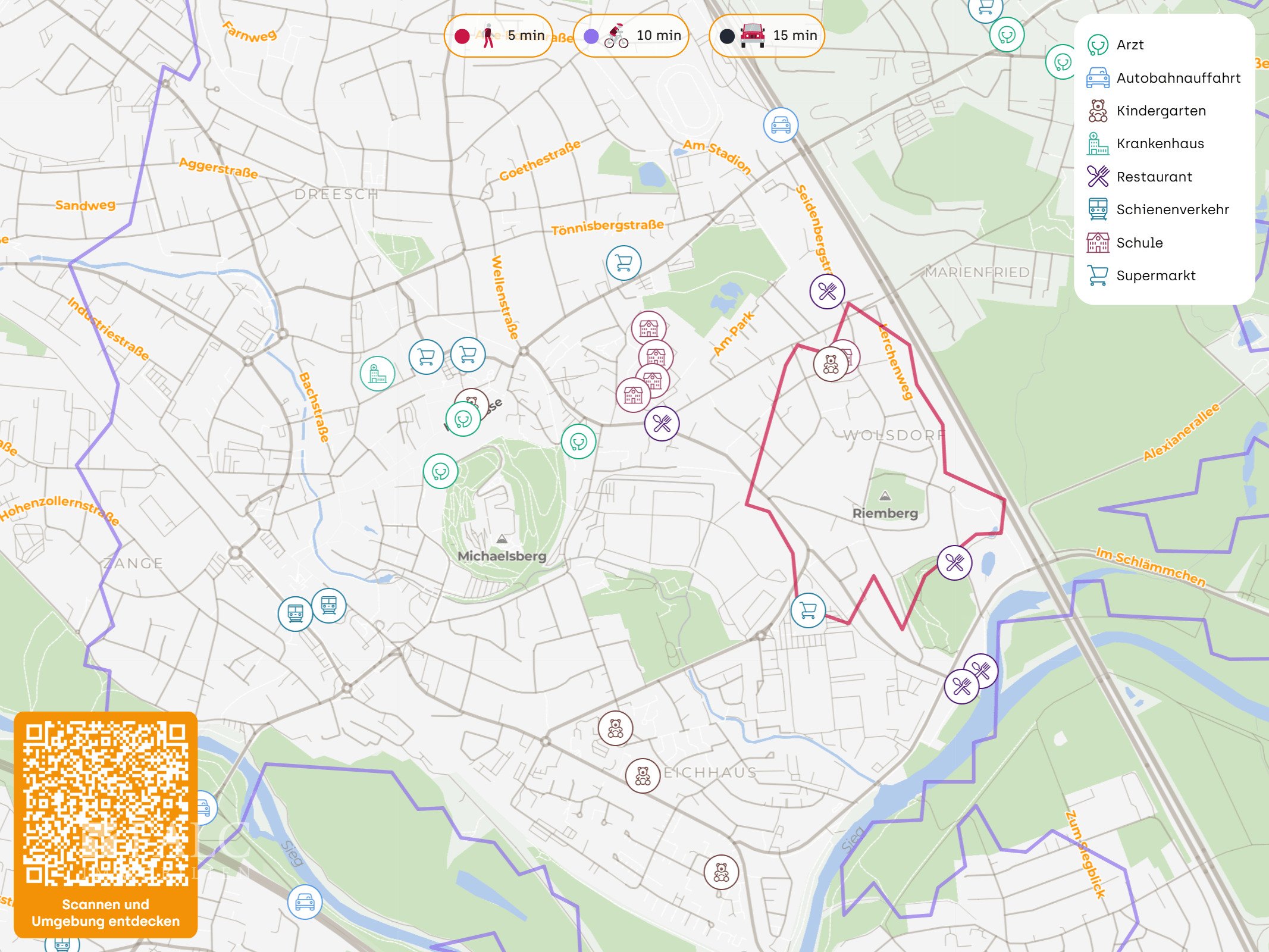 Für Familien und Berufstätige bietet die Lage zahlreiche Vorteile. Der nächste Supermarkt ist nur etwa 450 Meter entfernt, was den täglichen Einkauf besonders bequem macht. Auch die medizinische Versorgung ist durch die nahegelegene Kinderarztpraxis in etwa 820 Metern Entfernung gewährleistet. Für die Bildung der Jüngsten ist gesorgt, da die Grundschule Wolsdorf nur rund 300 Meter entfernt liegt. Zudem befindet sich ein Kindergarten in unmittelbarer Nähe, etwa 300 Meter von der Immobilie entfernt.