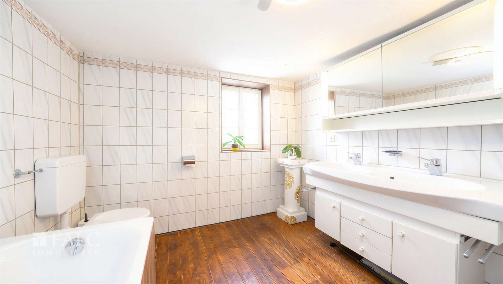 Das Badezimmer überzeugt durch seine großzügige Gestaltung und bietet ausreichend Platz für den Alltag. Ausgestattet mit Waschbecken, Badewanne und WC sowie einem Fenster für Tageslicht und Belüftung, bildet es eine solide Basis, die gleichzeitig Raum für moderne Gestaltungsideen lässt.