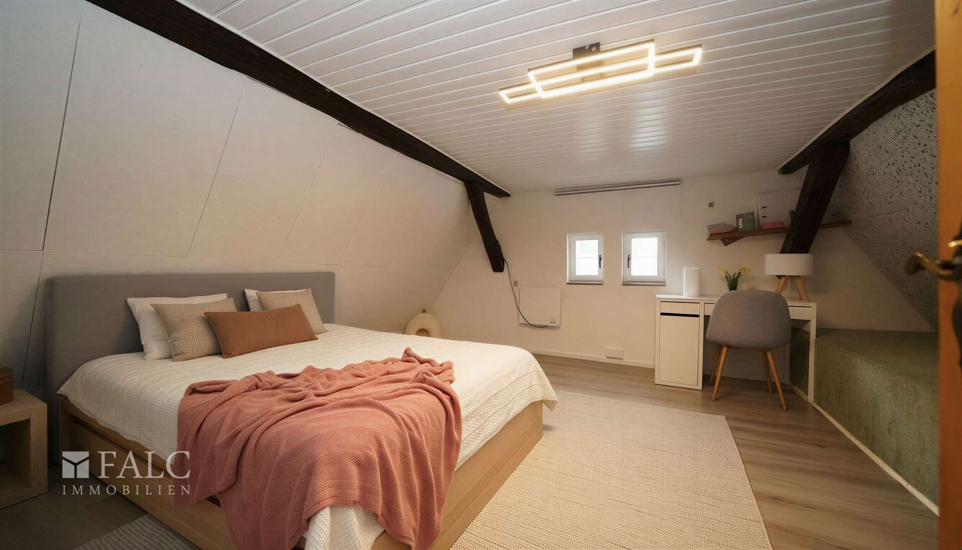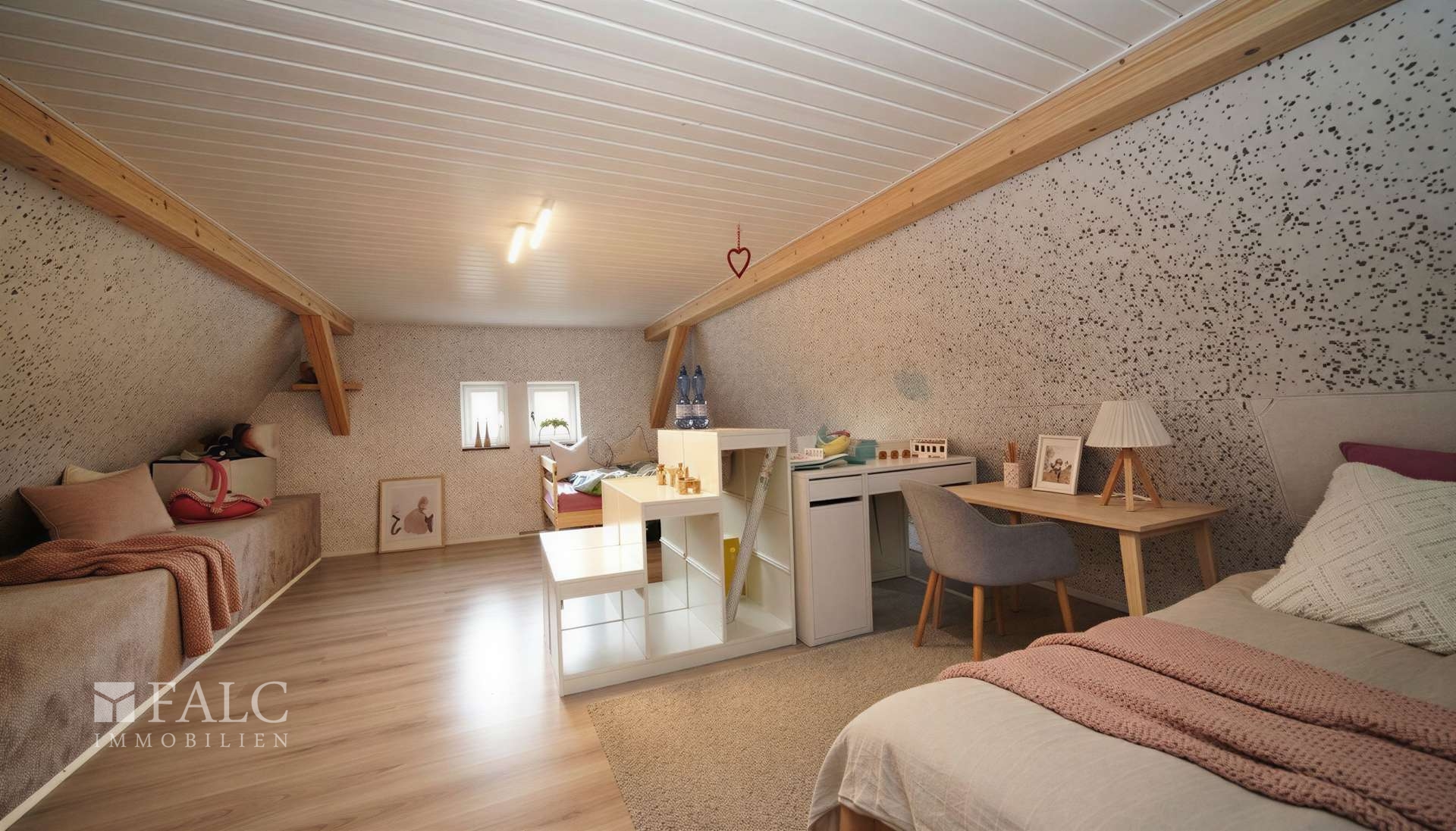 Im Dachgeschoss erwartet Sie ein echtes Wohlfühl-Highlight: Ein großzügiger Raum mit charmanten Dachschrägen und sichtbaren Holzbalken schafft eine besonders gemütliche und einladende Atmosphäre. Ob als Kinderzimmer, Spielbereich, Hobbyraum oder zusätzlicher Wohnraum – hier sind Ihrer Kreativität keine Grenzen gesetzt.