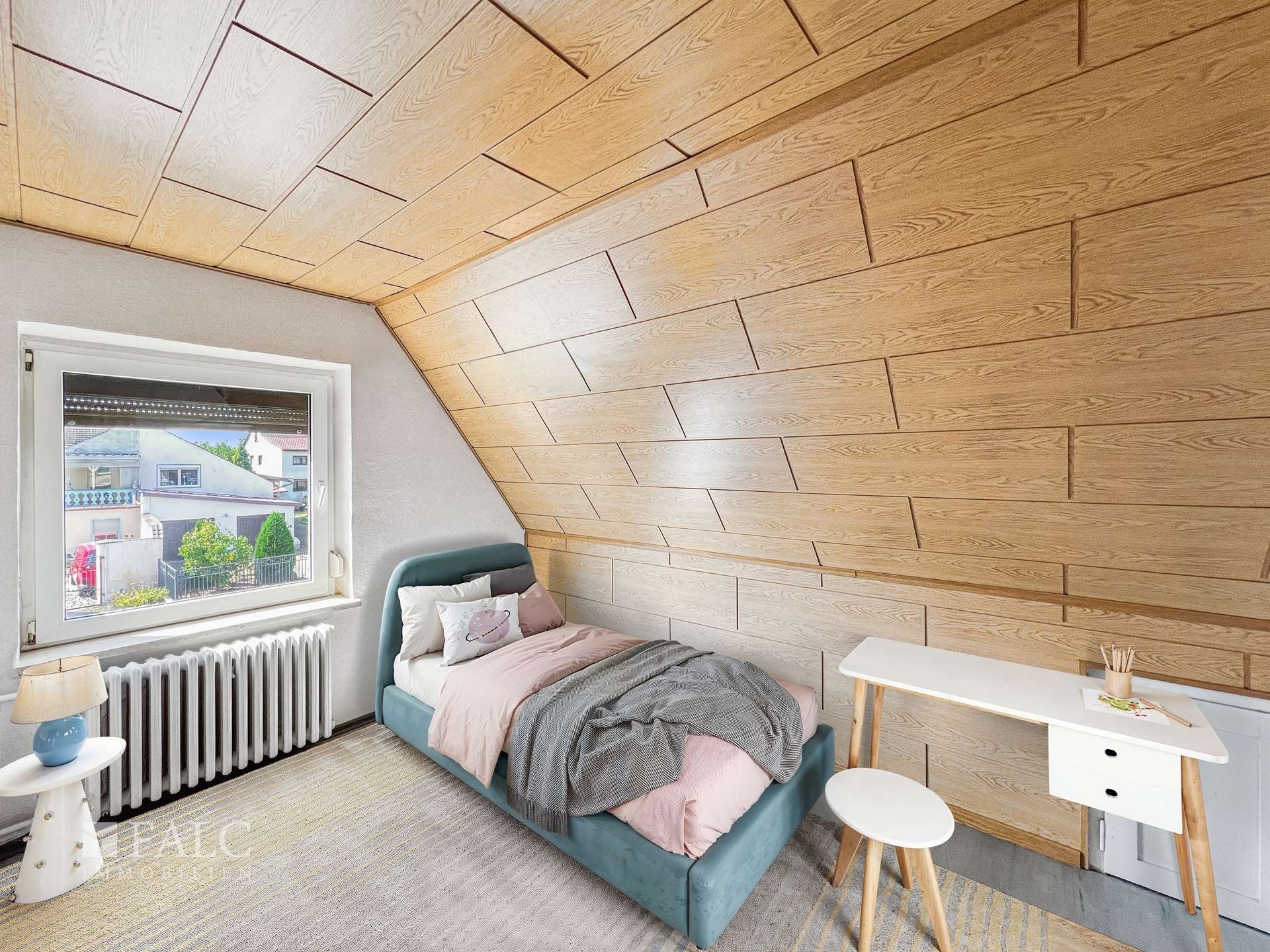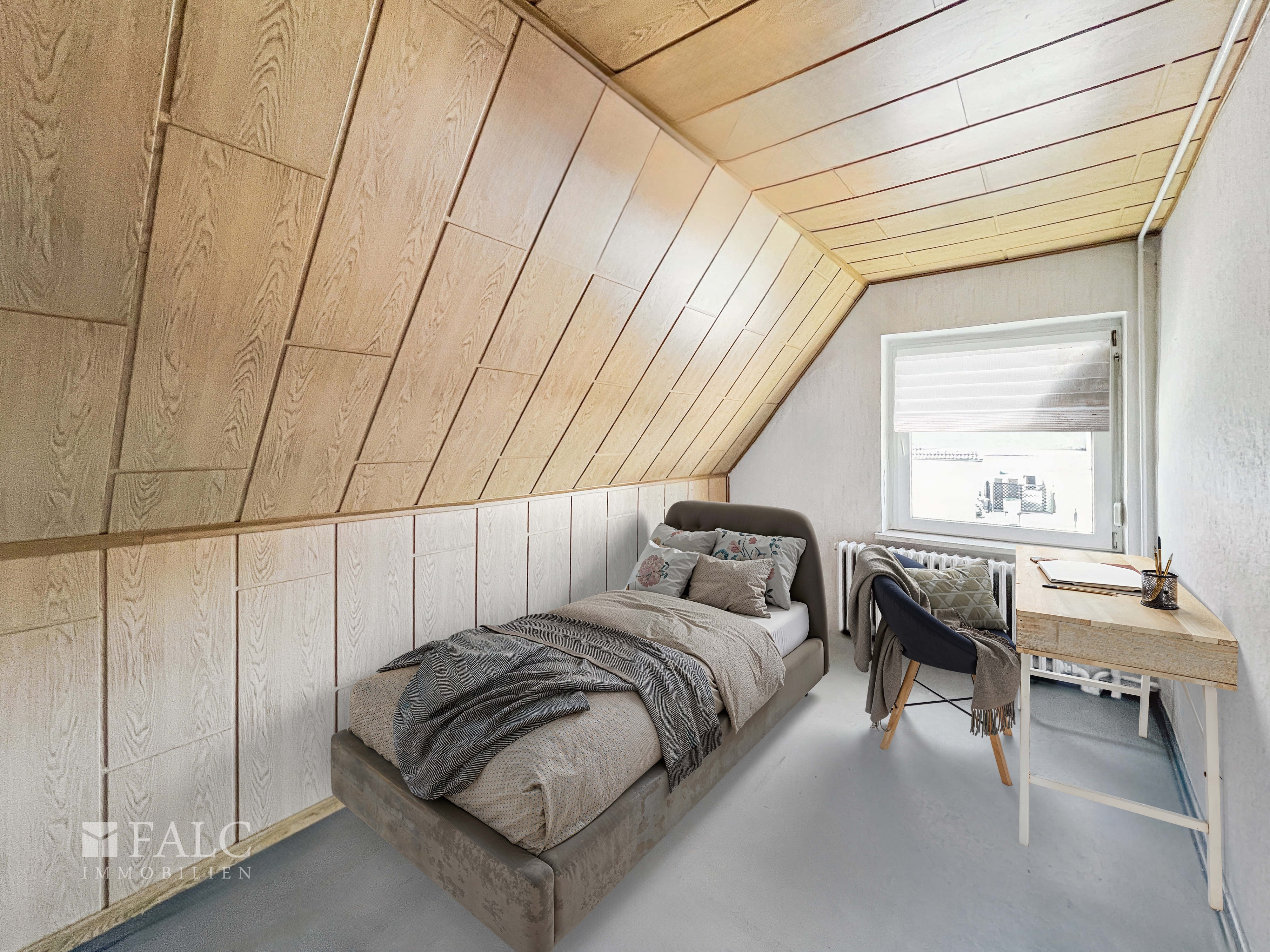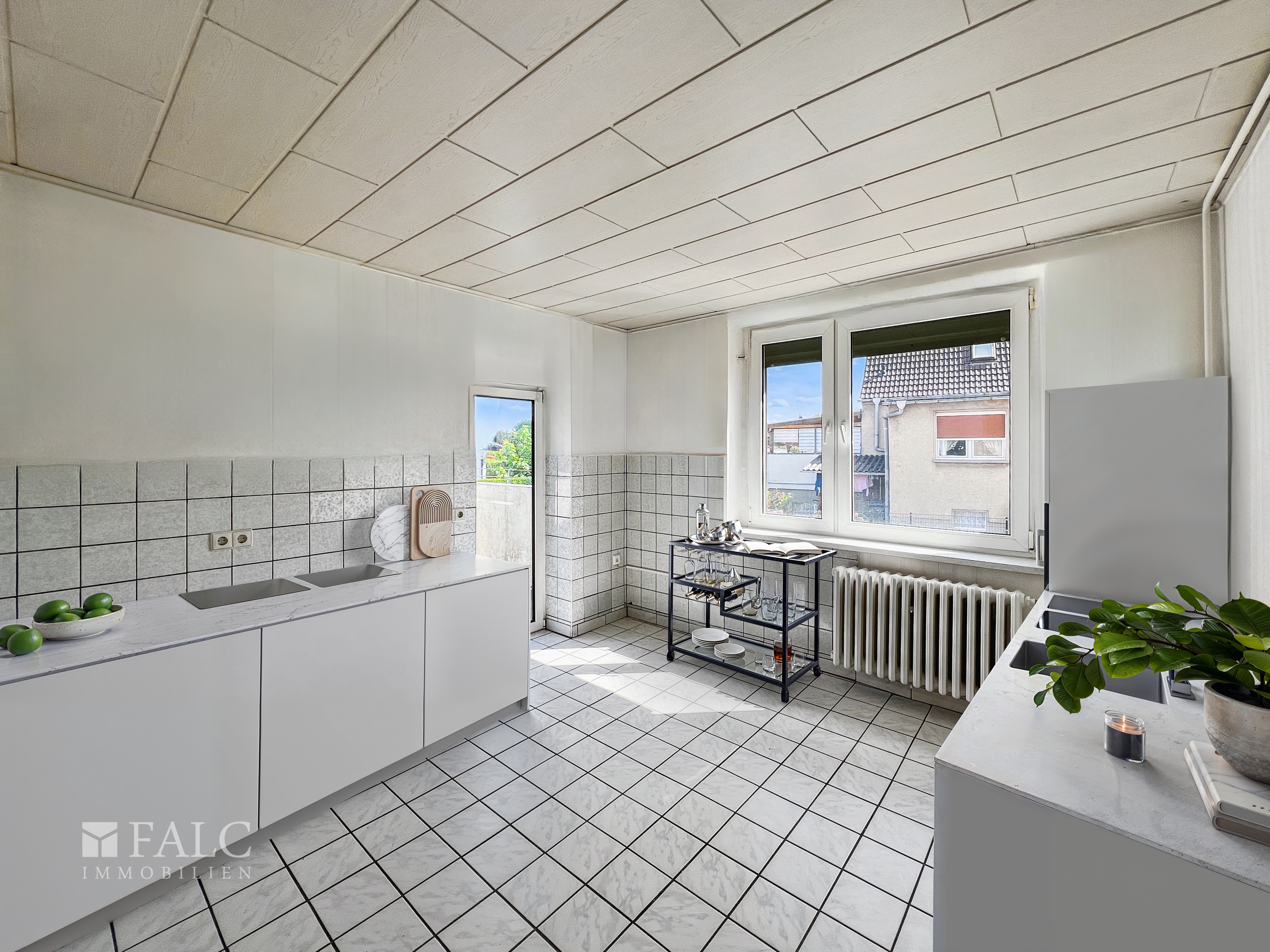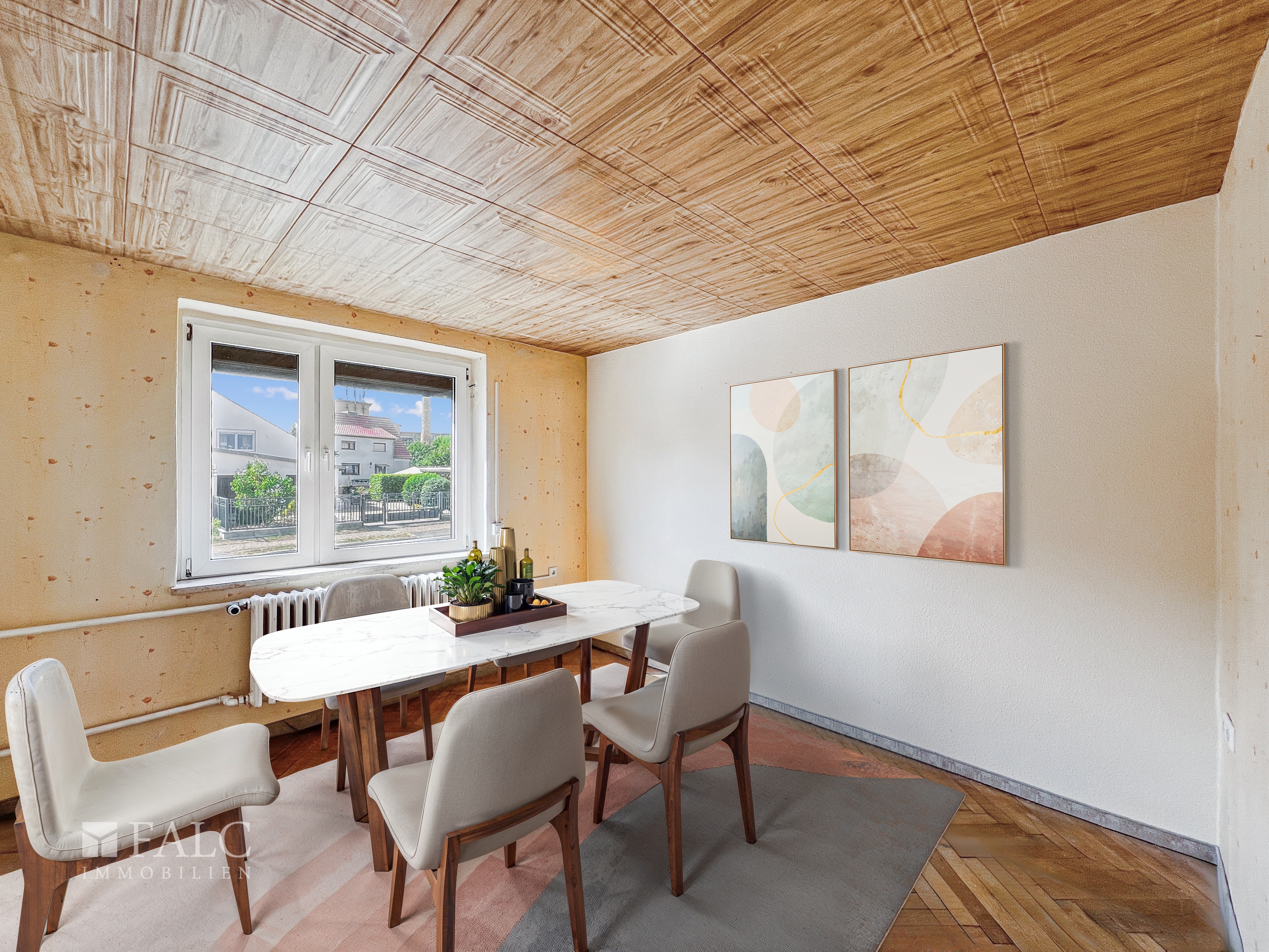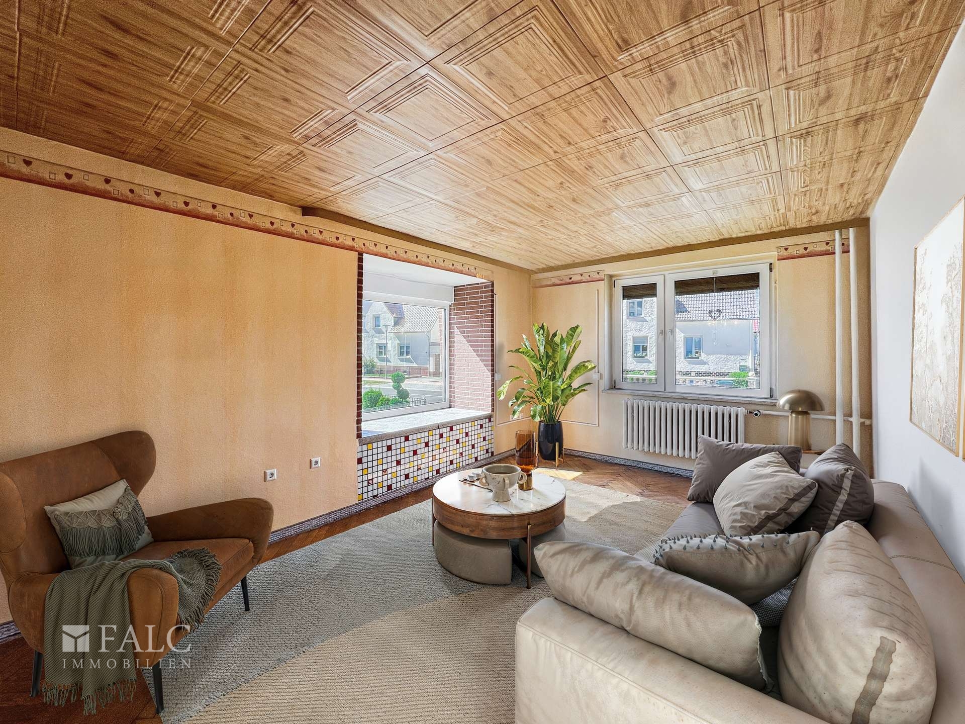 Zur Info. Die Möbel im Wohnzimmer, Esszimmer, Schlafzimmer, Küche, Kinderzimmer und auf der Terrasse sind digital gestaltet worden. Die Beschaffenheit der Räume ist komplett original belassen.