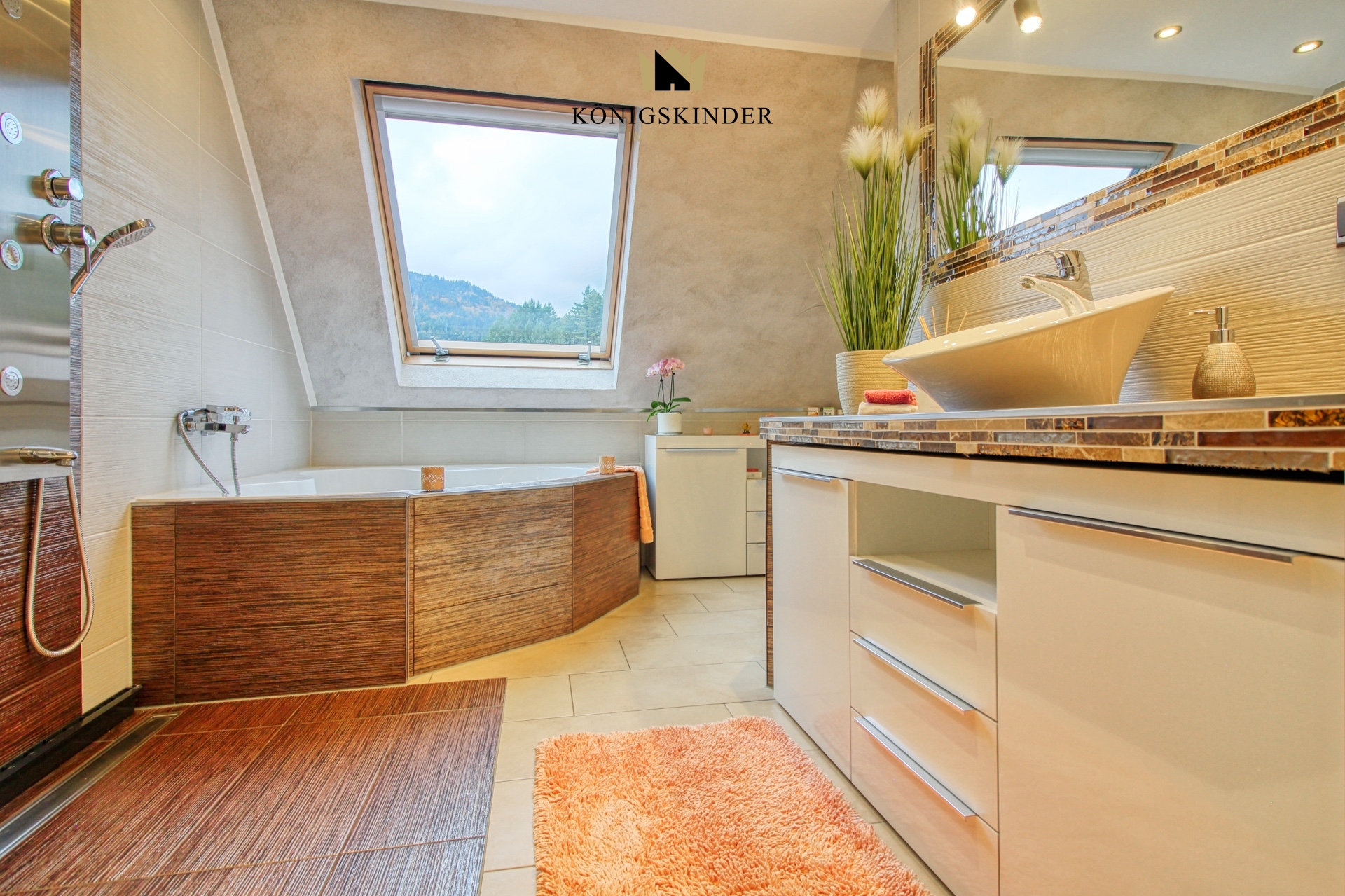 Das Obergeschoss bietet drei helle, harmonisch gestaltete Zimmer und ein großzügiges Badezimmer, das mit Wanne und Dusche zu einem Ort des Rückzugs wird. Auch hier zieht sich das Thema Naturstein konsequent durch – von der Oberfläche bis zur Atmosphäre. Besonders reizvoll: Von der Badewanne aus öffnet sich der Blick in den Sternenhimmel – für Momente purer Ruhe.