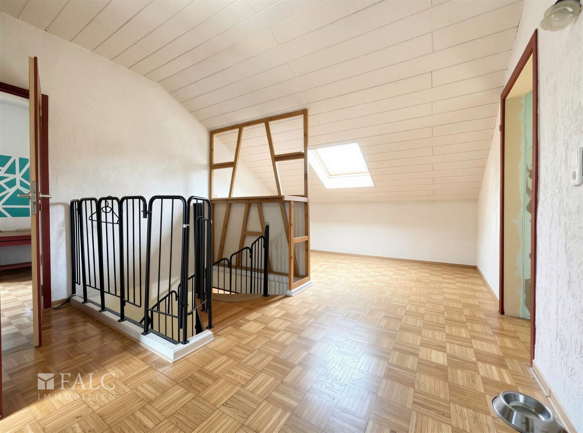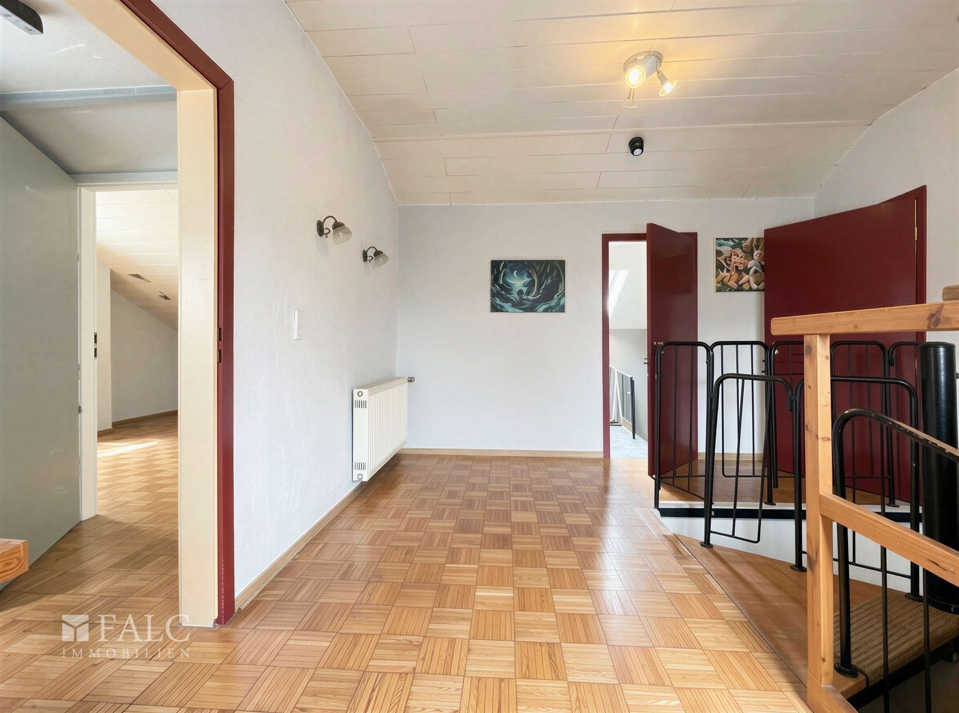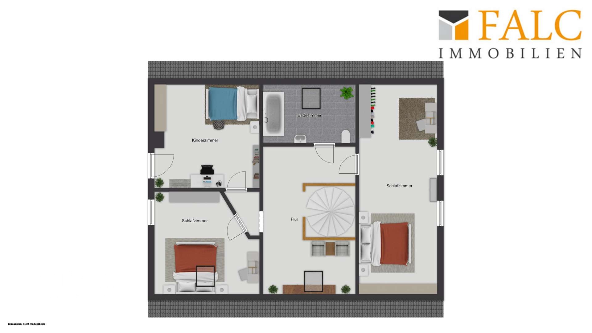 Geradeaus im Eingangsbereich befindet sich eine platzsparende Wendeltreppe, die in das Obergeschoss führt. Dort erschließt ein Flur die Räume der oberen Etage. Geradeaus liegen zwei gut geschnittene Schlafräume, während sich auf der rechten Seite ein weiterer Schlafraum befindet, der sich auch ideal als Arbeits- oder Gästezimmer nutzen lässt. Ebenfalls im Obergeschoss ist ein zweites Badezimmer untergebracht.