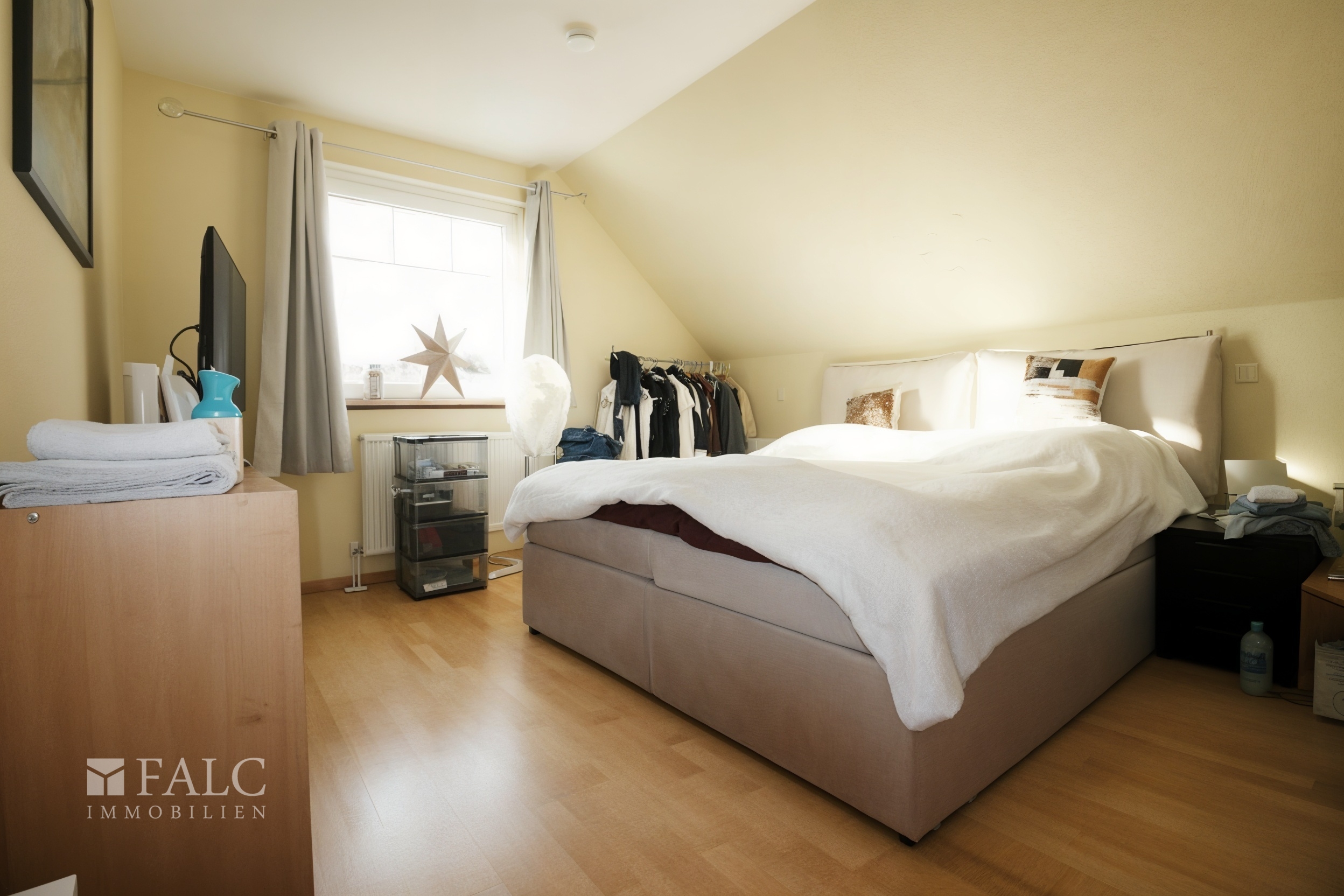 Im Obergeschoss befinden sich zwei großzügige Schlafzimmer, die viel Raum für individuelle Gestaltung bieten. Das Badezimmer ist modern ausgestattet und verfügt über eine Dusche, eine Badewanne sowie ein WC, was den Komfort für die ganze Familie erhöht.