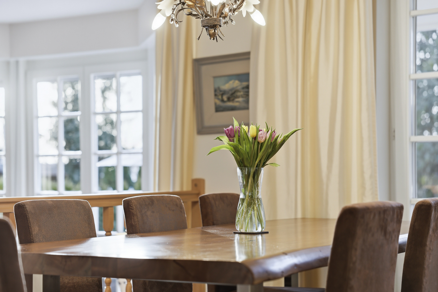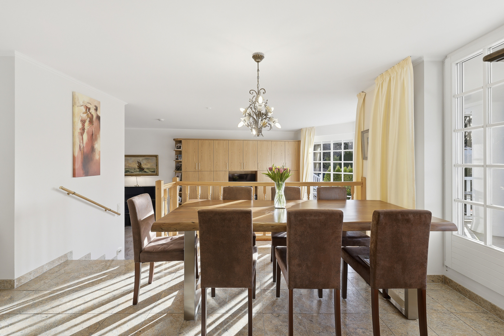 Vom hellen Entrée des Hauses gelangen Sie direkt in den großzügigen Wohnbereich. Der Wohn- und Essbereich mit bodentiefen Holzsprossenfenstern und hohen Decken ist im Split Level gestaltet. Dies sorgt auf allen Ebenen für ein offenes, großzügiges Raumgefühl und spiegelt den einzigartigen Charakter des Hauses wider. Das Wohnzimmer verfügt über einen offenen Kamin mit Delfter Fliesen, der eine warme, stilvolle Atmosphäre schafft. Die hochwertigen Granitböden verbinden zeitlose Schönheit mit ansprechendem Design und sorgen für ein gehobenes Wohnambiente.