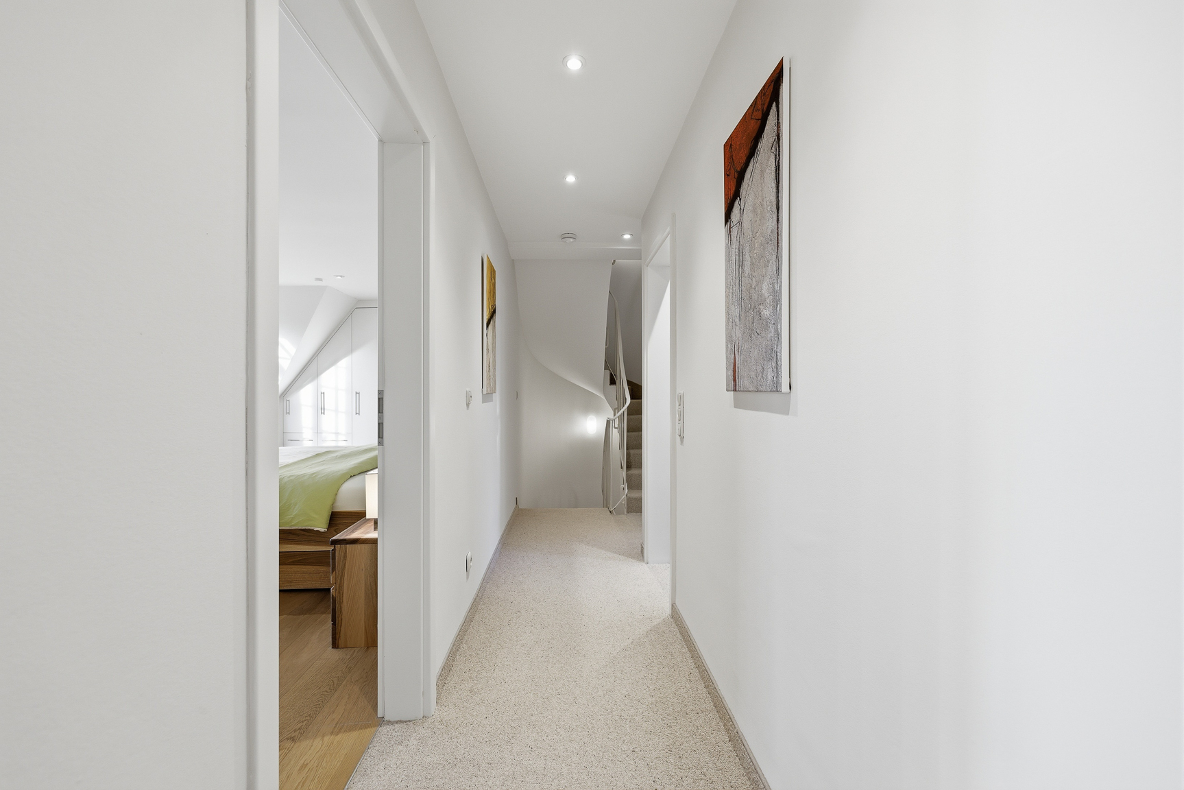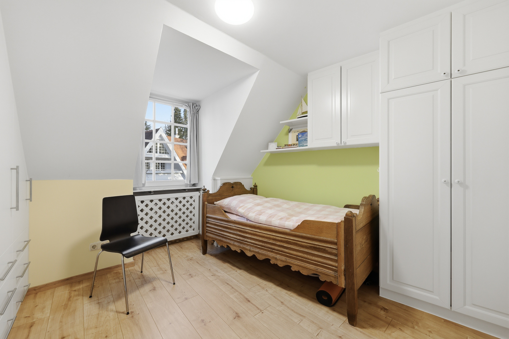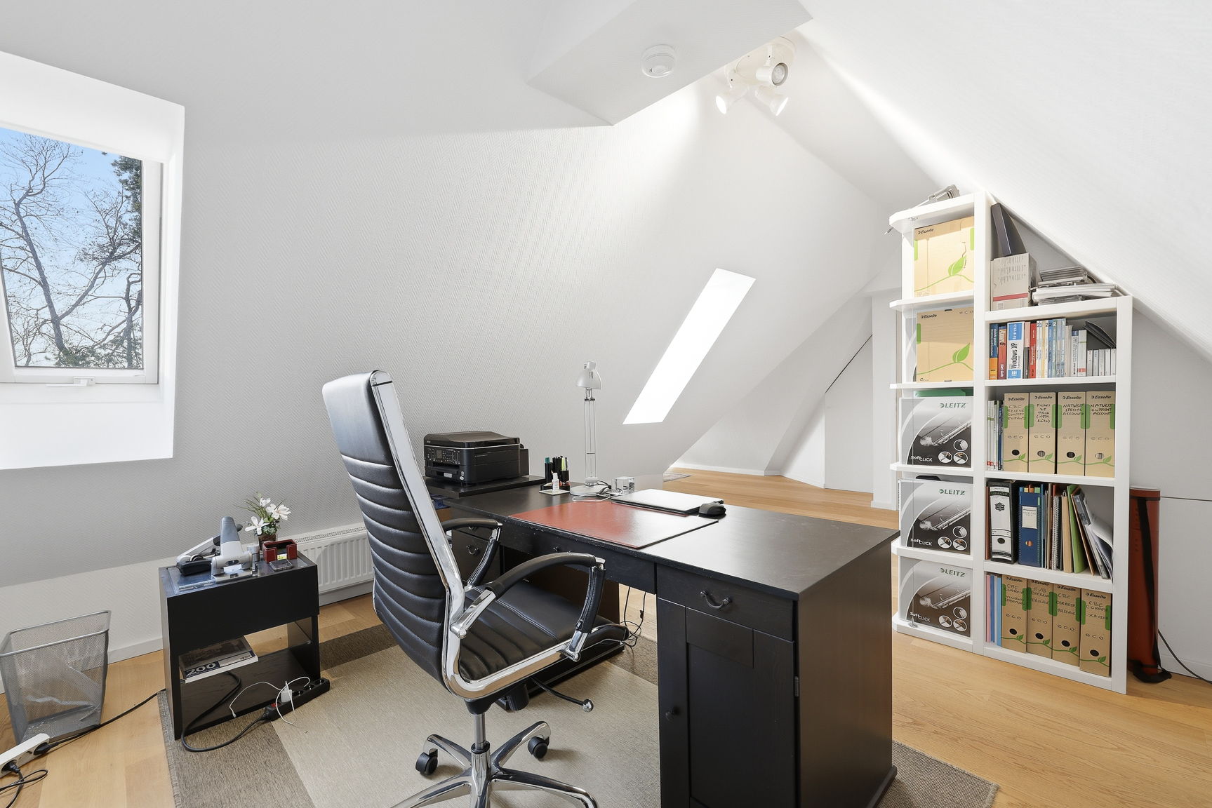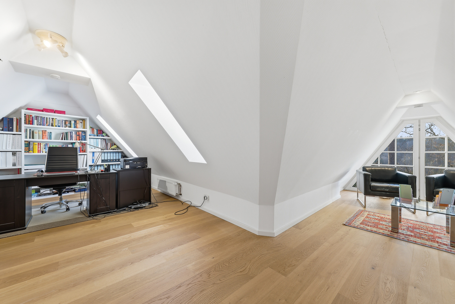 Das ausgebaute Dachgeschoss bietet zusätzliche Flexibilität für ein Büro oder ein Gäste-/Kinderzimmer. Die großen Fenster mit direktem Blick auf das Isarhochufer verleihen diesem Raum einen ganz besonderen Charme.
