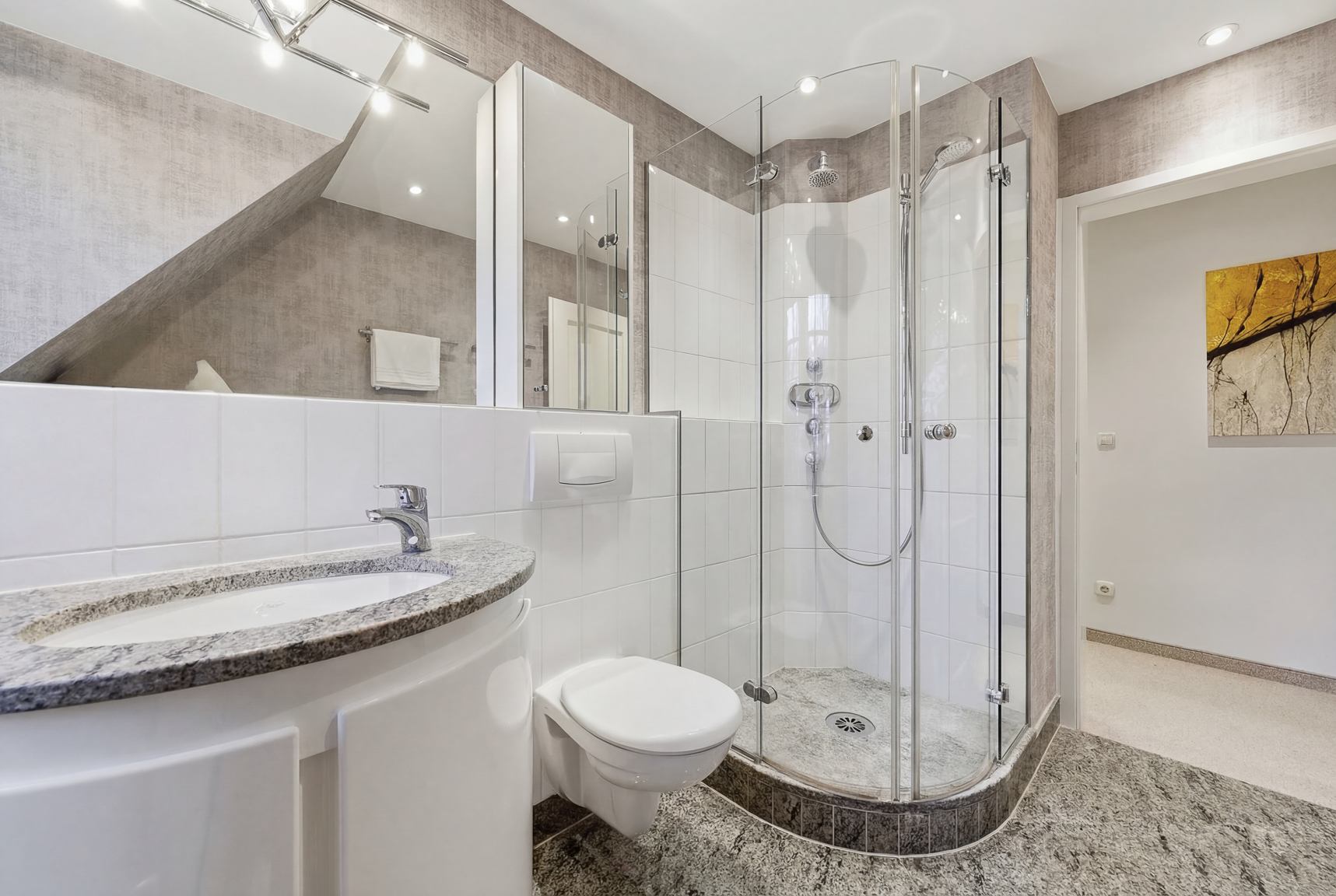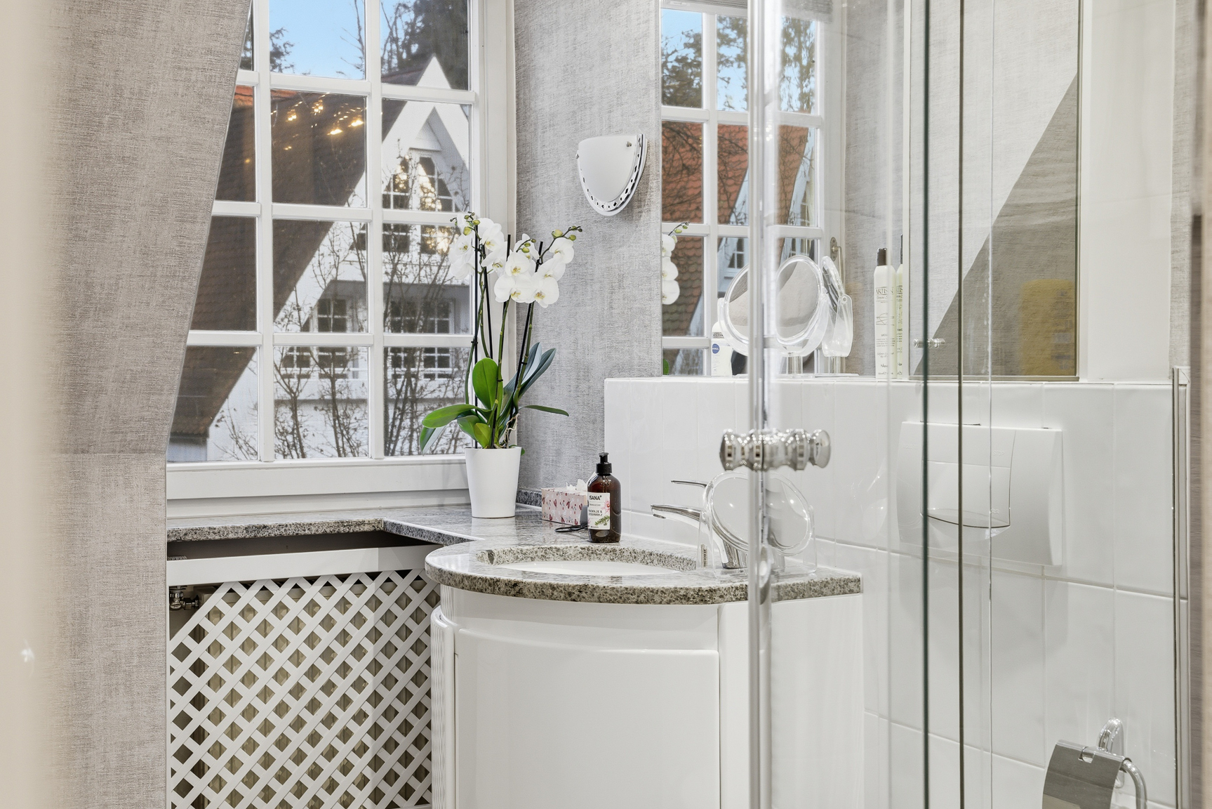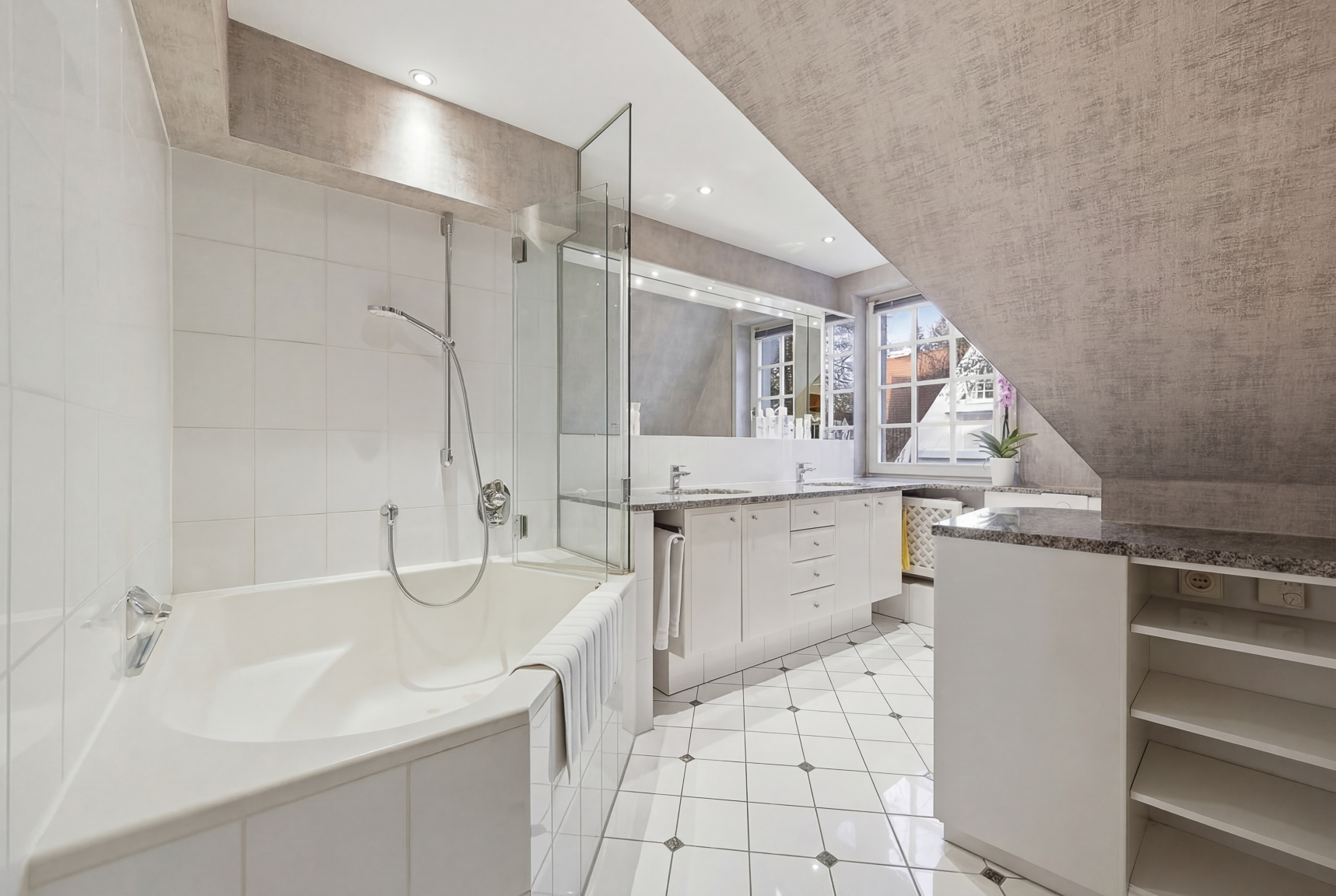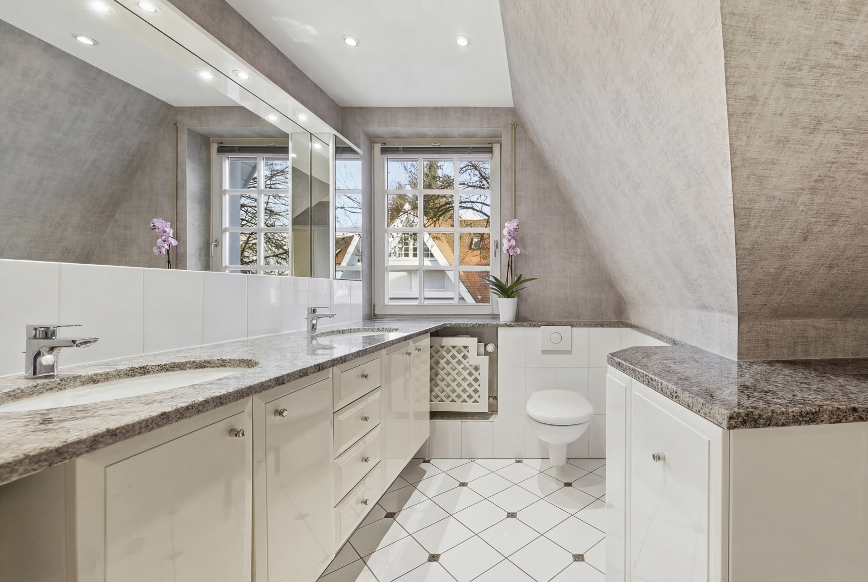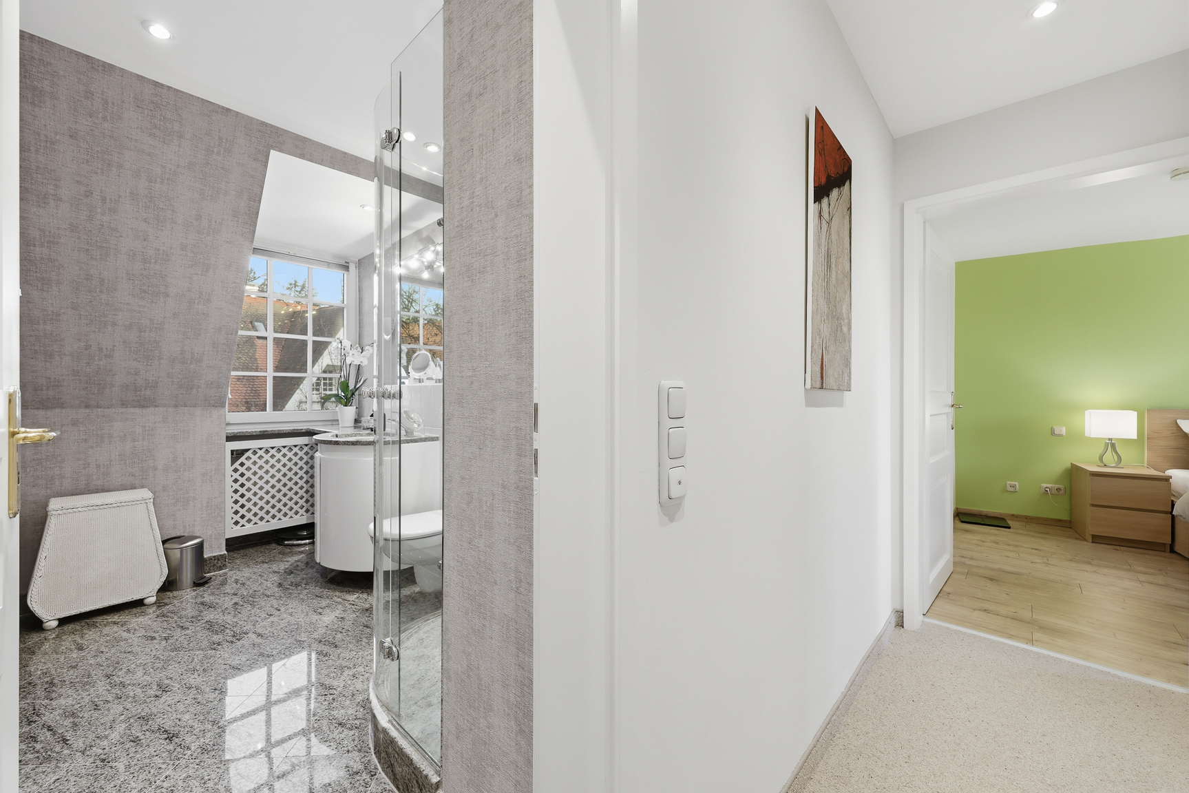 Im ersten Obergeschoss befinden sich außerdem zwei Bäder, die über eine Badewanne sowie eine Dusche, großzügige Doppelwaschbecken sowie eine angenehme Fußbodenheizung verfügen. Edle Granitböden und eine hochwertige und ausgewählte Ausstattung sorgen für ein ganz besonderes Ambiente.
