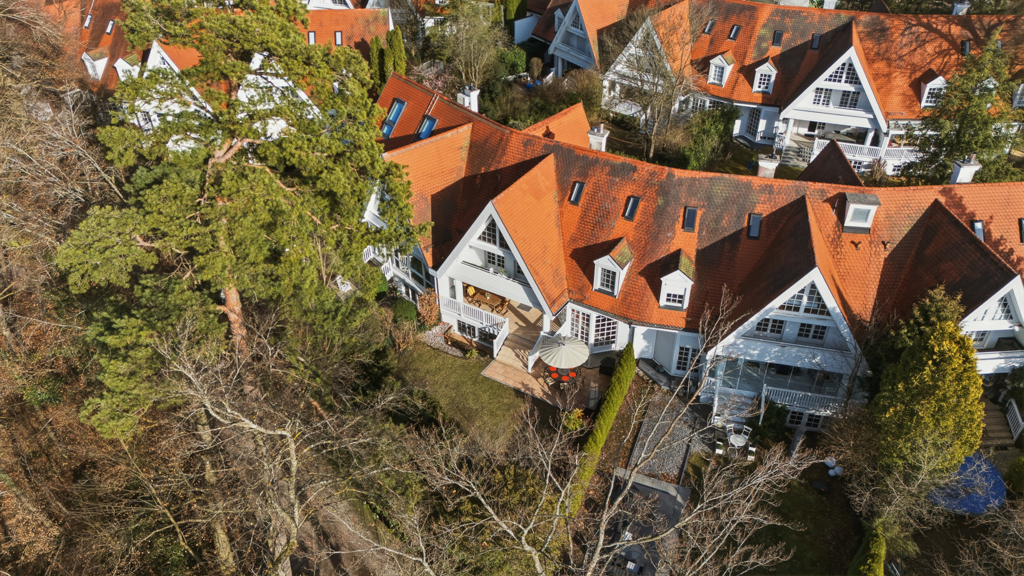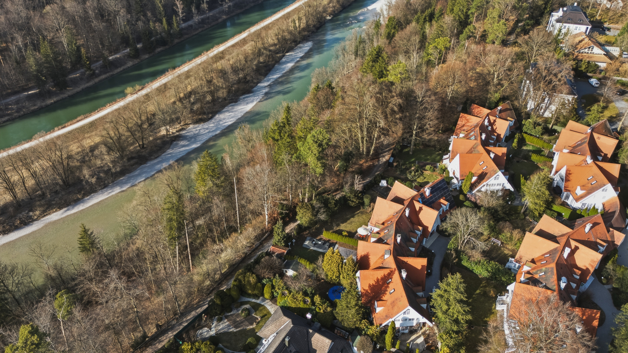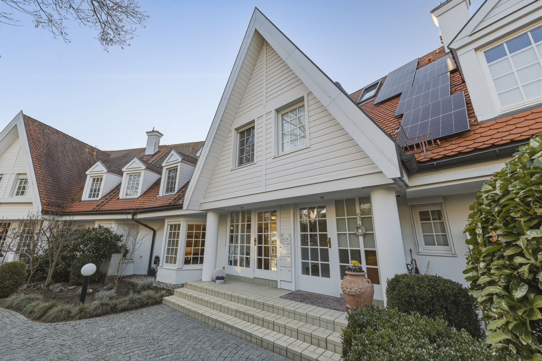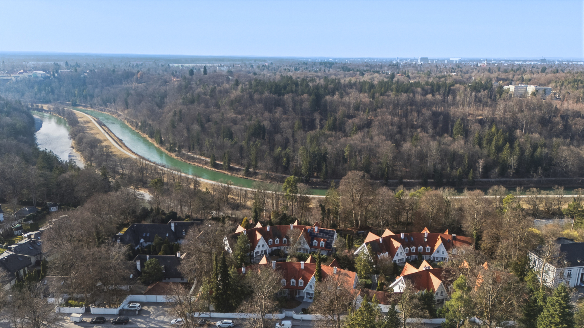 Sie erreichen Ihr Zuhause über einen geschützten Eingang der Anlage, der in das grüne und gepflegte Reihenhausresort führt. Das schöne Haus liegt in erster Lage am Isarhochufer und schafft durch die ansprechende Fassade und die besondere Bauweise im englischen Landhaustil eine ganz besondere Atmosphäre.
