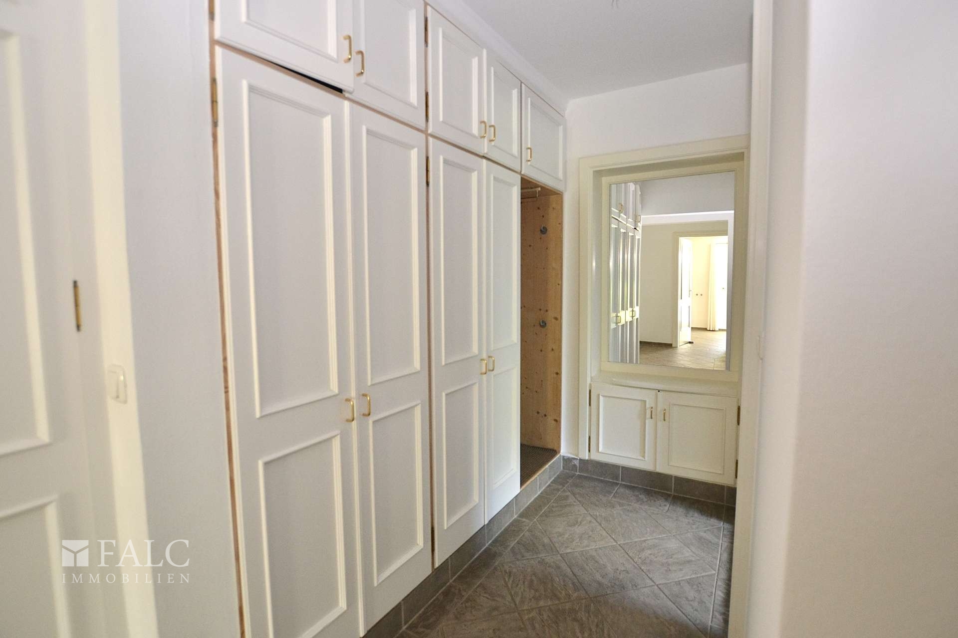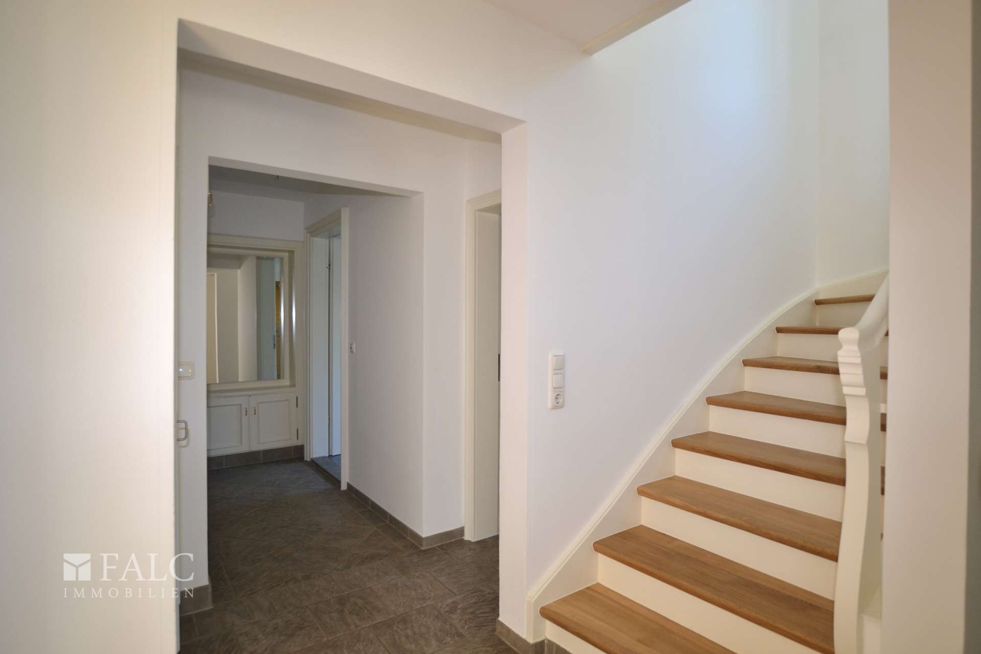 Der Eingangsbereich empfängt Sie mit maßgefertigten Einbauschränken und einer Sicherheitstür von Bayerwald. Hochwertige weiße Holzfenster, cremeweiße Innentüren und edles Eichenparkett verleihen allen Etagen eine helle, warme Atmosphäre.