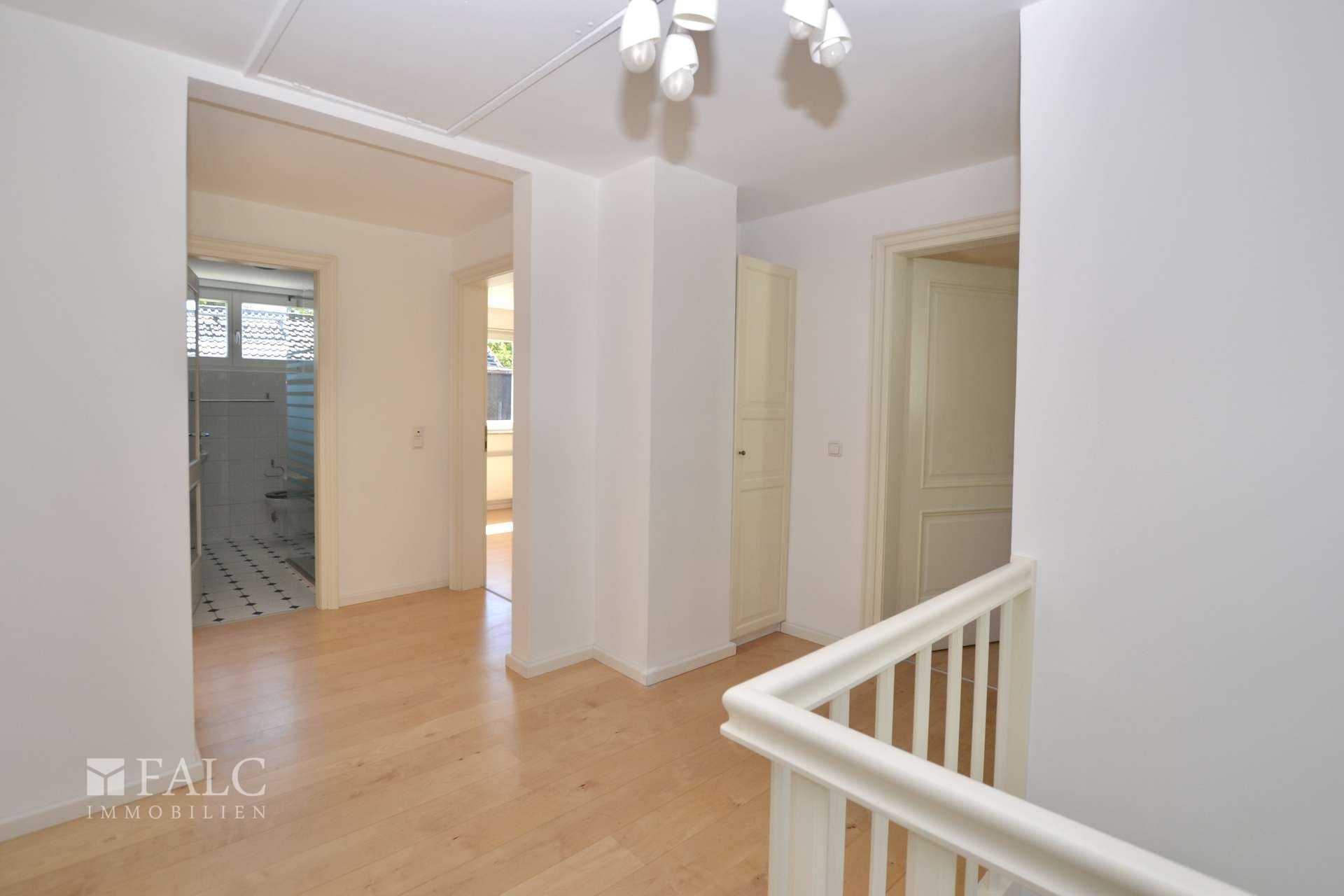Im Obergeschoss befinden sich alle Schlafzimmer, ein separates Gäste-WC sowie ein elegantes Tageslichtbad mit bodenebener Dusche und Spiegeltür. Von zwei der Schlafzimmer aus gelangt man zudem direkt auf einen sonnigen Balkon, der einen schönen Blick ins Grüne bietet. Die maßgefertigte Treppe fügt sich harmonisch in das stilvolle Gesamtbild ein.