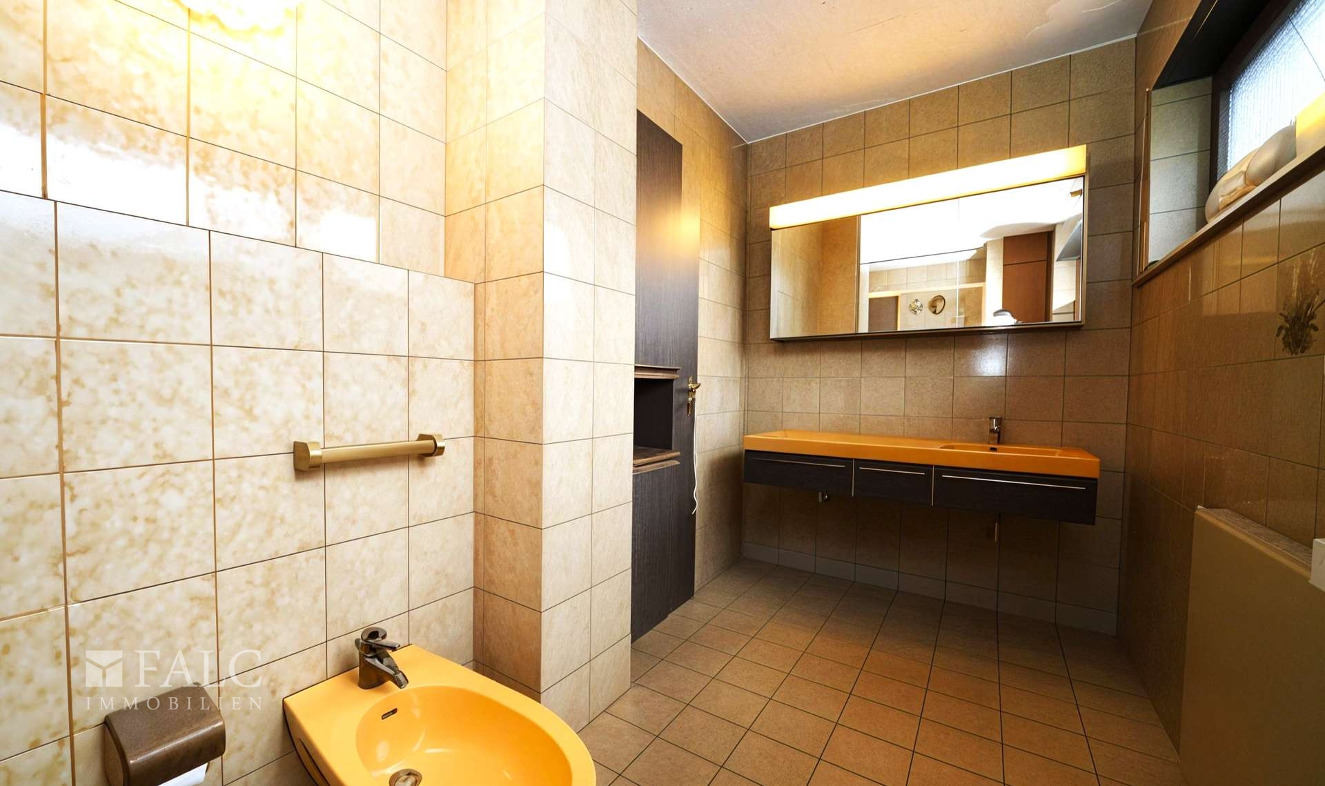 Das Badezimmer im Obergeschoss ist pflegeleicht gefliest und ausgestattet mit Doppelwaschbecken, WC und großer Duschkabine. Das Bad im Dachgeschoss verfügt ebenfalls über ein WC sowie eine Badewanne. Dieser befindet sich in einem derzeit renovierungsbedürftigen Zustand.