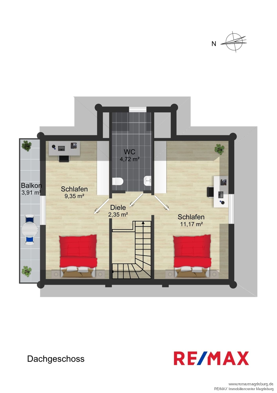 Das Dachgeschoss beinhaltet drei Schlafzimmer und ein Wannenbad mit Tageslicht. Jedes Zimmer hat Zugang zu dem überdachten Giebel-Balkon. Der Dachboden bietet zusätzlichen Stauraum.