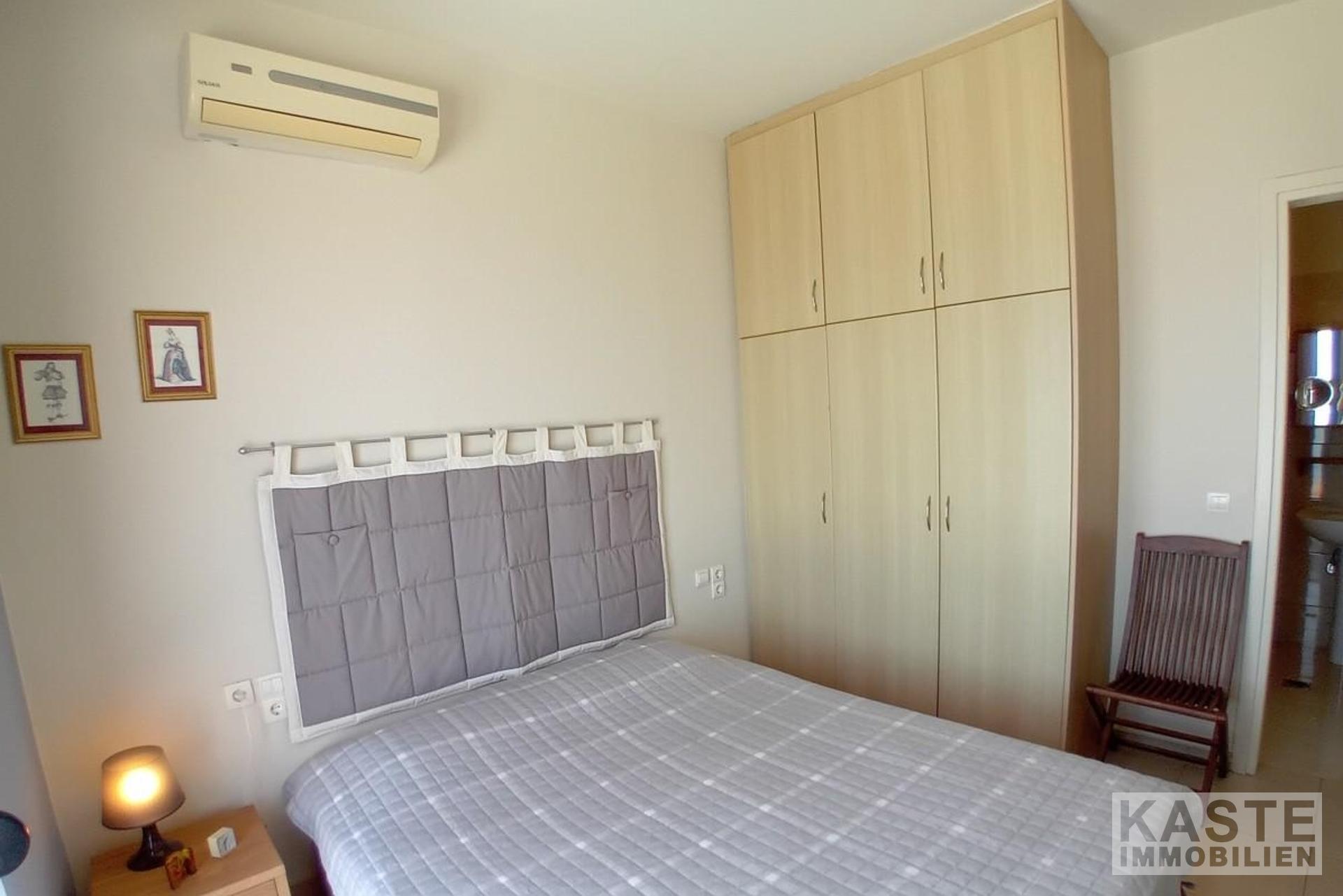 In der ersten Etage befinden sich zwei Schlafzimmer, jeweils mit eigenem Bad. Von dem großen Balkon, der von beiden Schlafzimmern zugänglich ist, können Sie einen atemberaubenden Meerblick genießen.