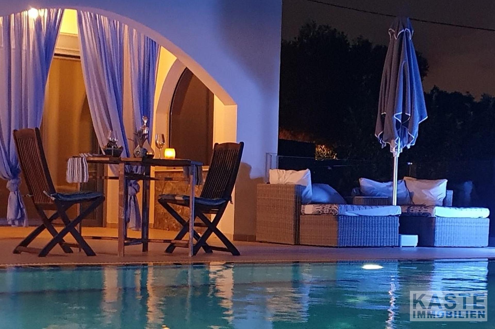 Das Haus ist mit Klimaanlagen ausgestattet, die sowohl zum Heizen als auch zum Kühlen verwendet werden können. Zusätzlich bietet eine Öl-Zentralheizung Komfort im Winter, sodass Sie das ganze Jahr über angenehm leben können. Das Grundstück ist eingezäunt und verfügt über eine Sicherheitskamera, auf die Sie per Telefon zugreifen können, wenn Sie nicht vor Ort sind. Außerdem gibt es Wassertanks für Haus und Pool sowie eine Solaranlage für Warmwasser.