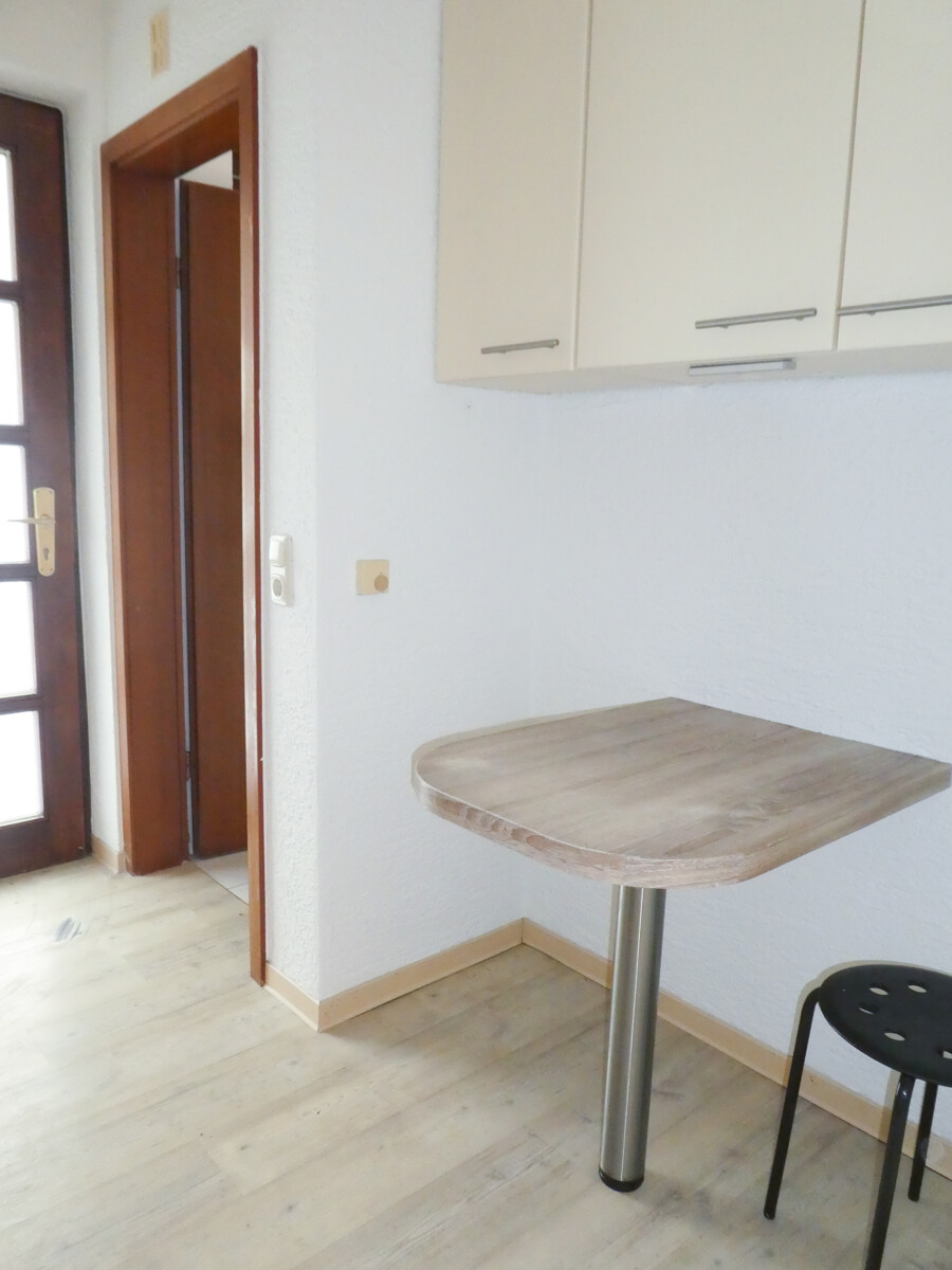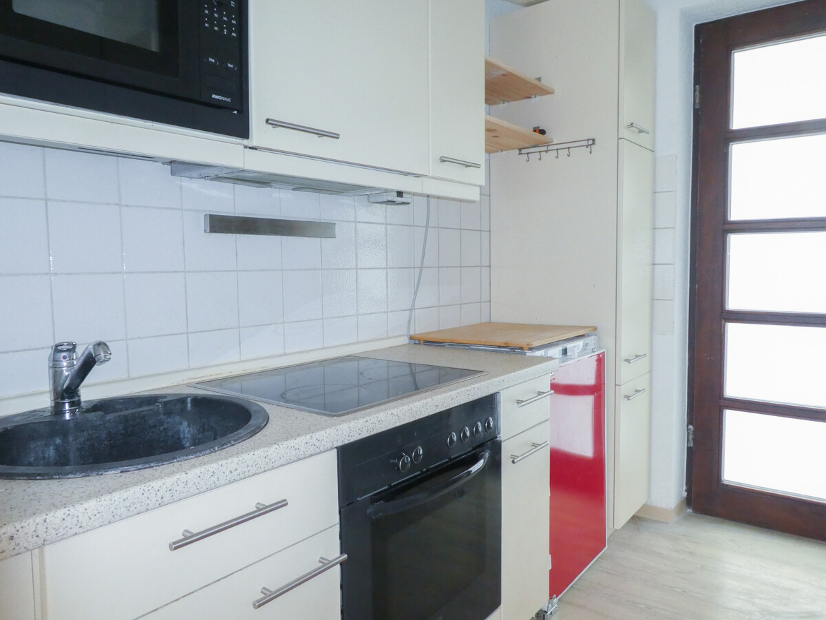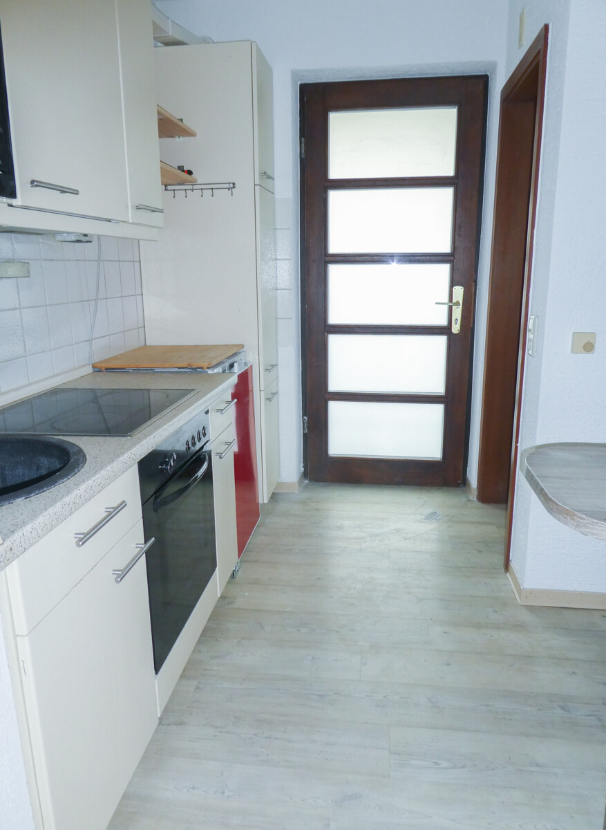 Die Küche ist separat gehalten und mit einer Einbauküche ausgestattet. Helle Fronten, Arbeitsfläche sowie Elektrogeräte wie Kochfeld und Backofen sind vorhanden. Ein kleiner Essplatz lässt sich hier ebenfalls integrieren.