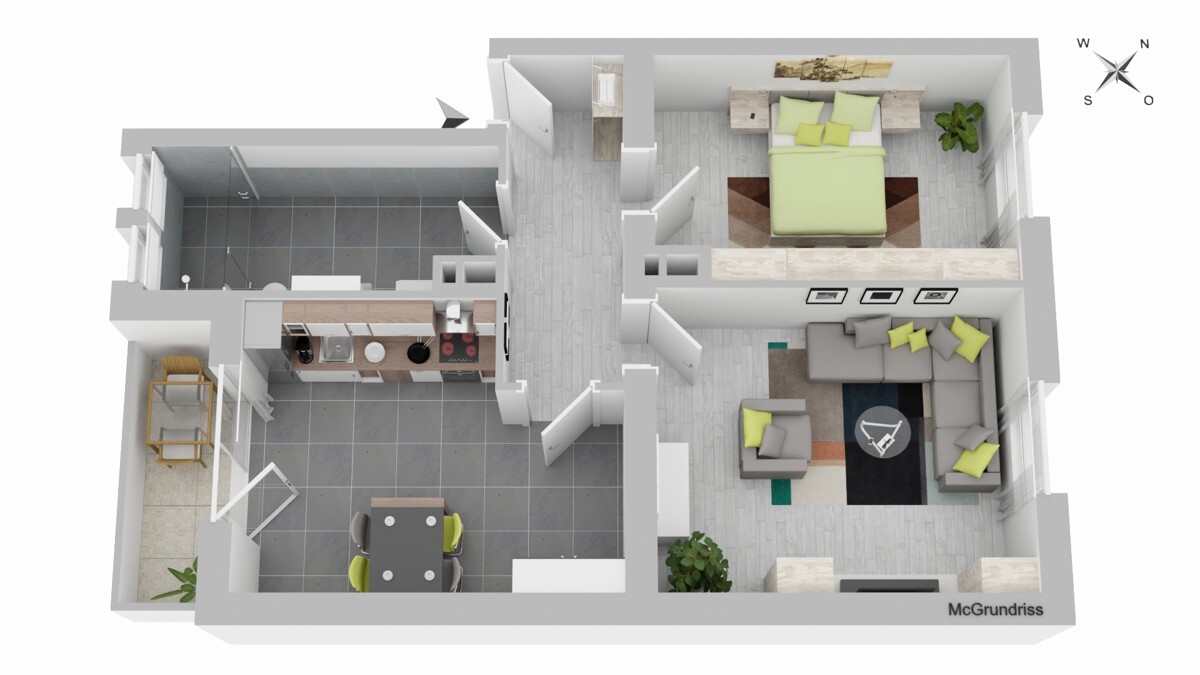 Die Wohnung überzeugt durch ihre praktische Raumaufteilung und helle Atmosphäre. Auf 58 m² verteilen sich ein Wohnzimmer, ein gemütliches Schlafzimmer, eine moderne Küche mit Einbauküche und Zugang zum Balkon sowie ein renoviertes Tageslichtbad. Der Balkon bietet zusätzlichen Raum zum Entspannen und rundet das attraktive Wohnambiente ab.