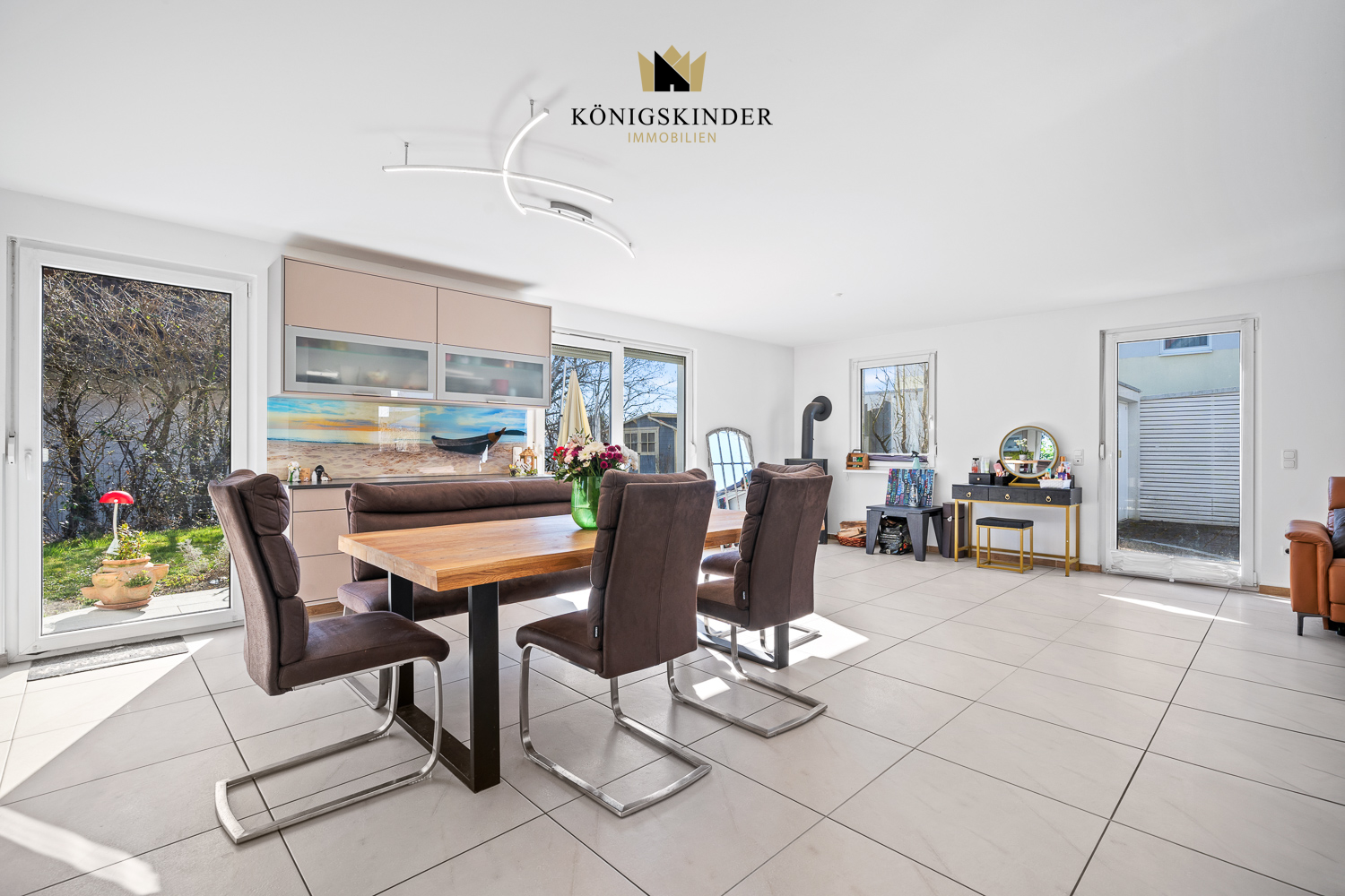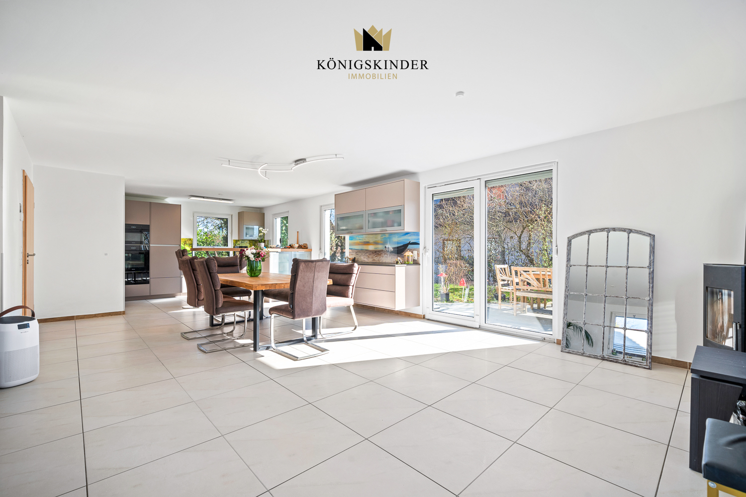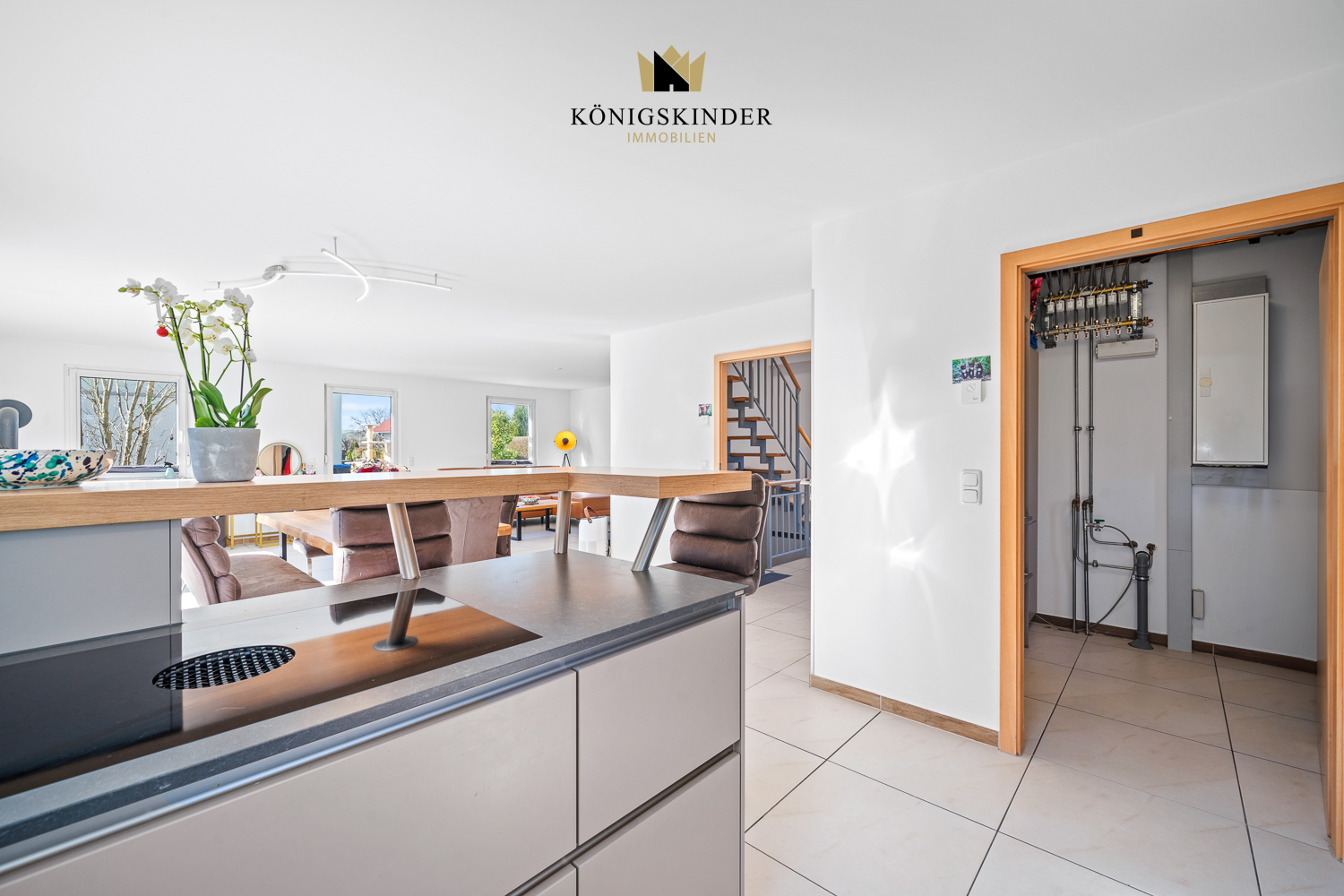 Im Erdgeschoss befindet sich der große Wohn/Essbereich mit Schwedenofen sowie eine sehr hochwertige offene Küche mit Theke und Speisekammer.