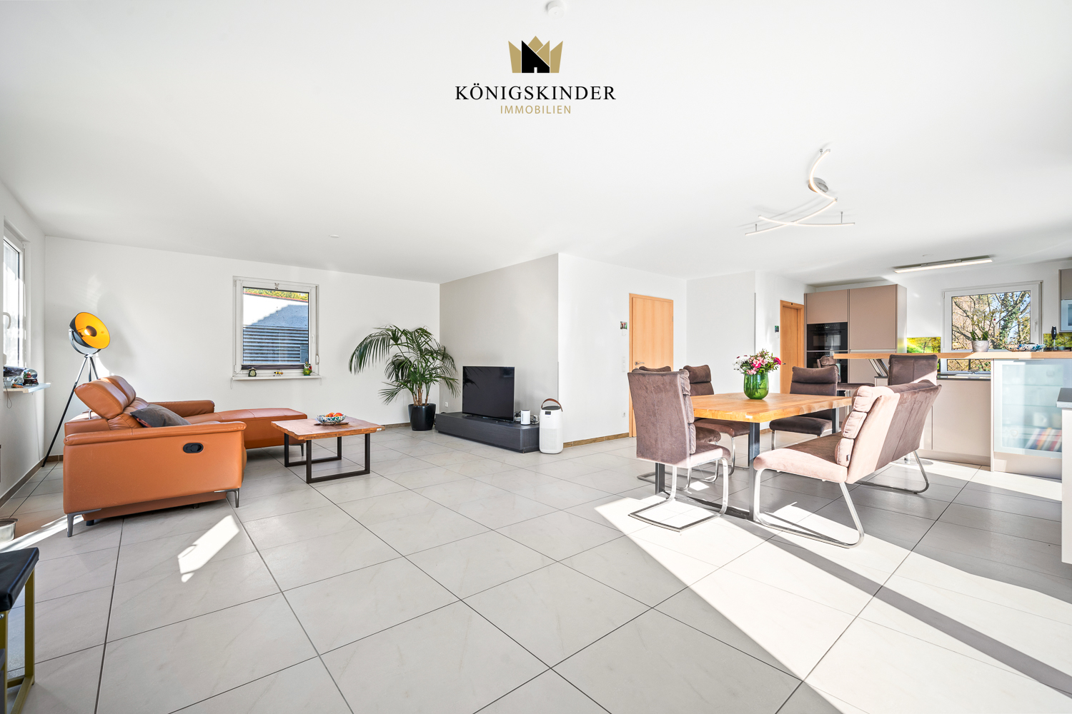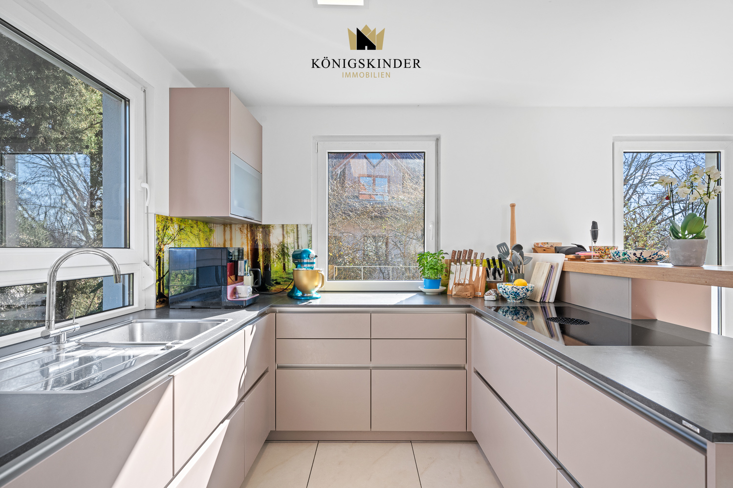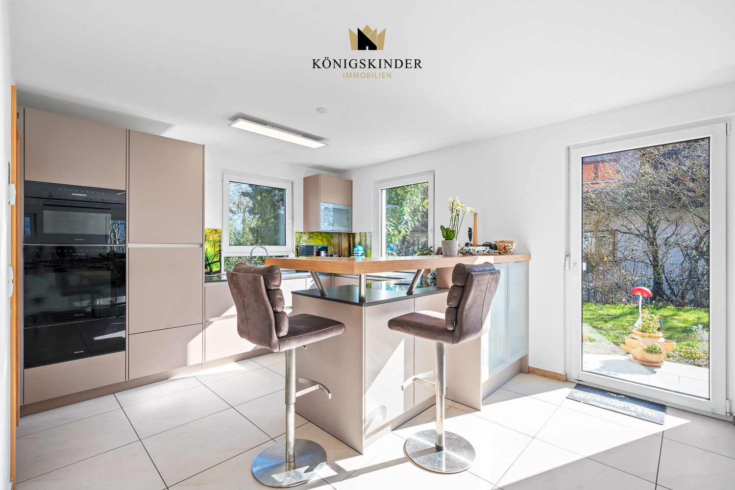 Im Erdgeschoss befindet sich der große Wohn/Essbereich mit Schwedenofen sowie eine sehr hochwertige offene Küche mit Theke und Speisekammer.