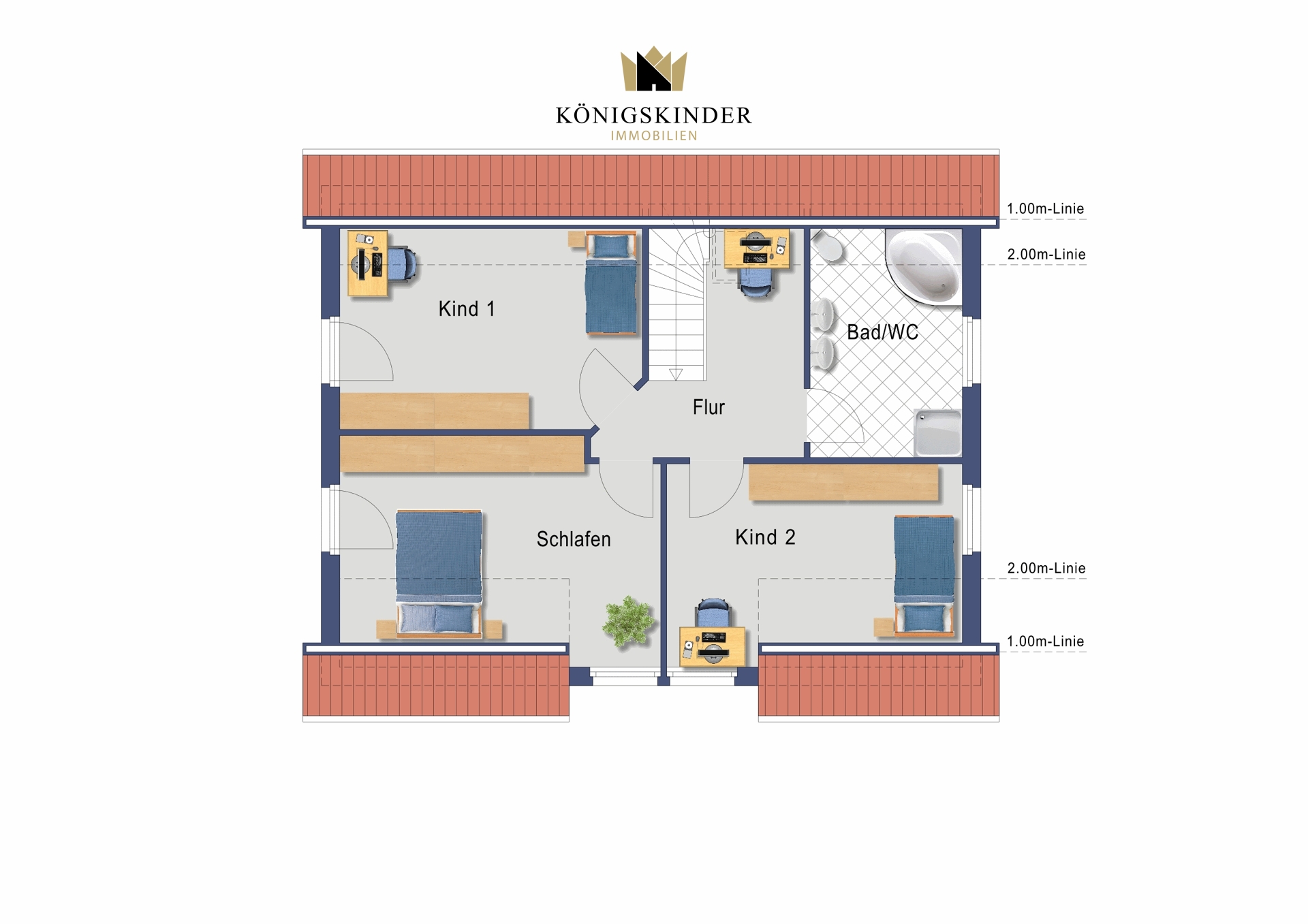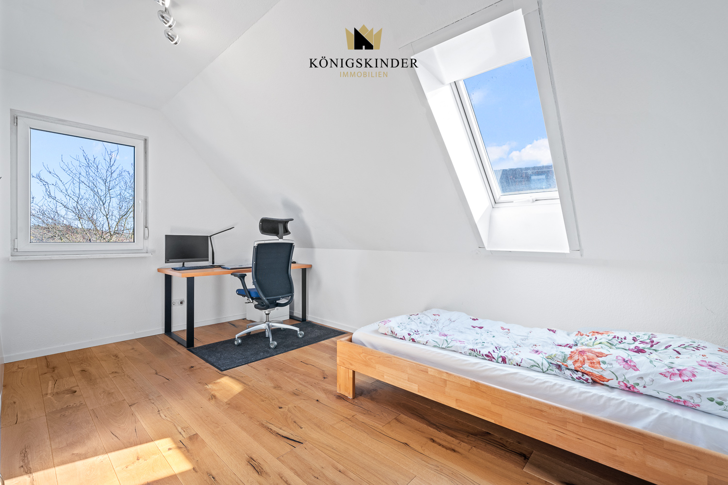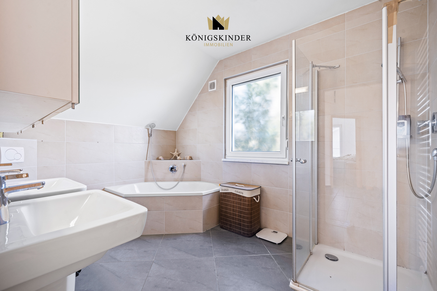 Im Dachgeschoss befinden sich 3 große Schlafzimmer sowie das Hauptbadezimmer mit 2 Waschbecken, WC, Wanne und Dusche.