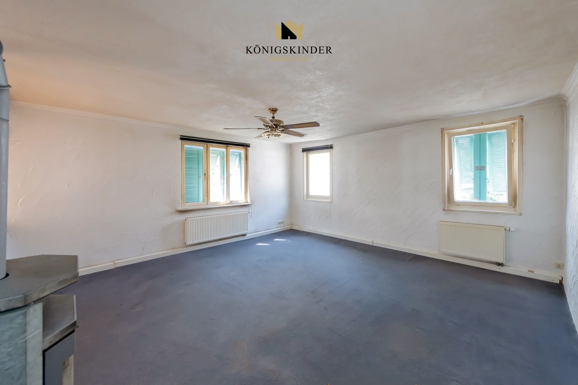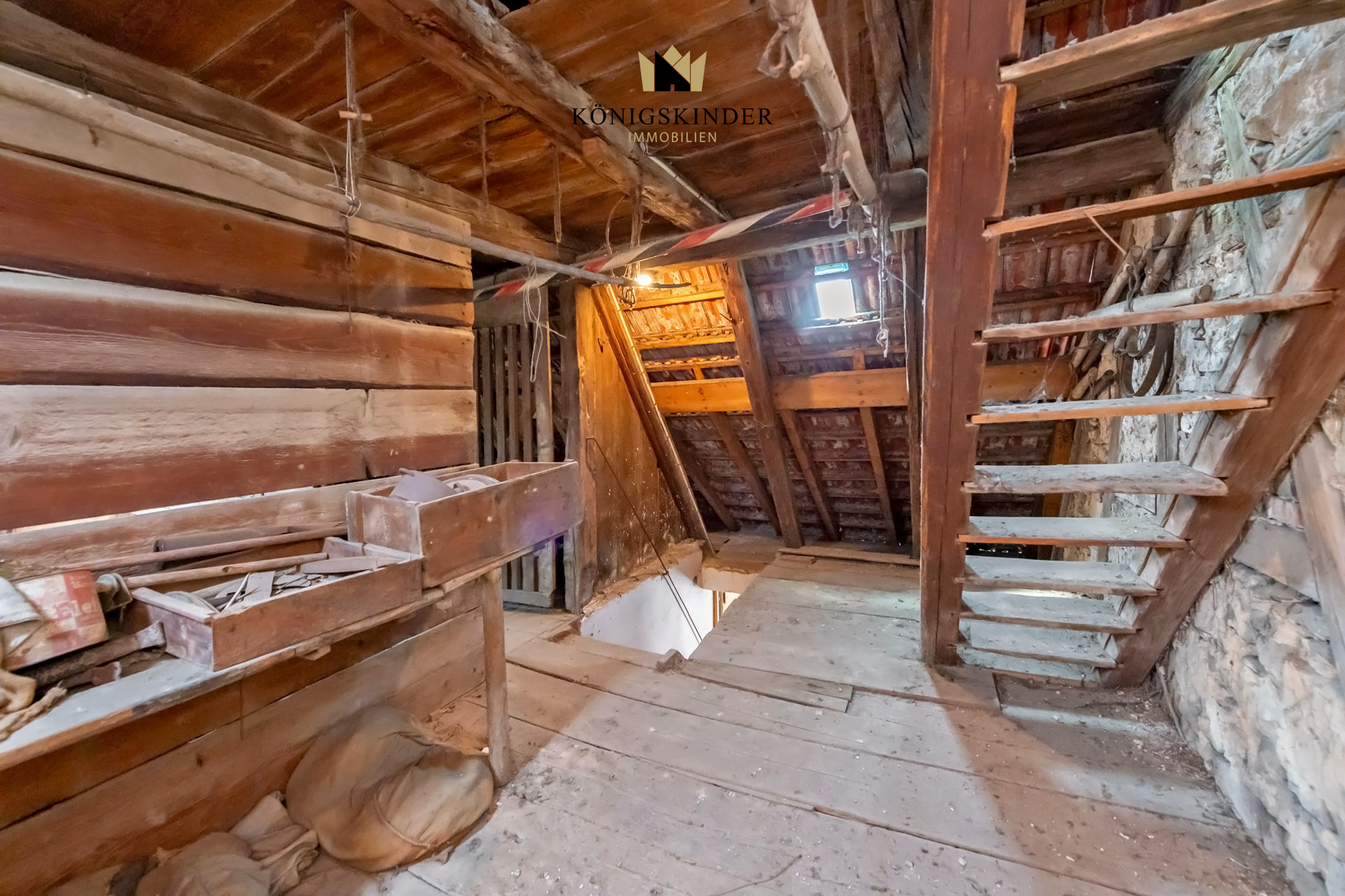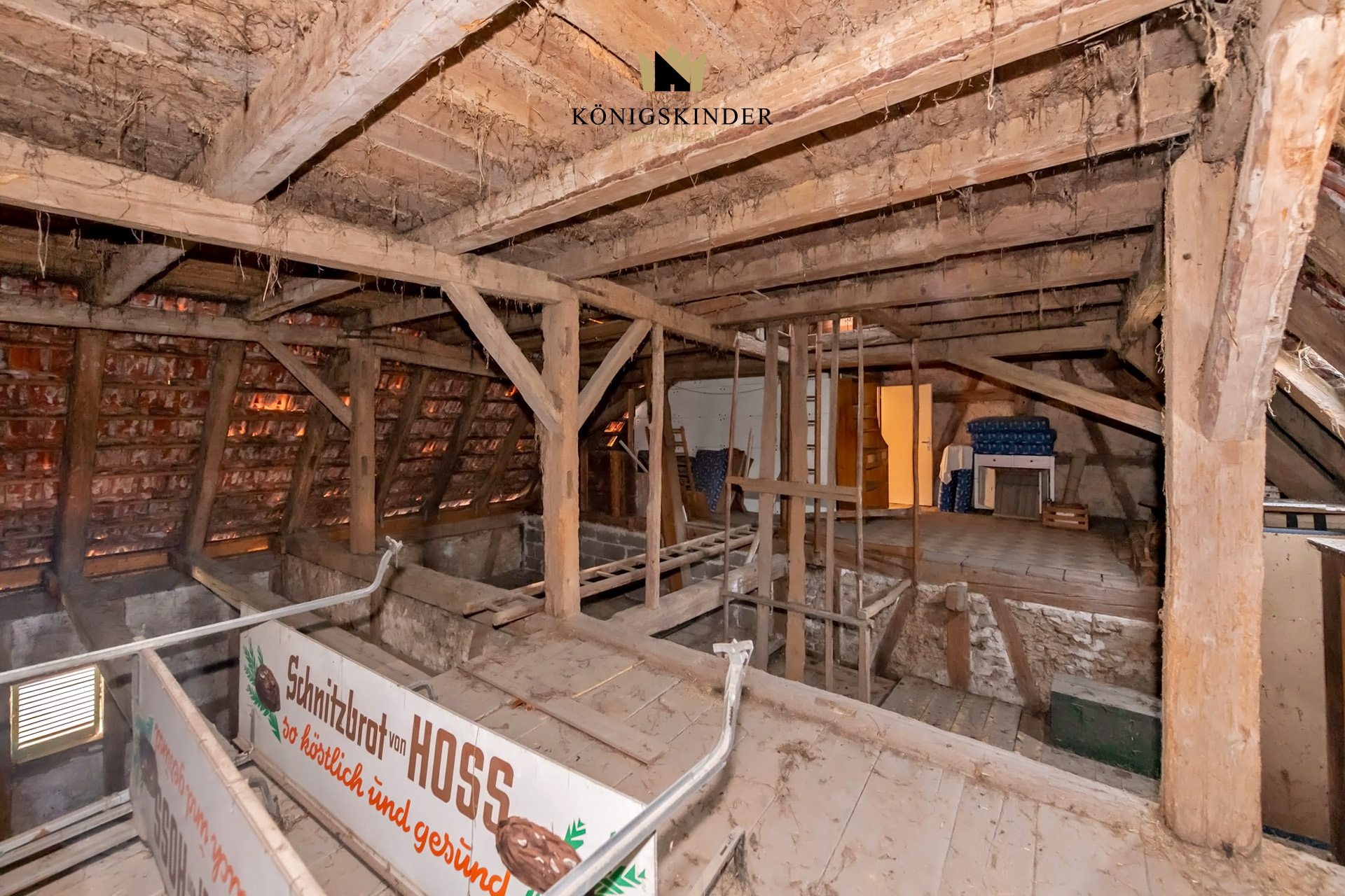 Raum für Ihre Visionen Das Innere präsentiert sich weitgehend im ursprünglichen Zustand – ein seltener Ausgangspunkt für eine Sanierung nach individuellen Vorstellungen. Der historische Dachstuhl ist erhalten, lediglich das erste Dachgeschoss wurde teilweise ausgebaut. Damit eröffnet sich die Möglichkeit, Tradition und moderne Wohnideen harmonisch zu verbinden.
