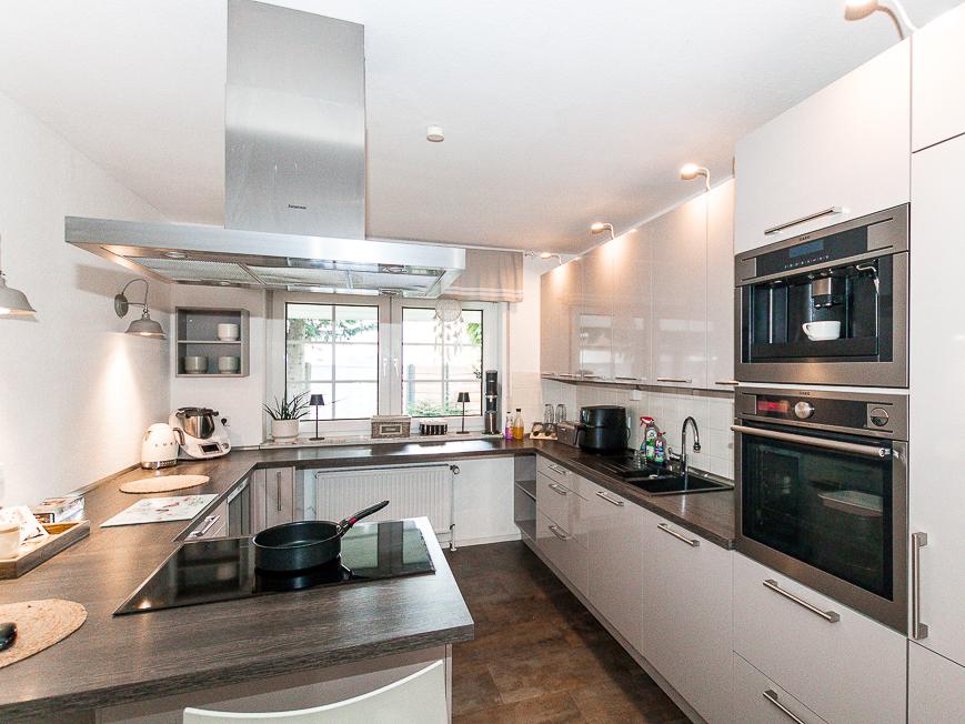 Die moderne Küche grenzt direkt an – großzügig genug für gemeinsame Kochabende, durchdacht genug für das Familienleben. Eine Theke lädt zur schnellen Zwischenmahlzeit ein. Ebenfalls im Erdgeschoss: ein Gäste-WC.
