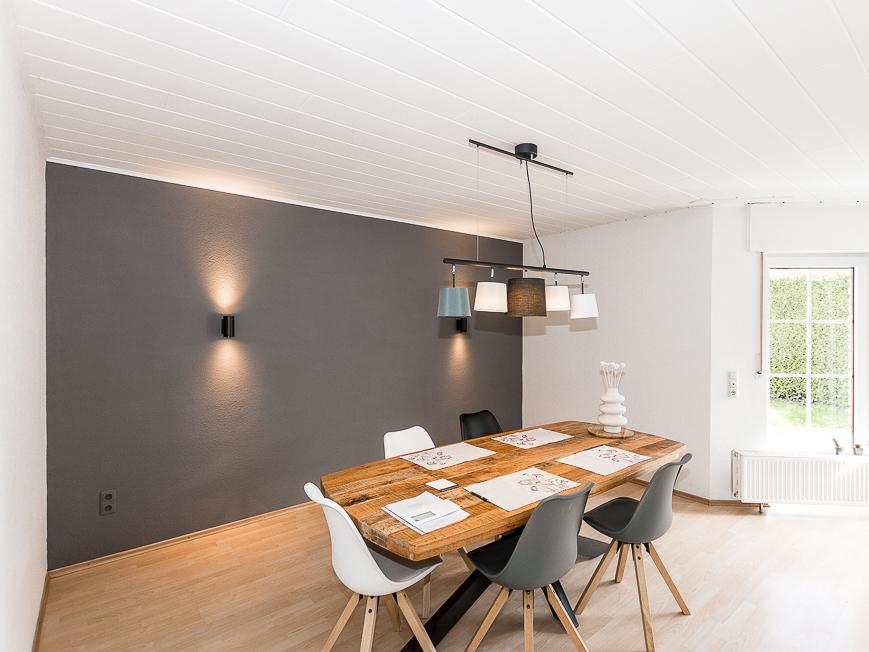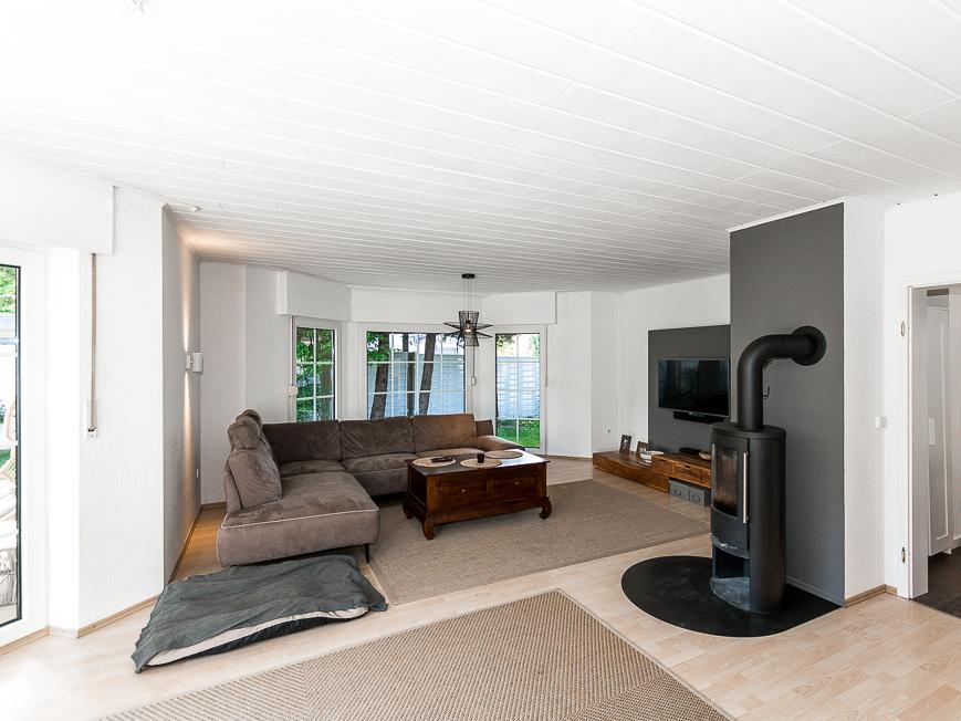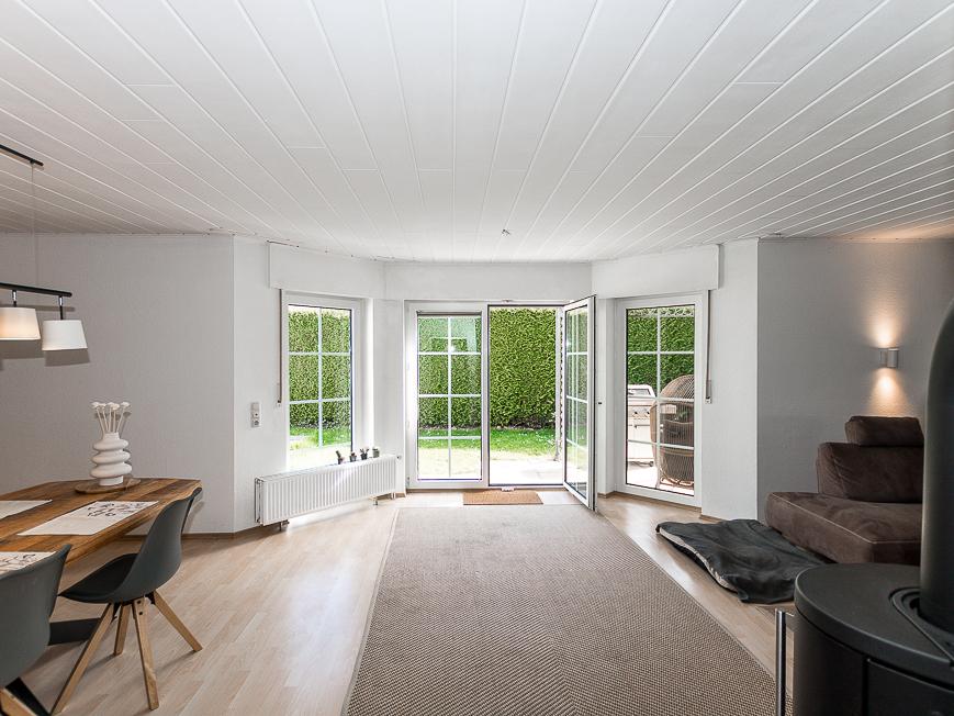 Der offen gestaltete Wohn- und Essbereich mit zwei verglasten Erkern, Kaminofen und viel Tageslicht ist das Herzstück des Hauses. Hier wird gegessen, gelacht, gespielt – und durch die bodentiefen Fenster schweift der Blick ins Grüne. Sofalandschaft, großer Esstisch und alles, was Ihr Herz begehrt, kommen auf über 45 m² spielend unter.