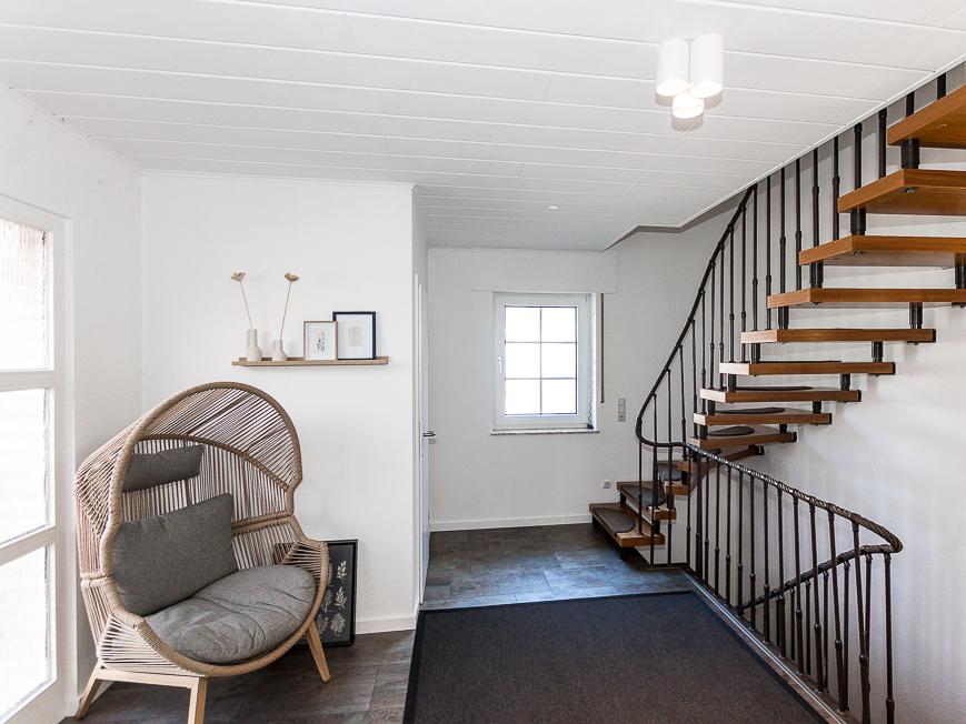 In dieser Etage finden Sie Laminat in Fliesenoptik in der Küche, Diele und im Gäste-WC.