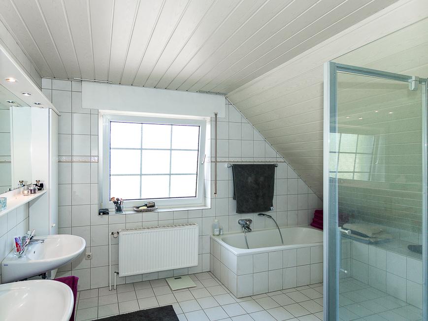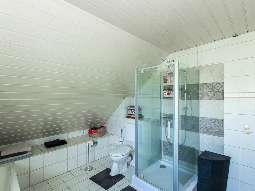 In den restlichen Räumen wurde klassisches Laminat verlegt – dies trifft auch für das Dachgeschoss zu. Lediglich im Bad des DG finden sich weiße Wand- und Bodenfliesen – dazu weiße Sanitärobjekte.