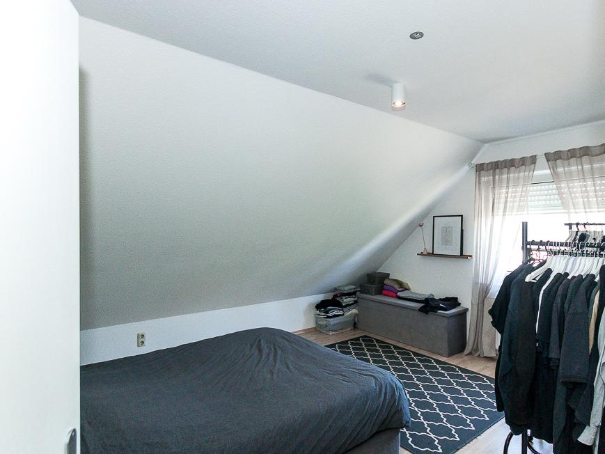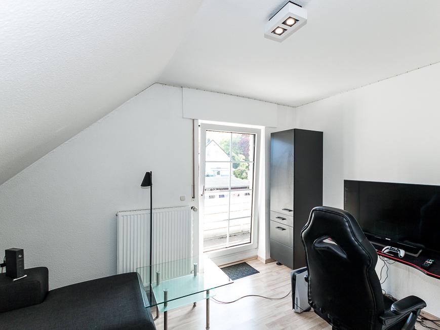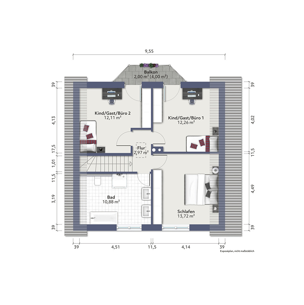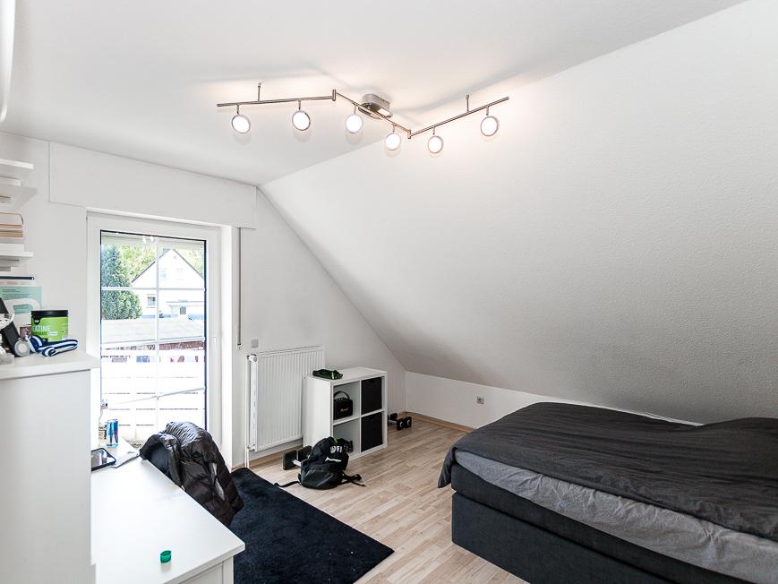 Im Dachgeschoss befinden sich drei Schlafzimmer, die sich in Größe (etwa 12 bis rund 14 m²) und Schnitt ähneln – ideal für Familien, in denen die Zimmervergabe keine Diskussion auslösen soll. Zwei Zimmer bieten Zugang zum Balkon mit Blick über den Garten. Alternativ lassen sich in den zuvor genannten Räumen auch Ihre Gäste oder ein Büro unterbringen. Das Familienbad mit Fenster, Wanne, Dusche und zwei Waschtischen ist großzügig, hell und funktional.